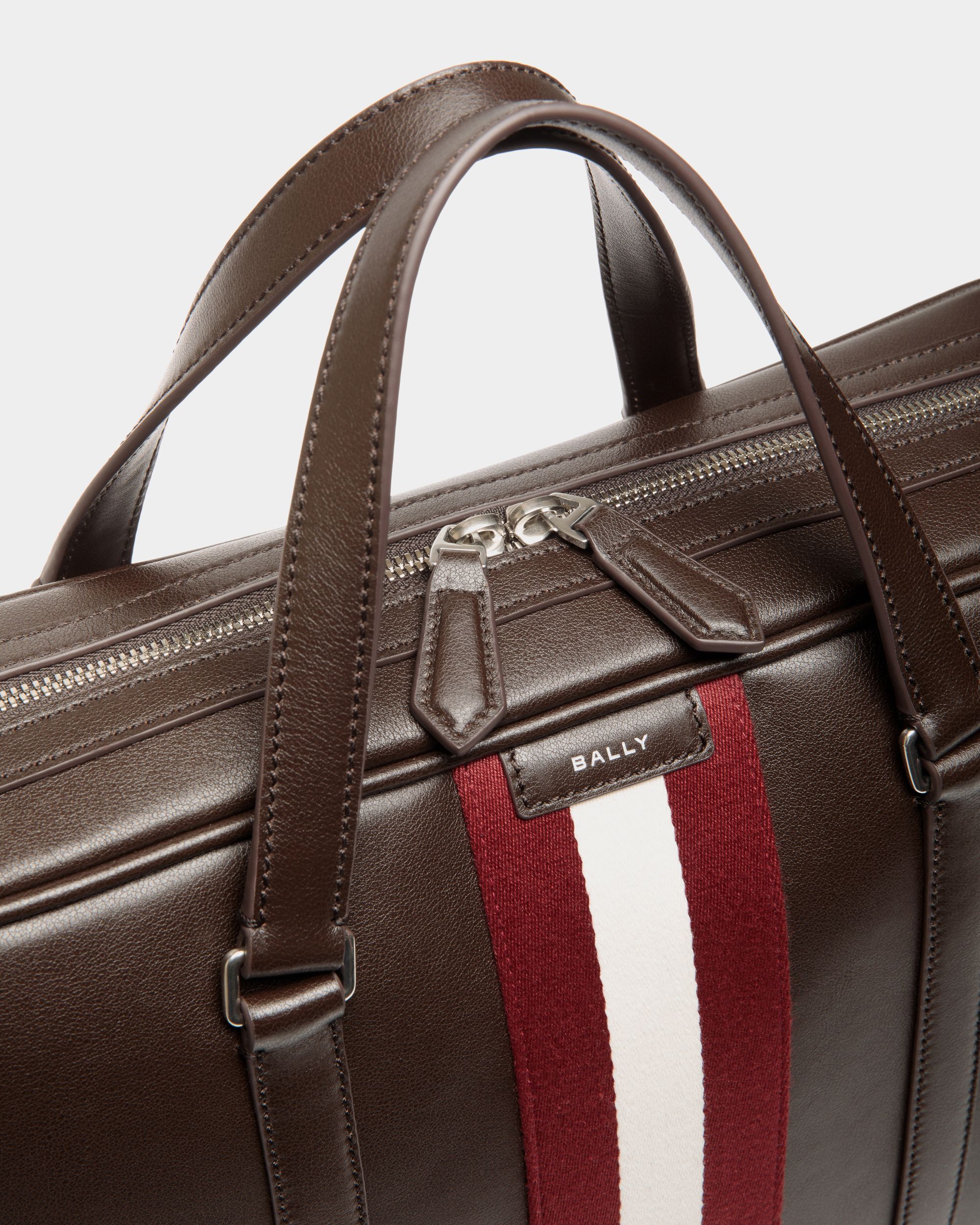 This essential Code briefcase is crafted from Ebano calfskin with a subtle grain. A Bally Ribbon in red and white fabric is placed vertically on the center front.