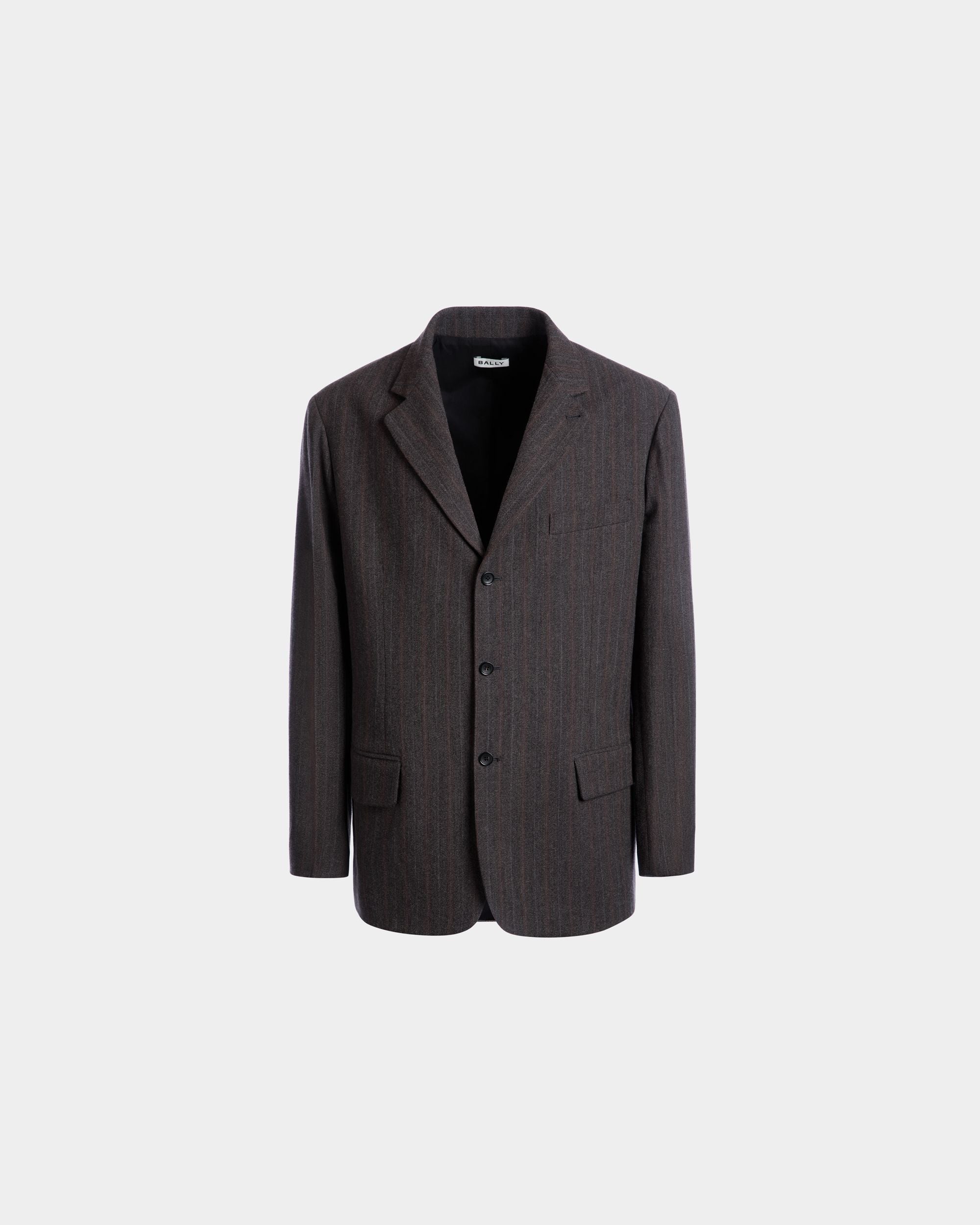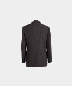 This notch-lapel blazer in a grey wool blend is characterized by a classic pinstripe motif.