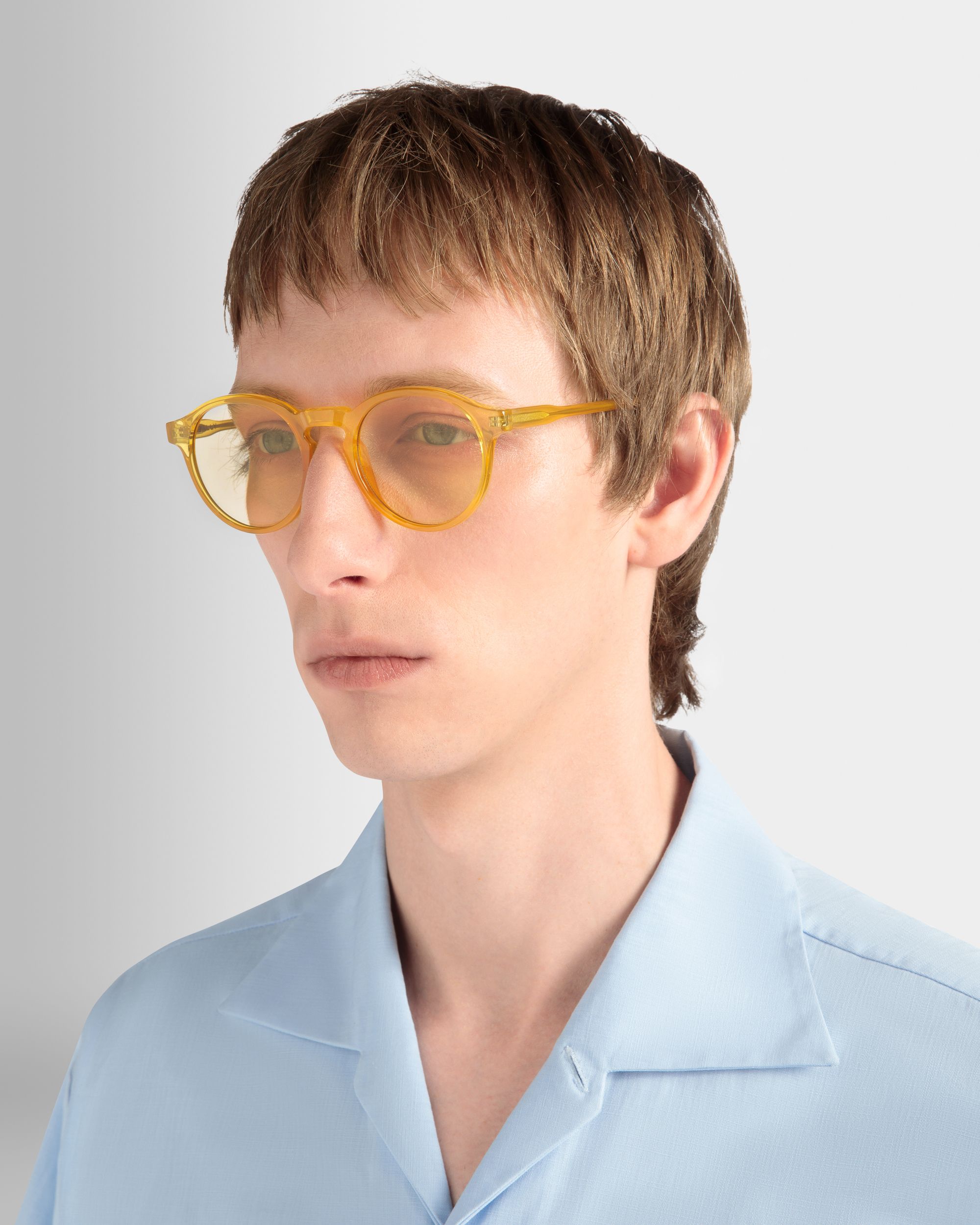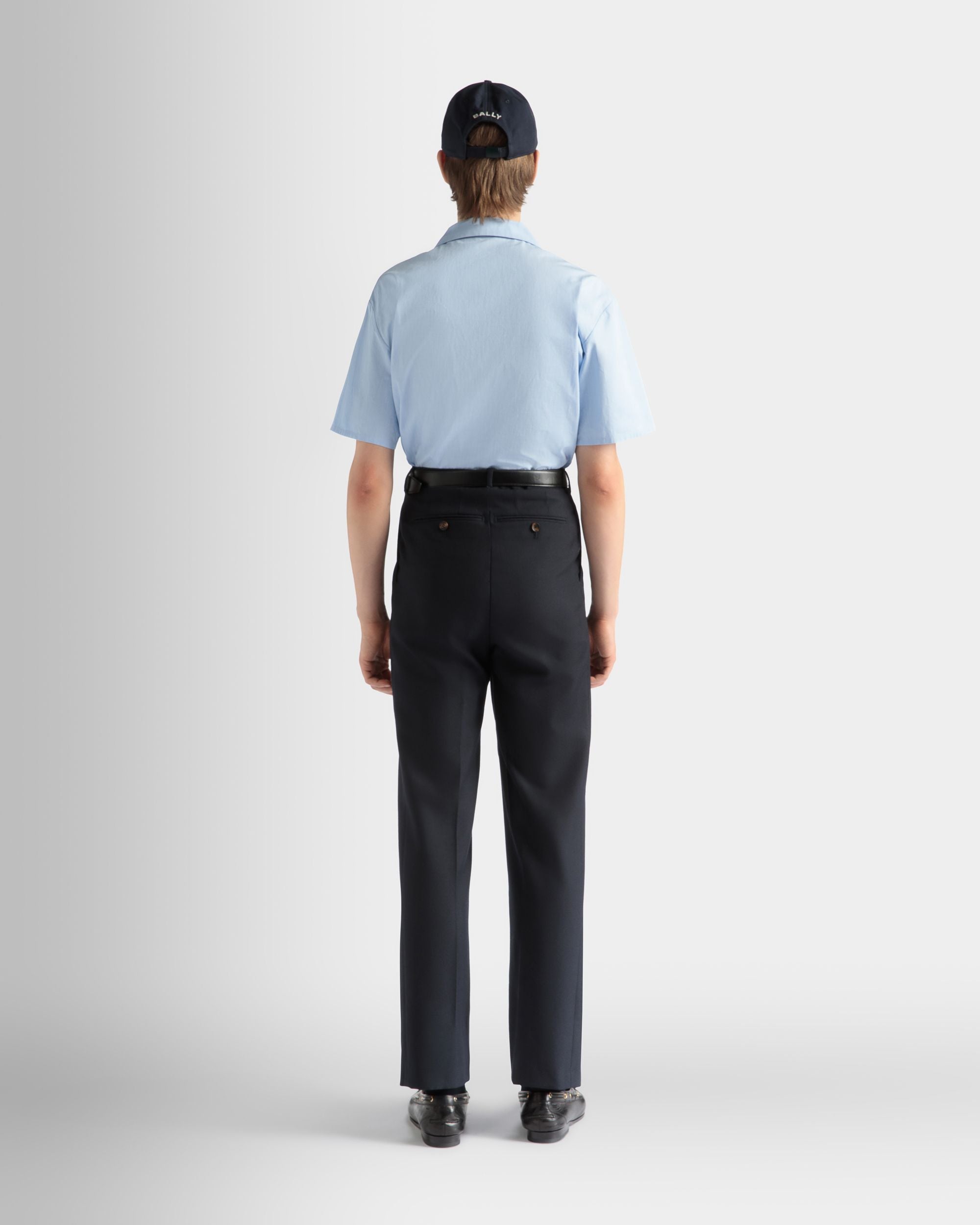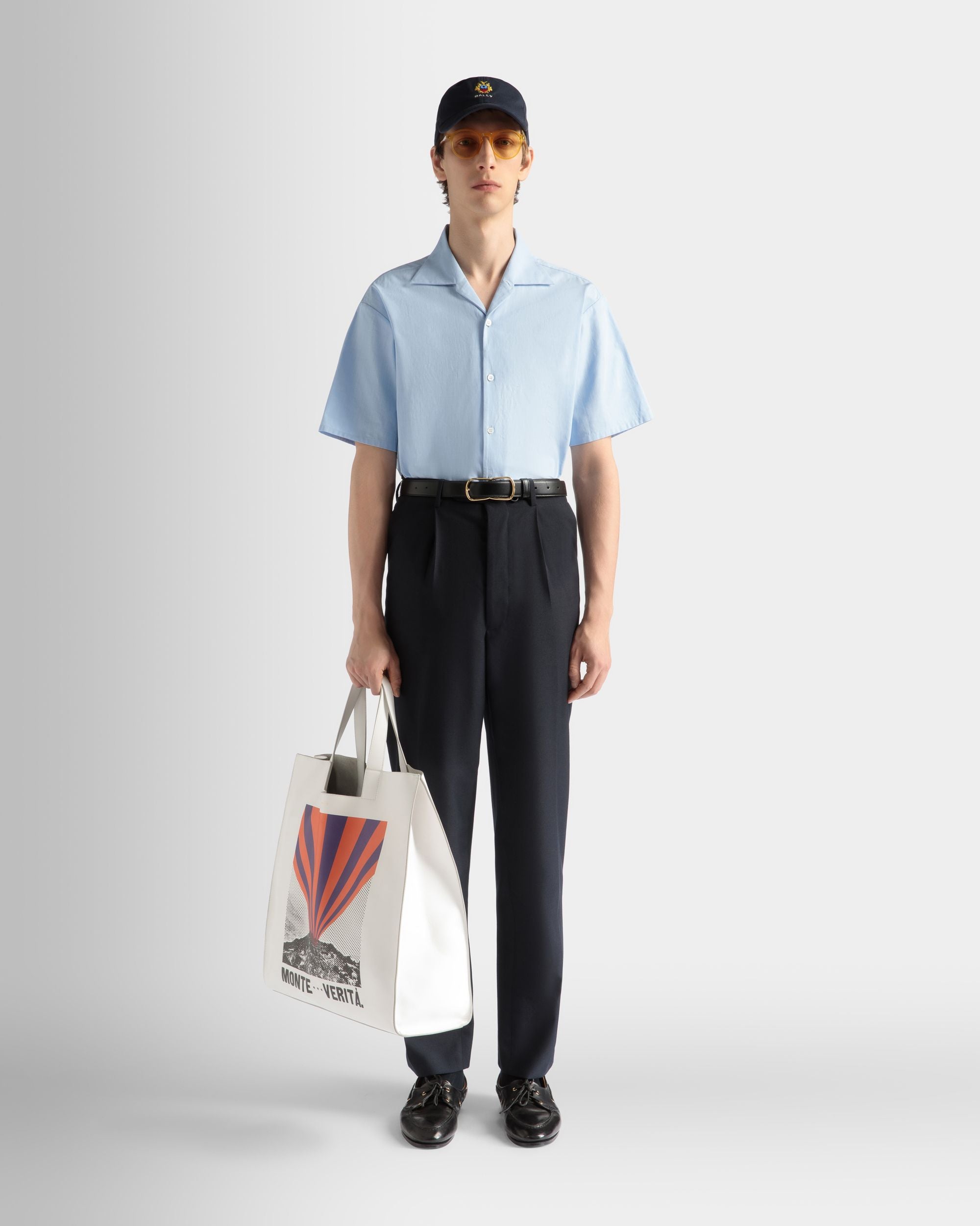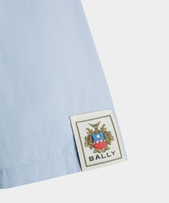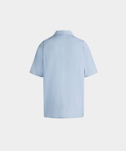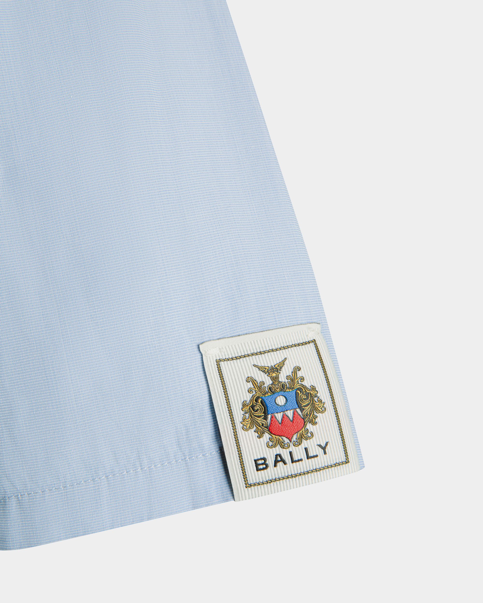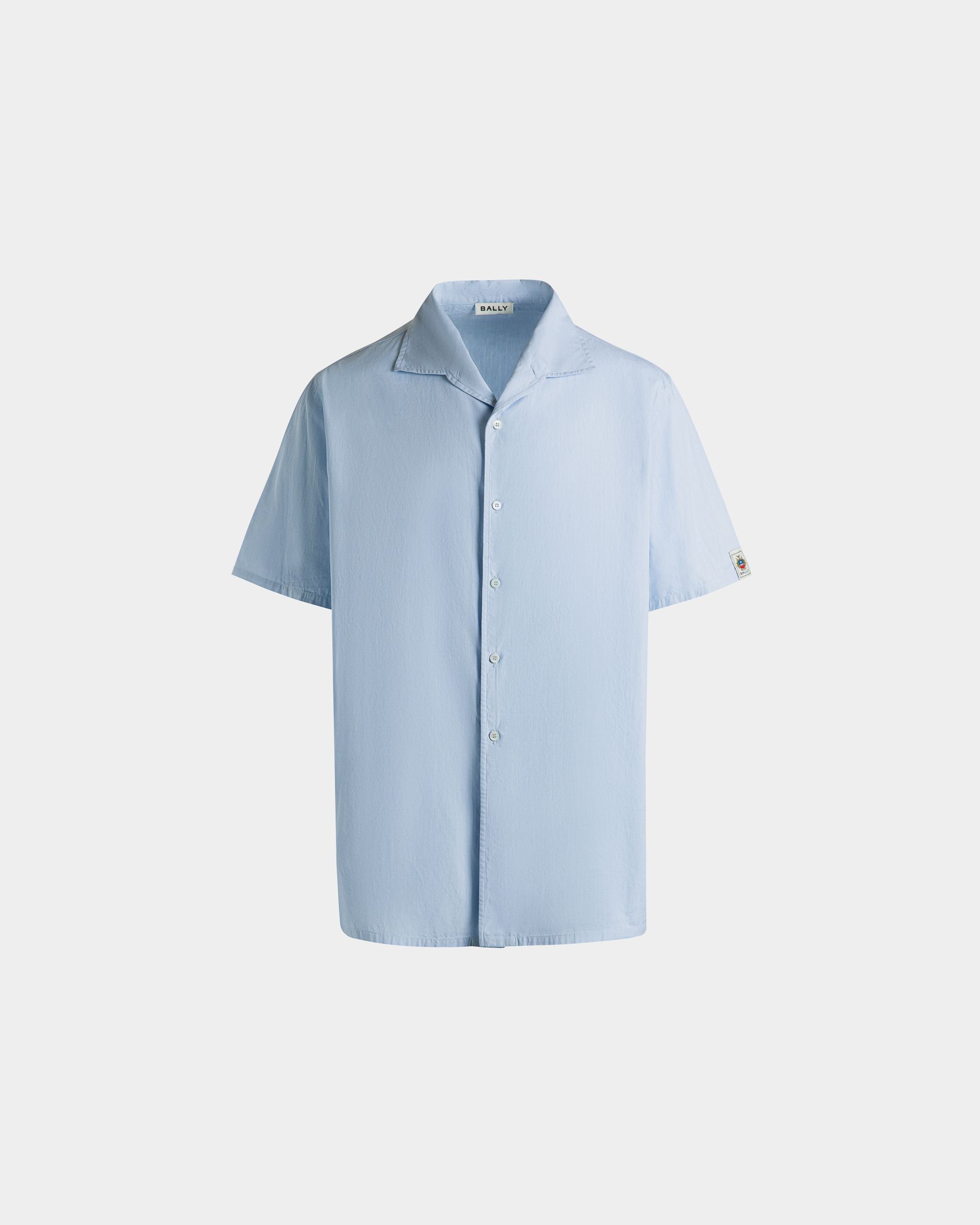 Light blue collared shirt in finest cotton. Just preppy enough, an embroidered Bally shield trims the left sleeve. Six buttons fasten the front.