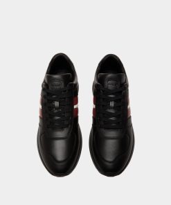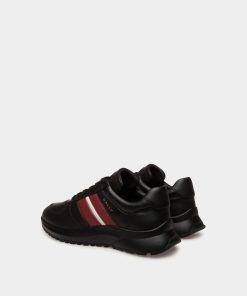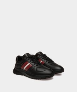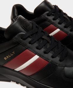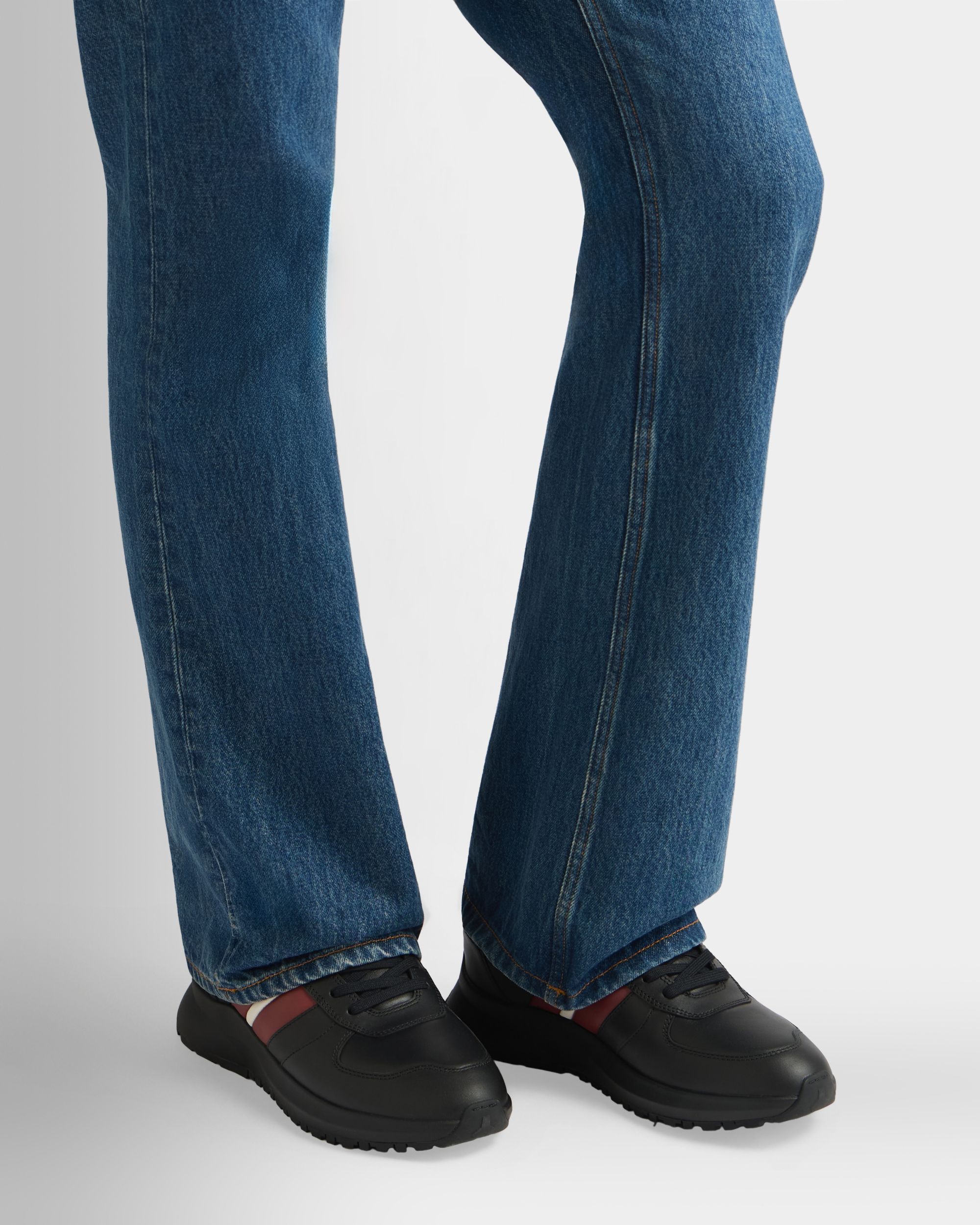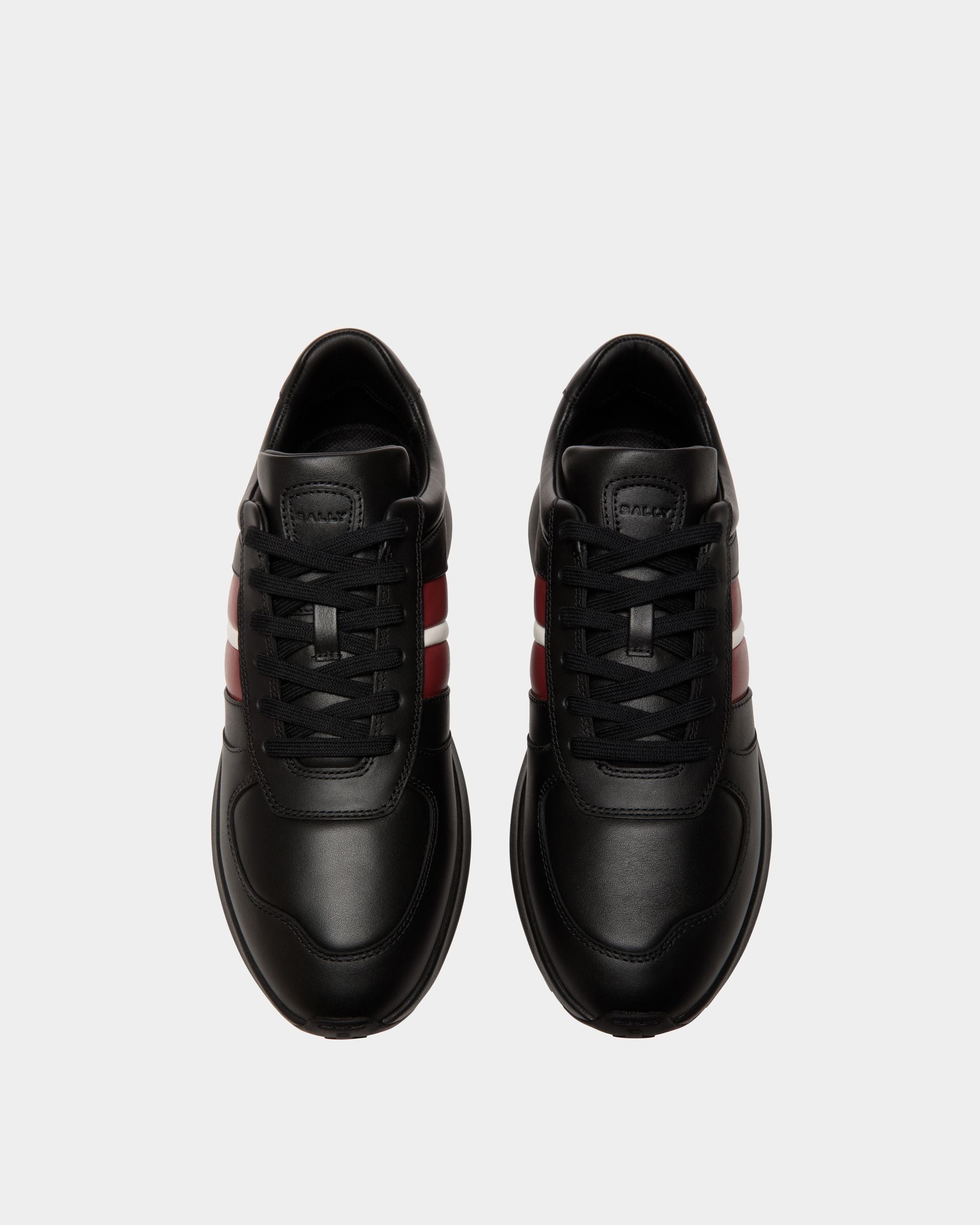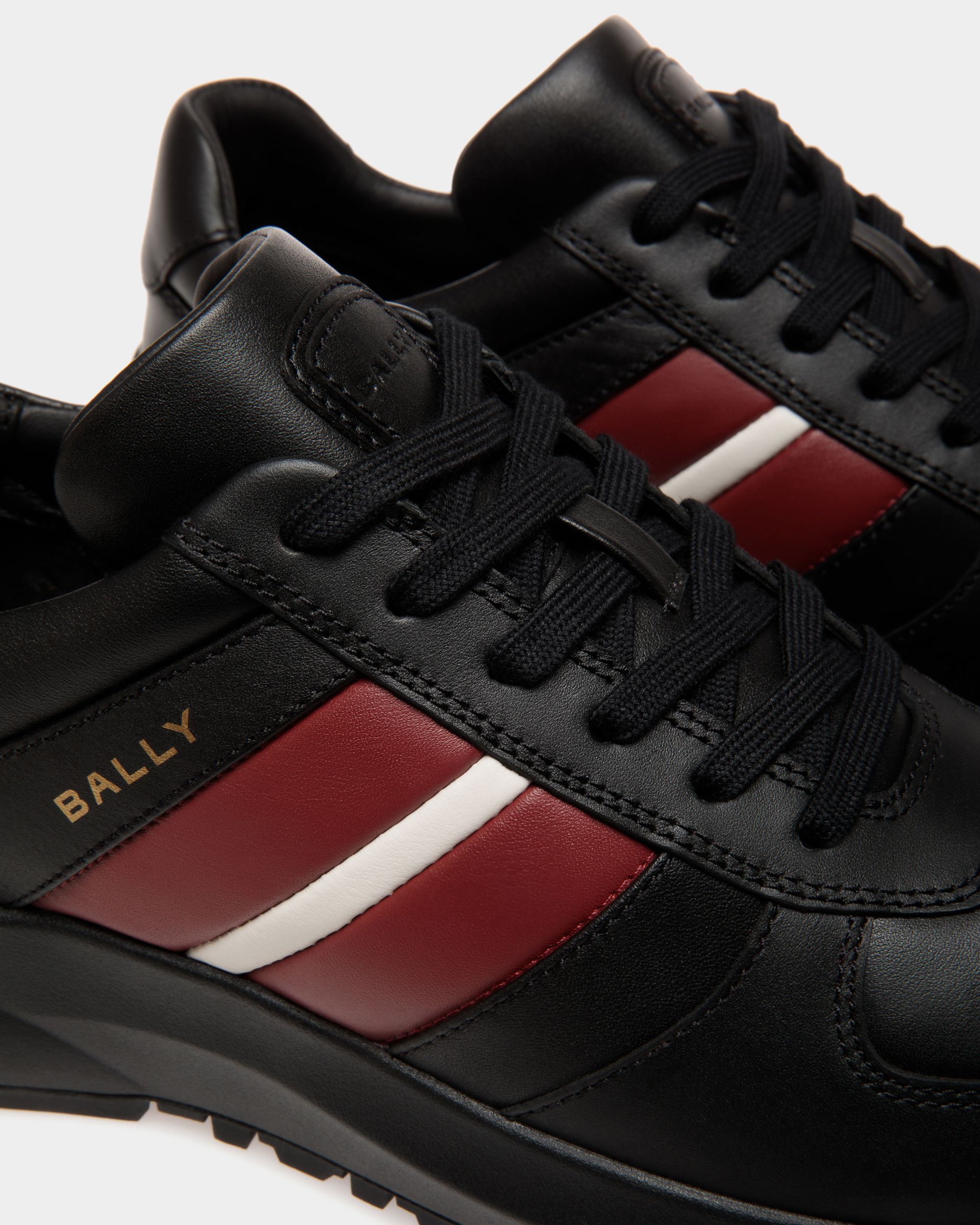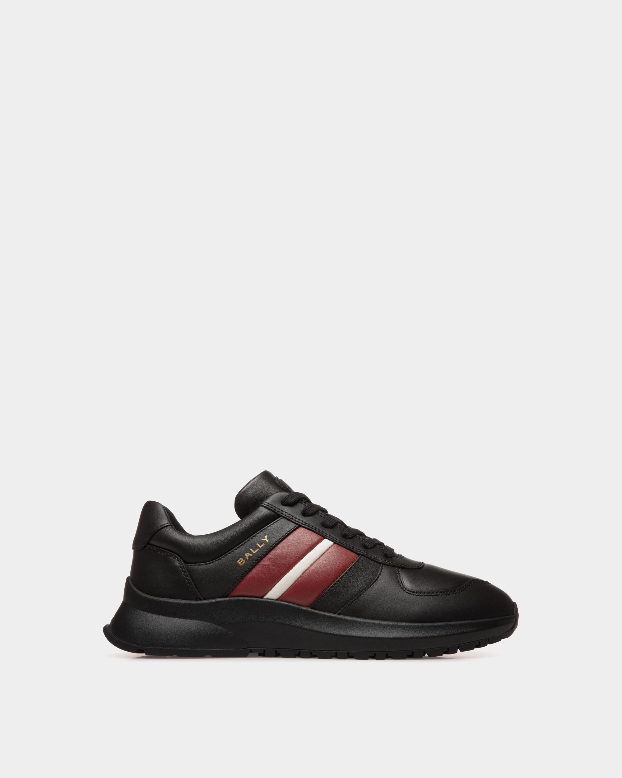 A sleek aesthetic defines this Outline sneaker in smooth black calfskin with a red and white Bally Ribbon at the side. The lightweight rubber sole in tonal black ensures grip on any terrain.