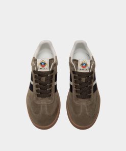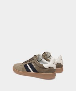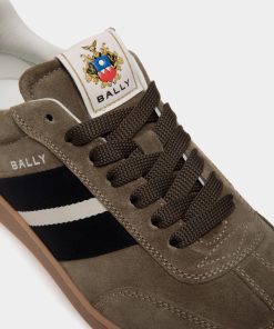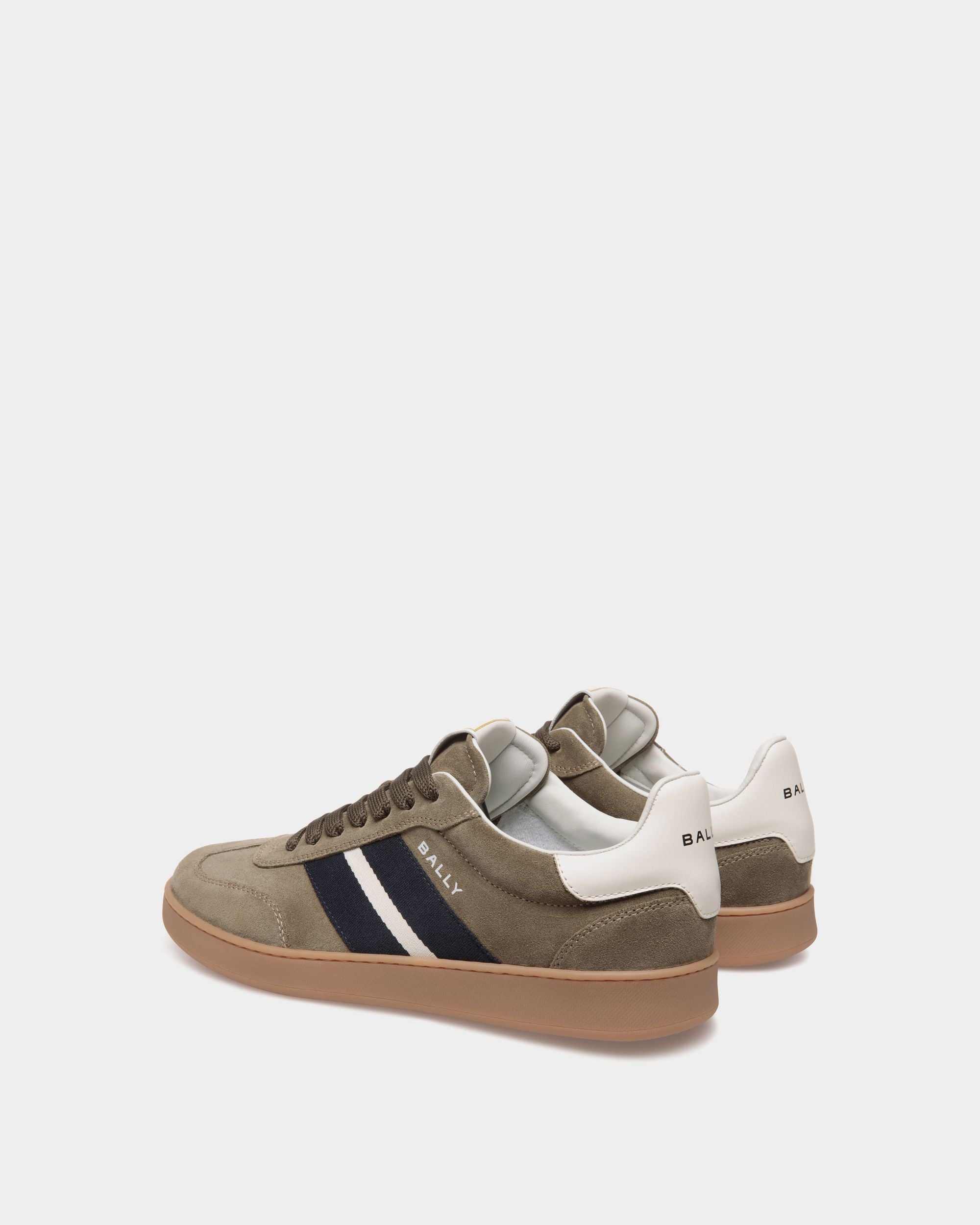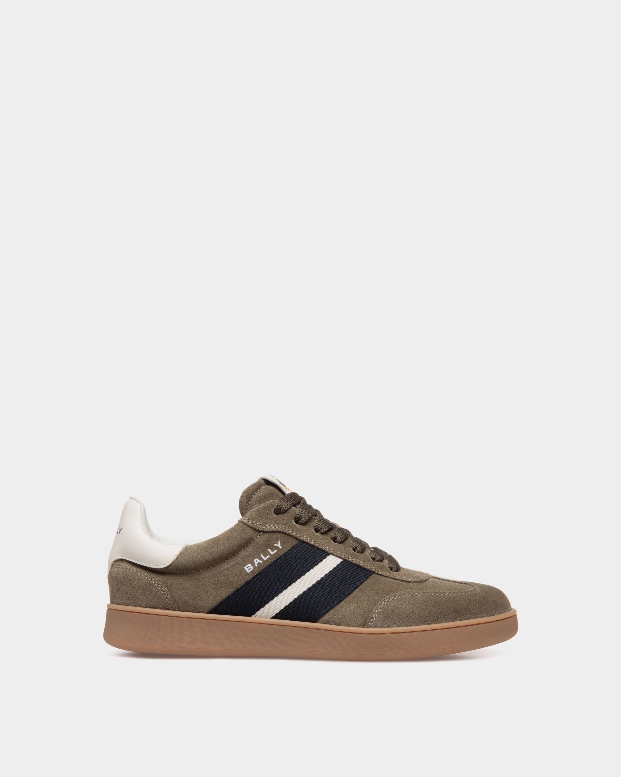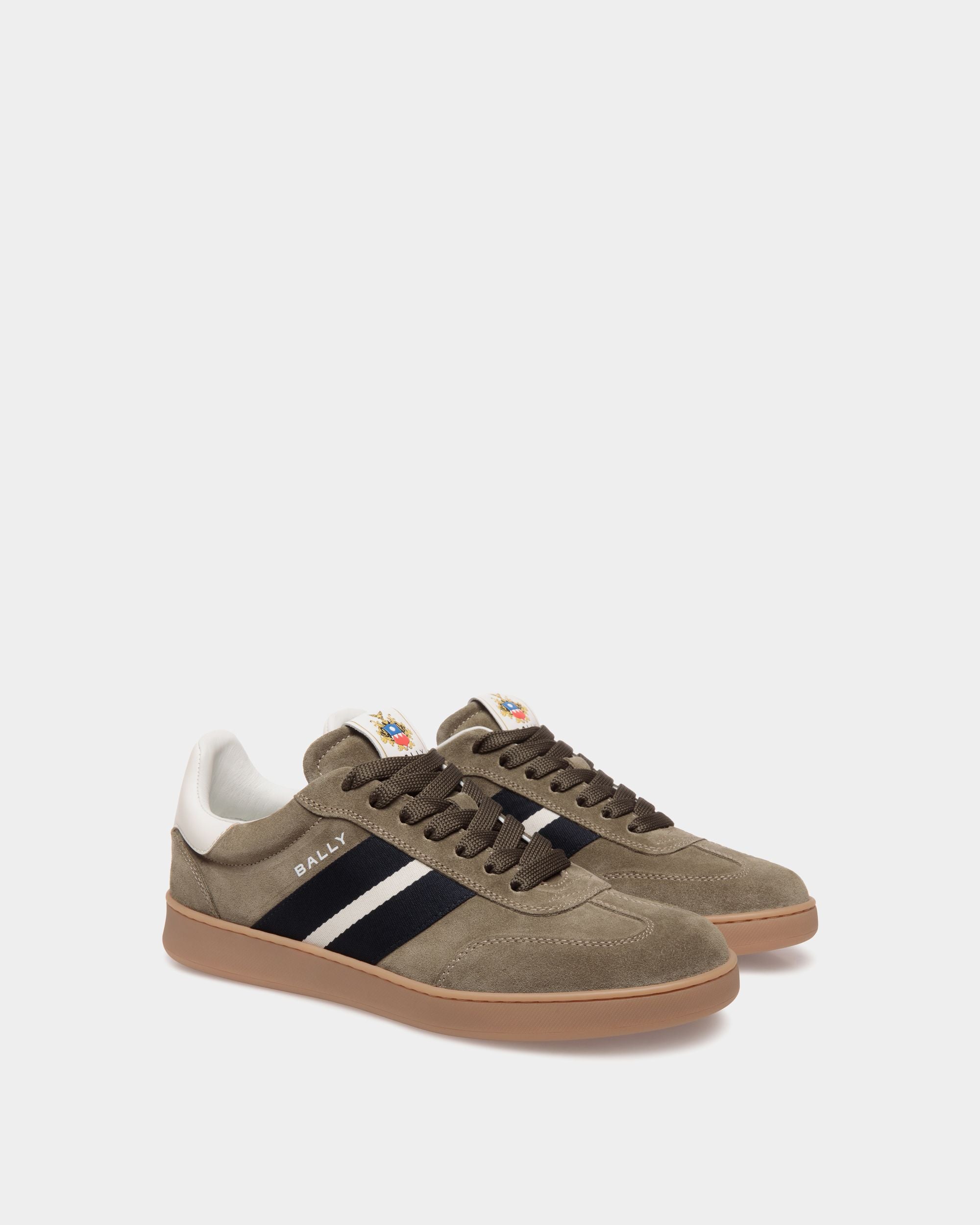 This Retro Crest sneaker in army green suede unites a classic tennis shoe silhouette and signature Bally signifiers. A black and white Ribbon is seen at the side, and a leather Bally Crest label trims the tongue of this lace-up style.