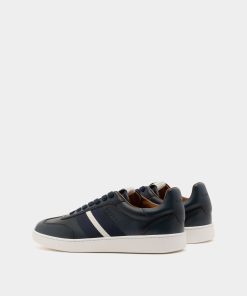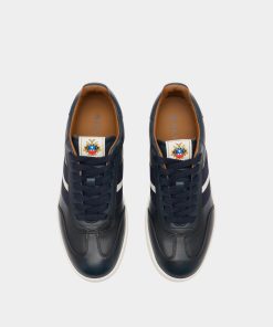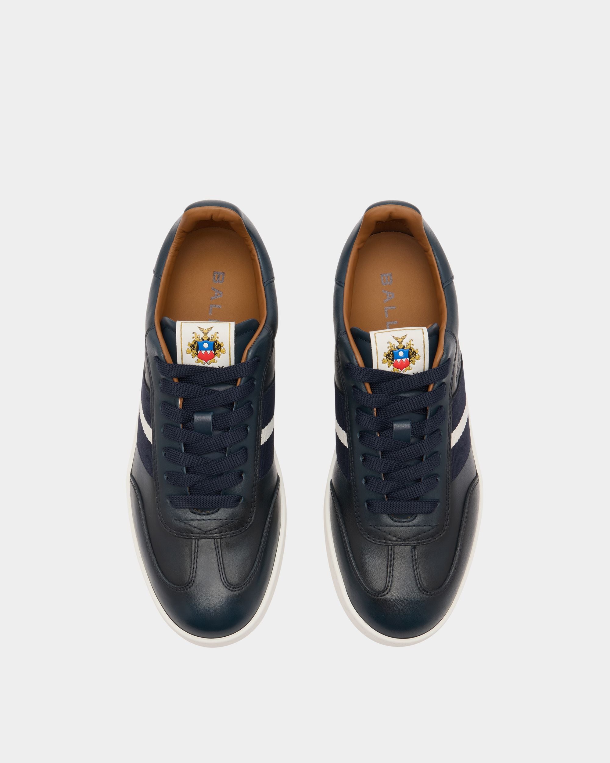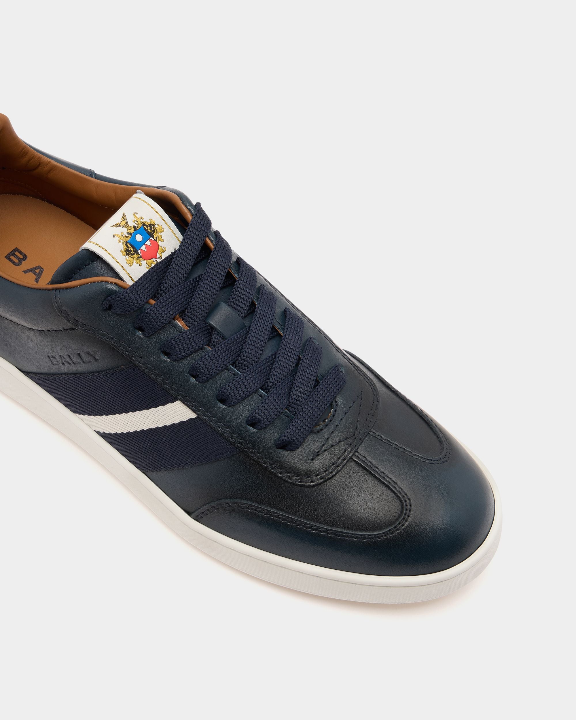 This Retro Crest sneaker in navy blue leather features a classic tennis shoe design enriched by Bally’s sophisticated aesthetics. A Bally Ribbon in grosgrain extends across the side of the upper and a Crest label embellishes the tongue, creating an iconic note.