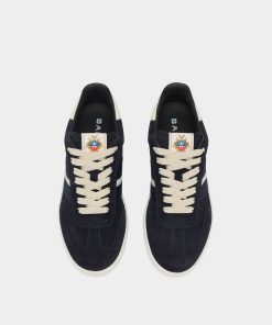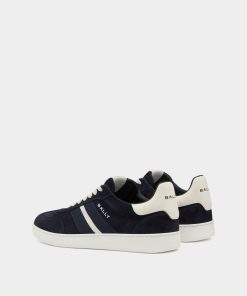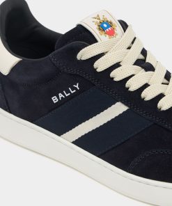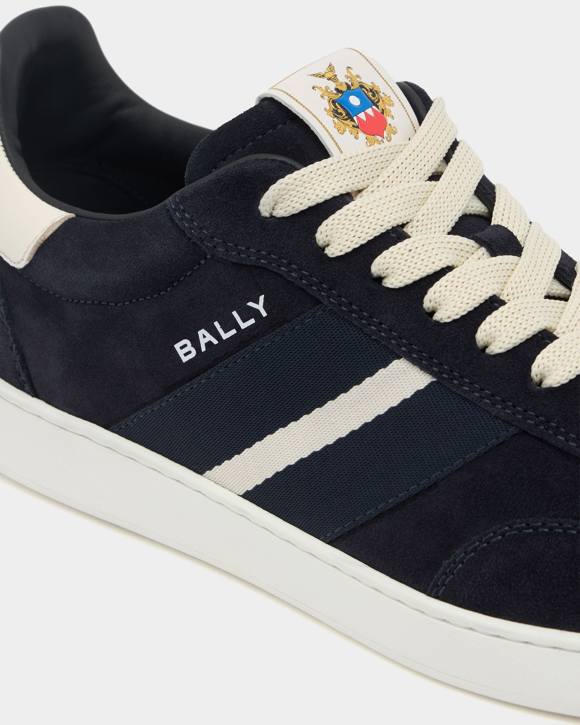 This Retro Crest sneaker in navy blue suede unites a classic tennis shoe silhouette and iconic Bally signifiers. A blue and white Ribbon is seen at the side, and a leather Bally Crest label trims the tongue of this lace-up style.