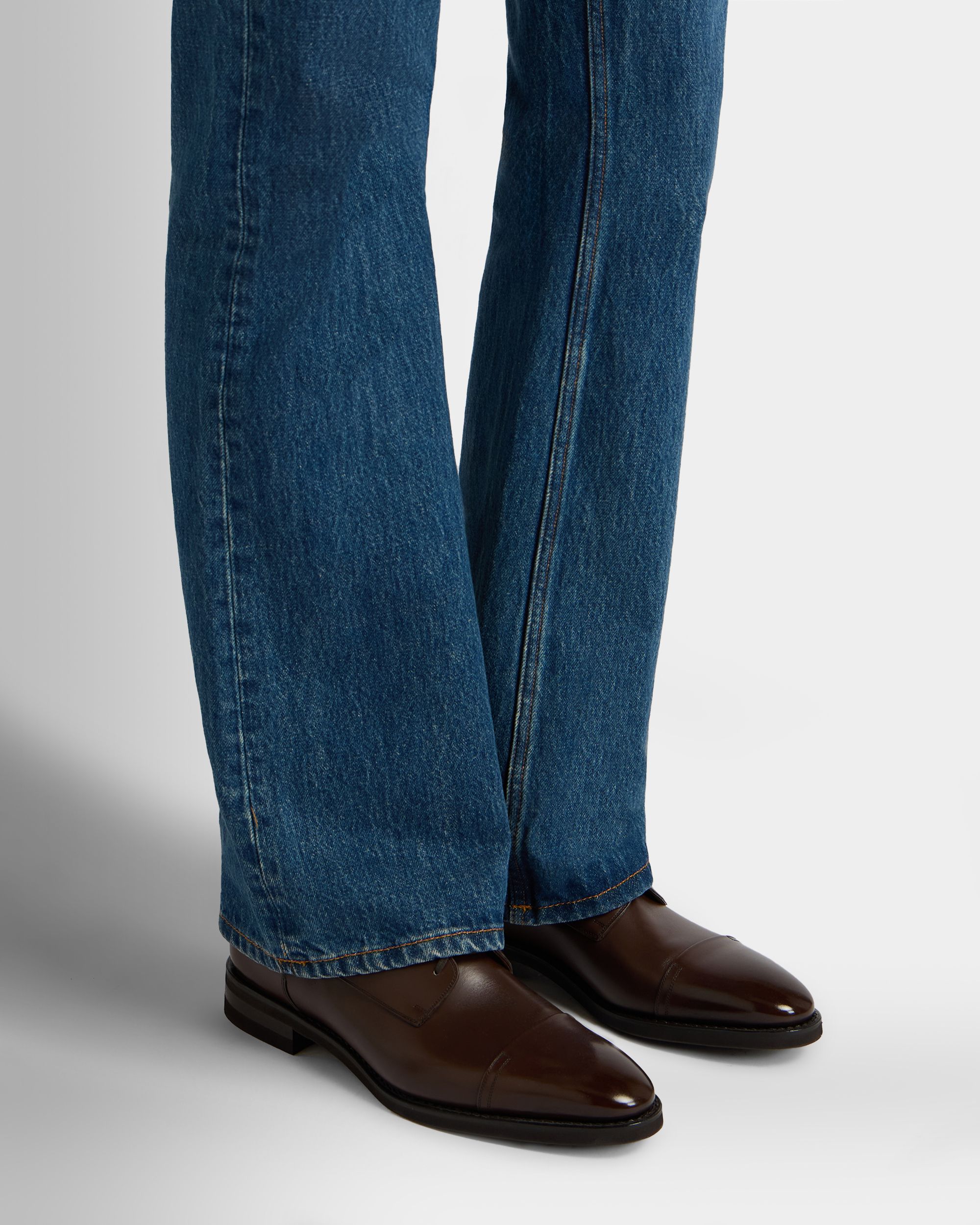 This Scribe Un derby is characterized by a classic silhouette in brown grained leather, hand polished on the toe and heel. Meticulous stitching – 9 stitches per centimeter – is just one of the over 200 steps required to craft this elegant lace-up style.