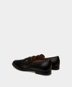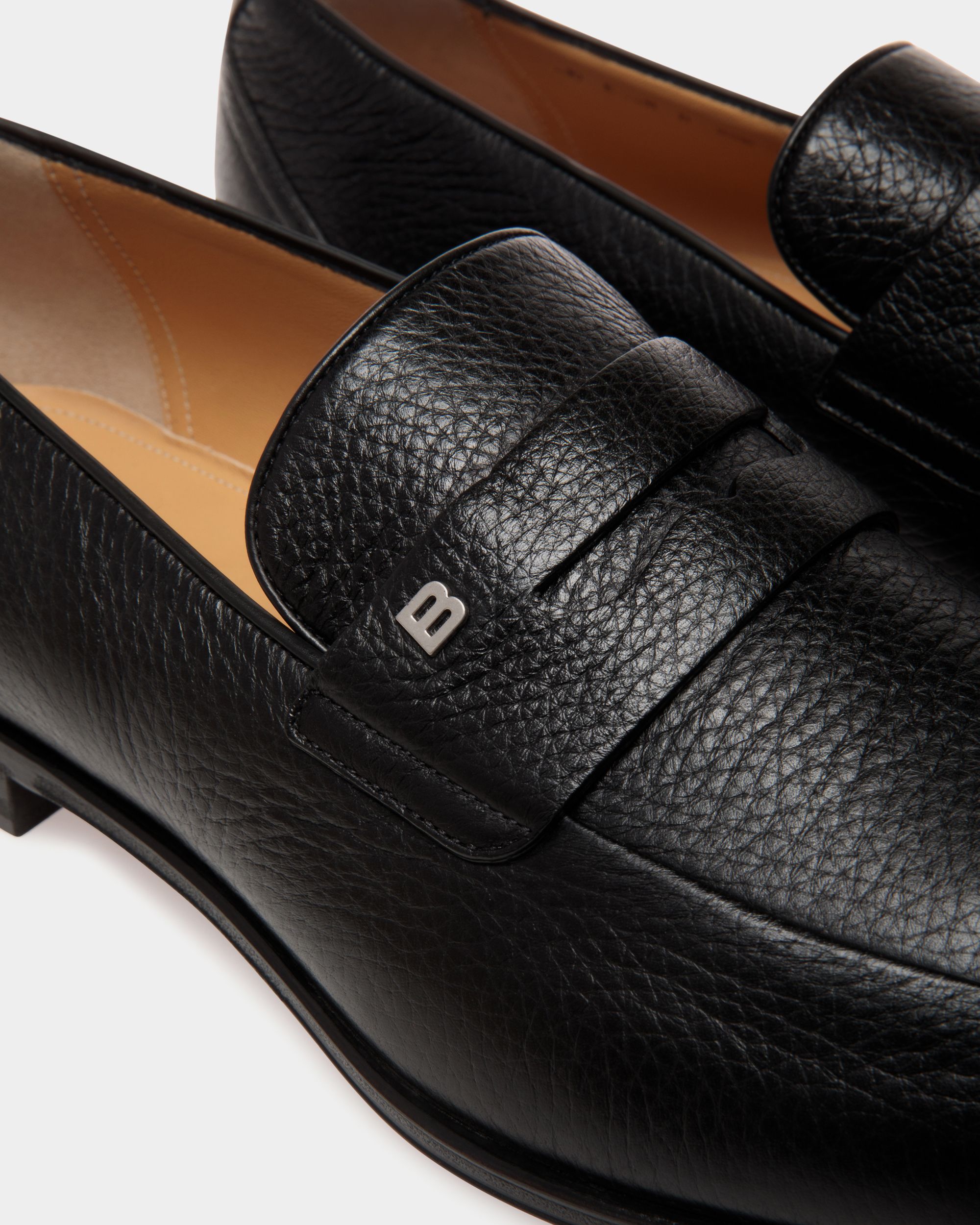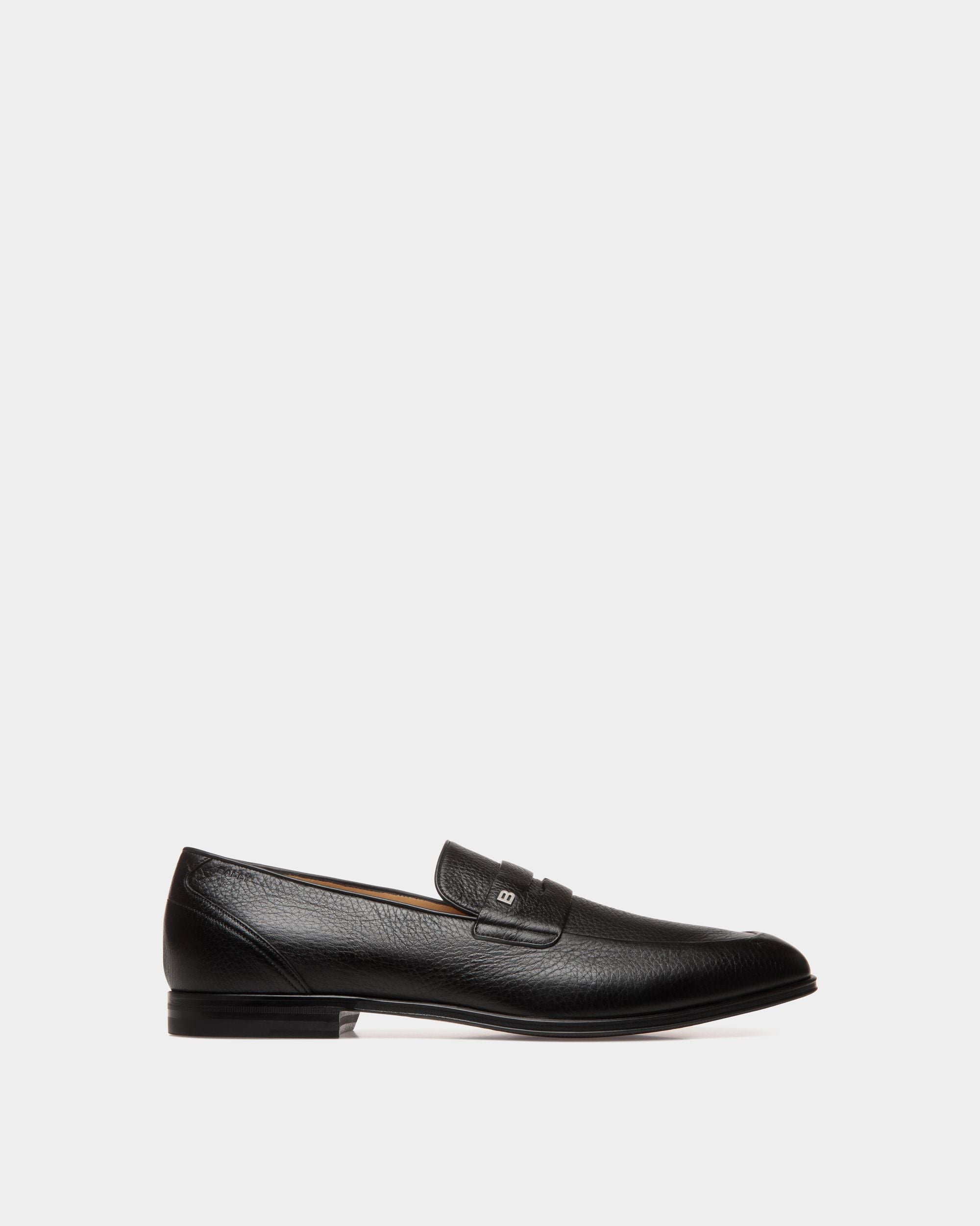 This almond-toe Westminster loafer in black deer leather is characterized by a grained finish, tonal stitching and a saddle strap across the top, embellished with a metal Bally B detail.