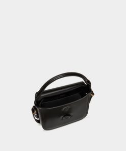 This Beckett minibag in black brushed leather is crafted into a compact silhouette with a flap closure. A top handle and an adjustable shoulder strap offer multiple portability options.