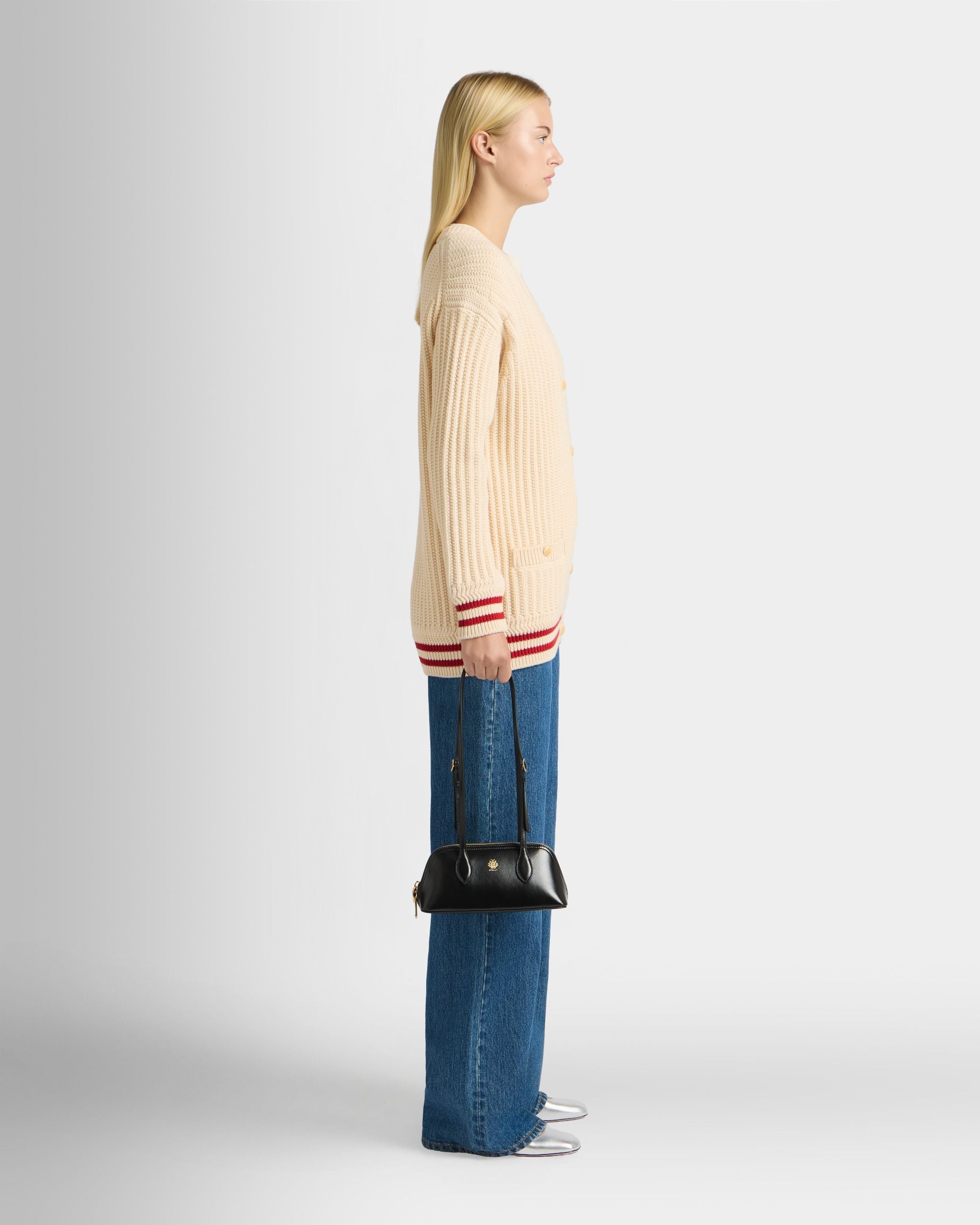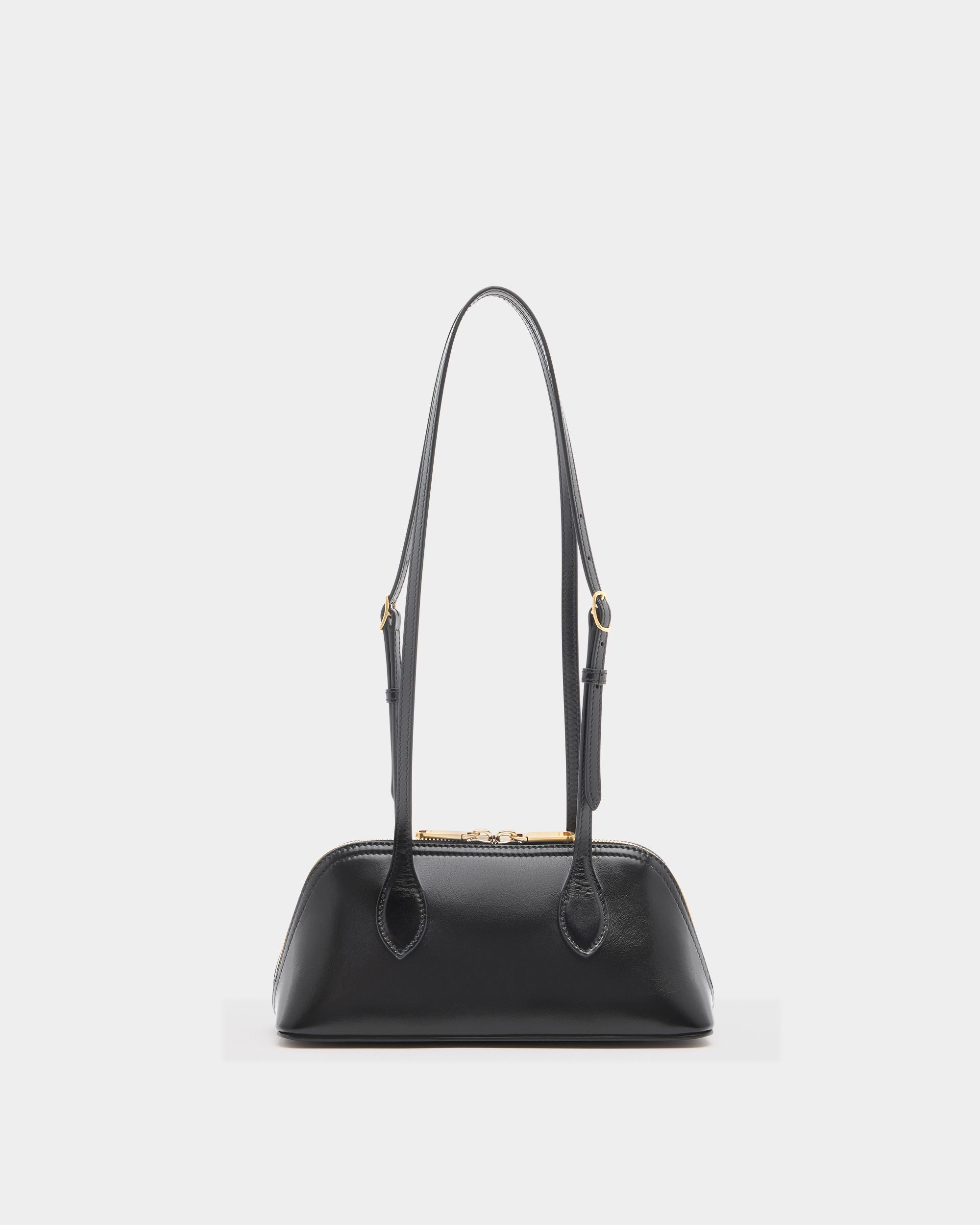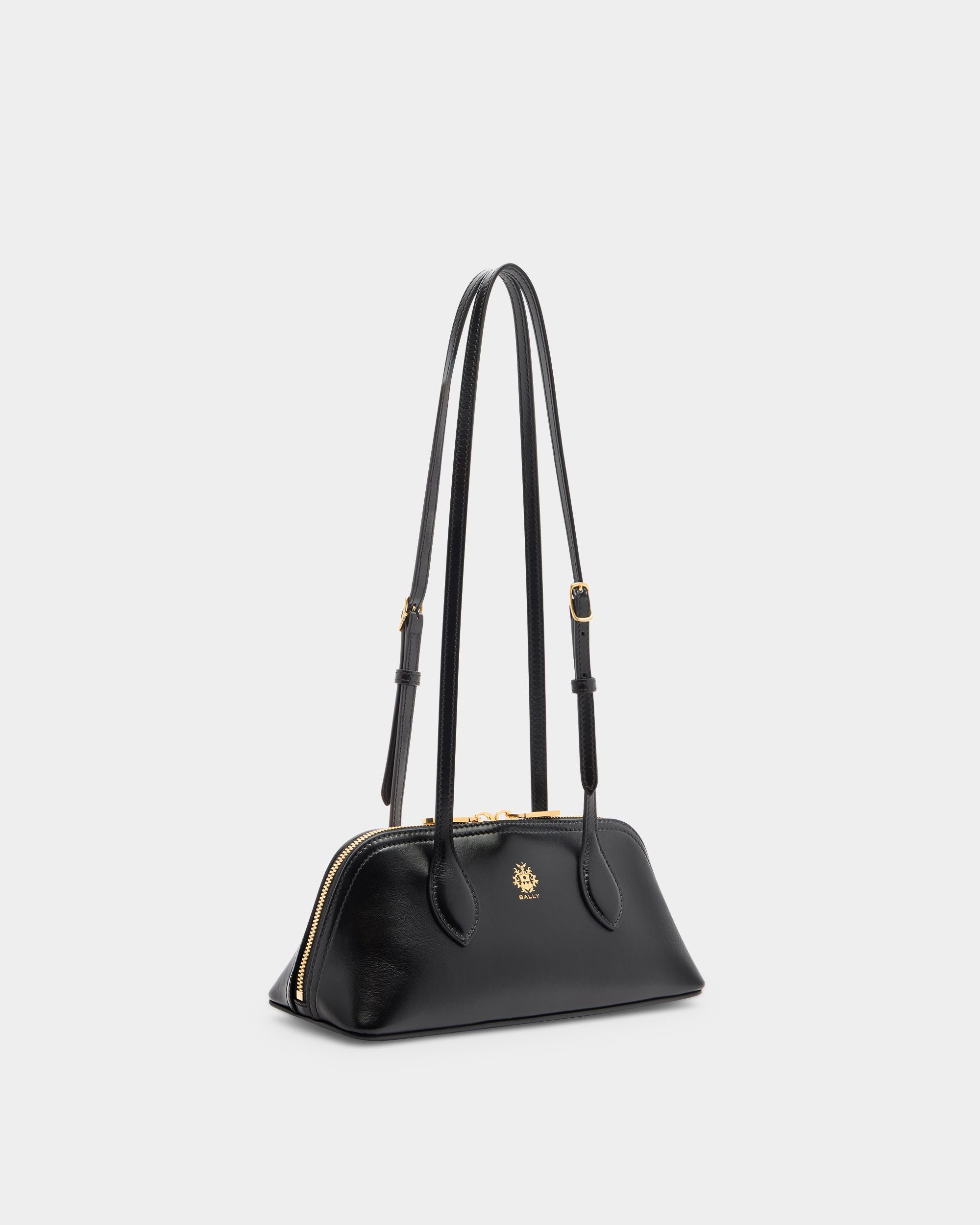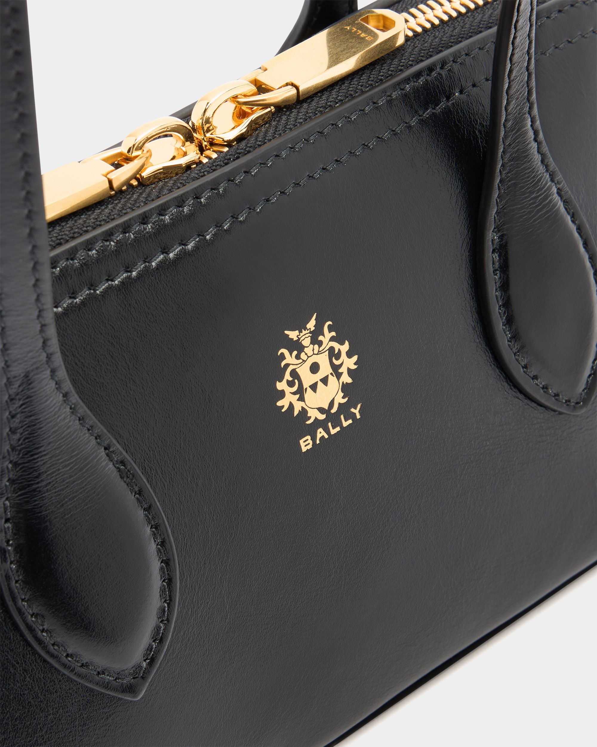 The Praline minibag in black leather features a compact trapezoid volume carried by two elongated top handles. A Bally Crest in gold-tone foil creates an iconic note.