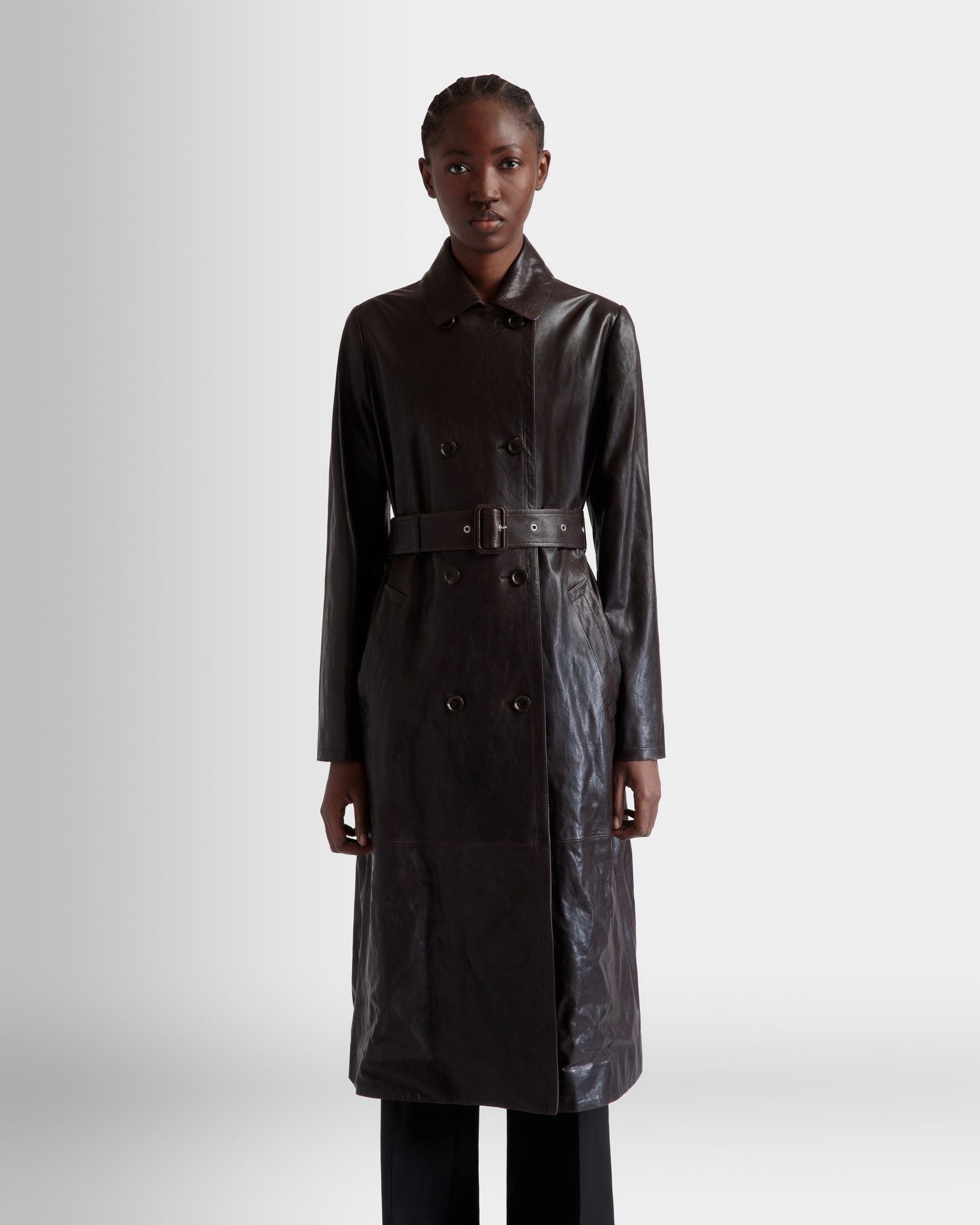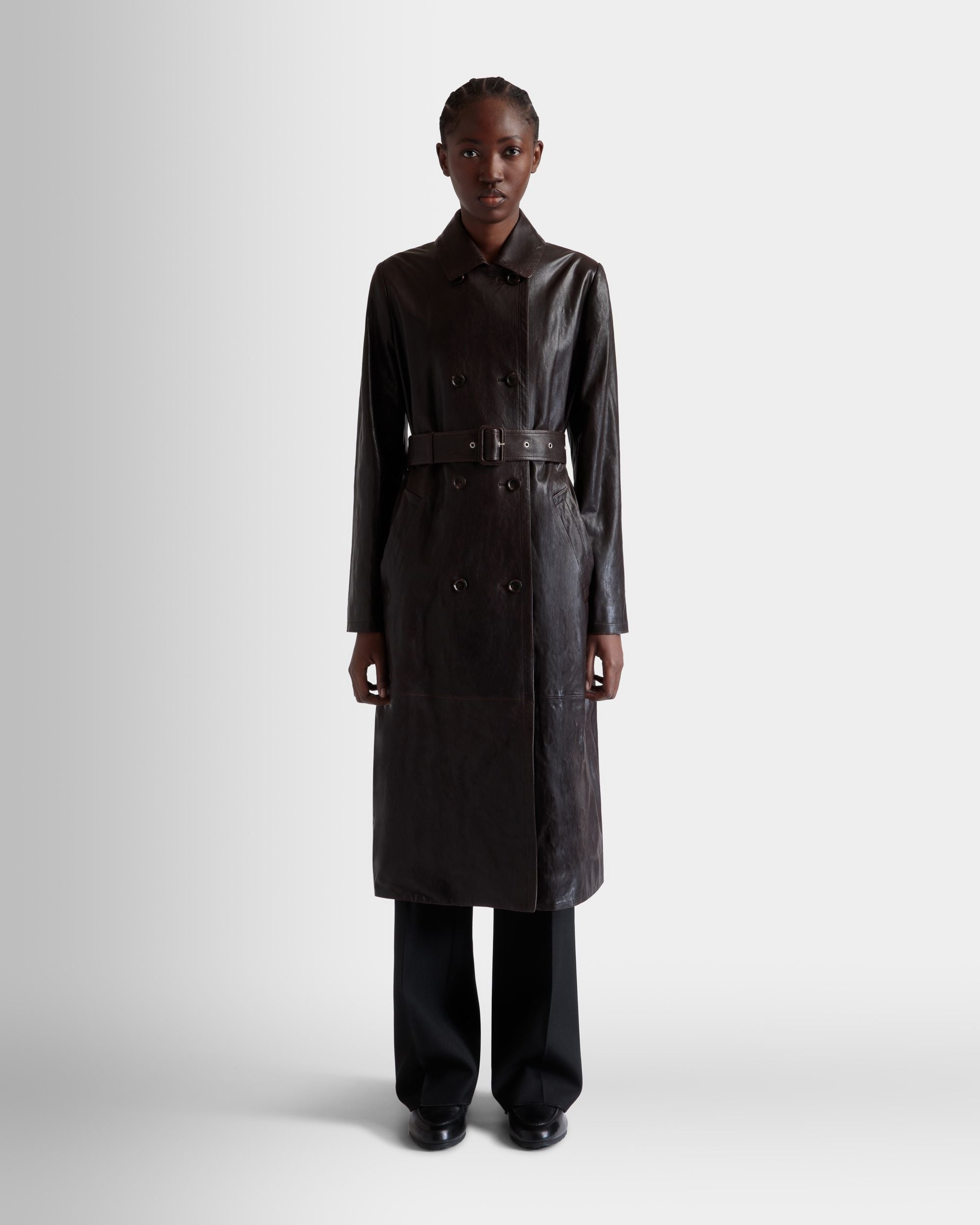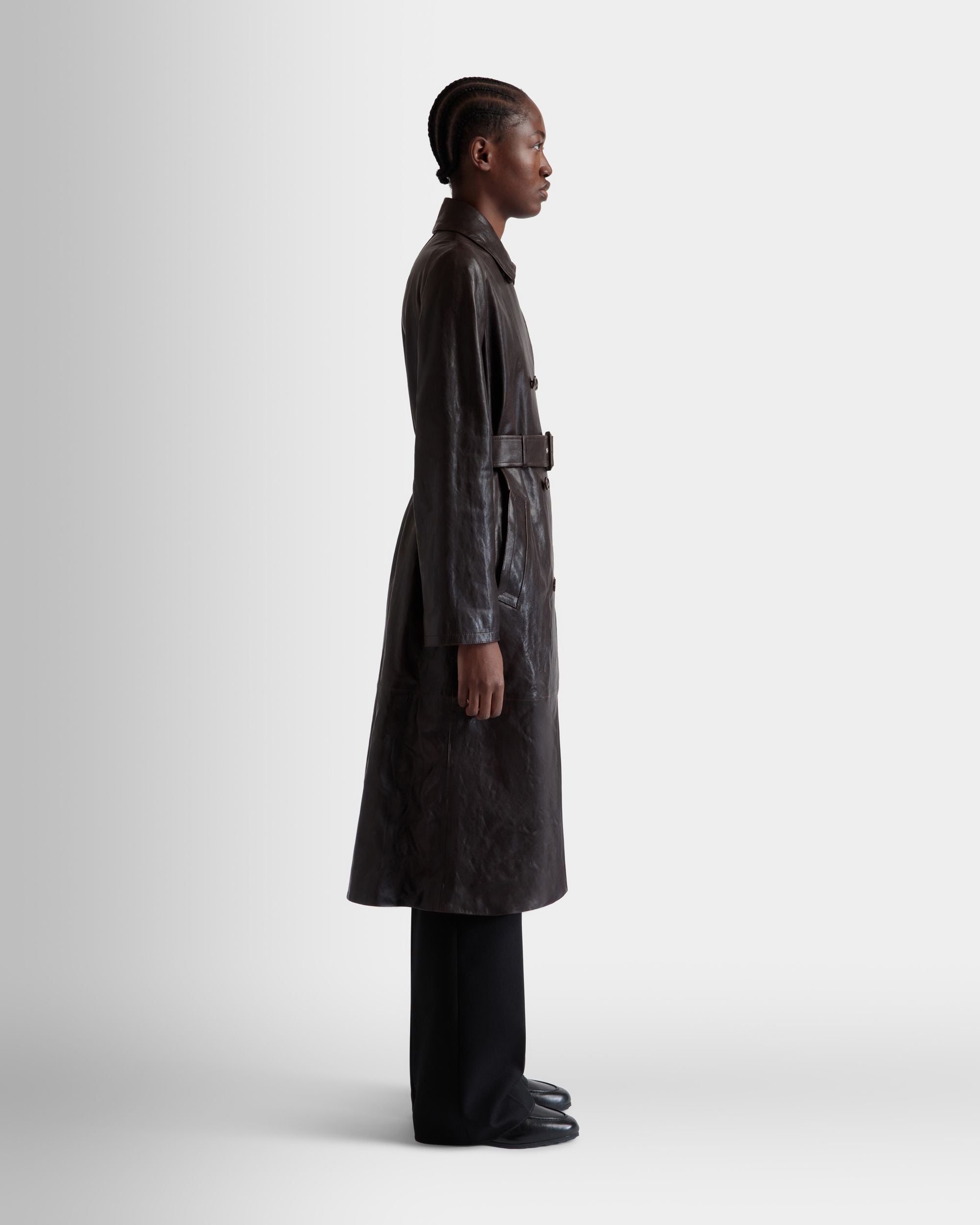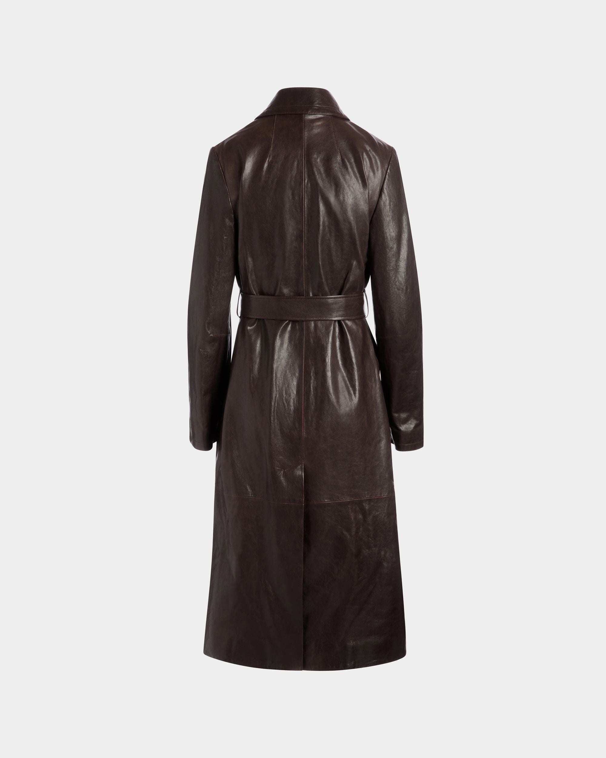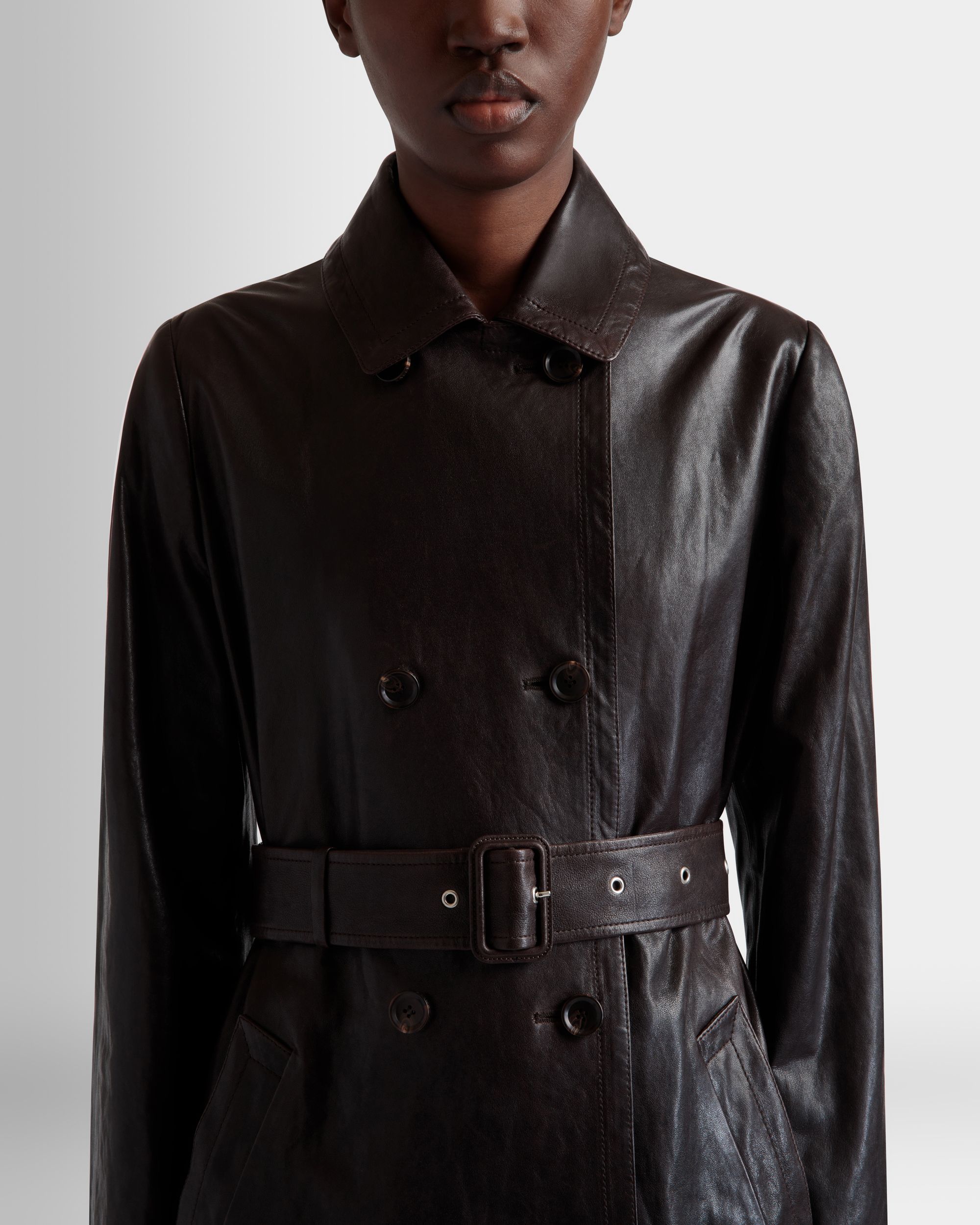 This double-breasted coat is designed in Ebano lambskin with a soft, supple handle. The front is fastened by horn-effect resin buttons and completed by a leather belt.