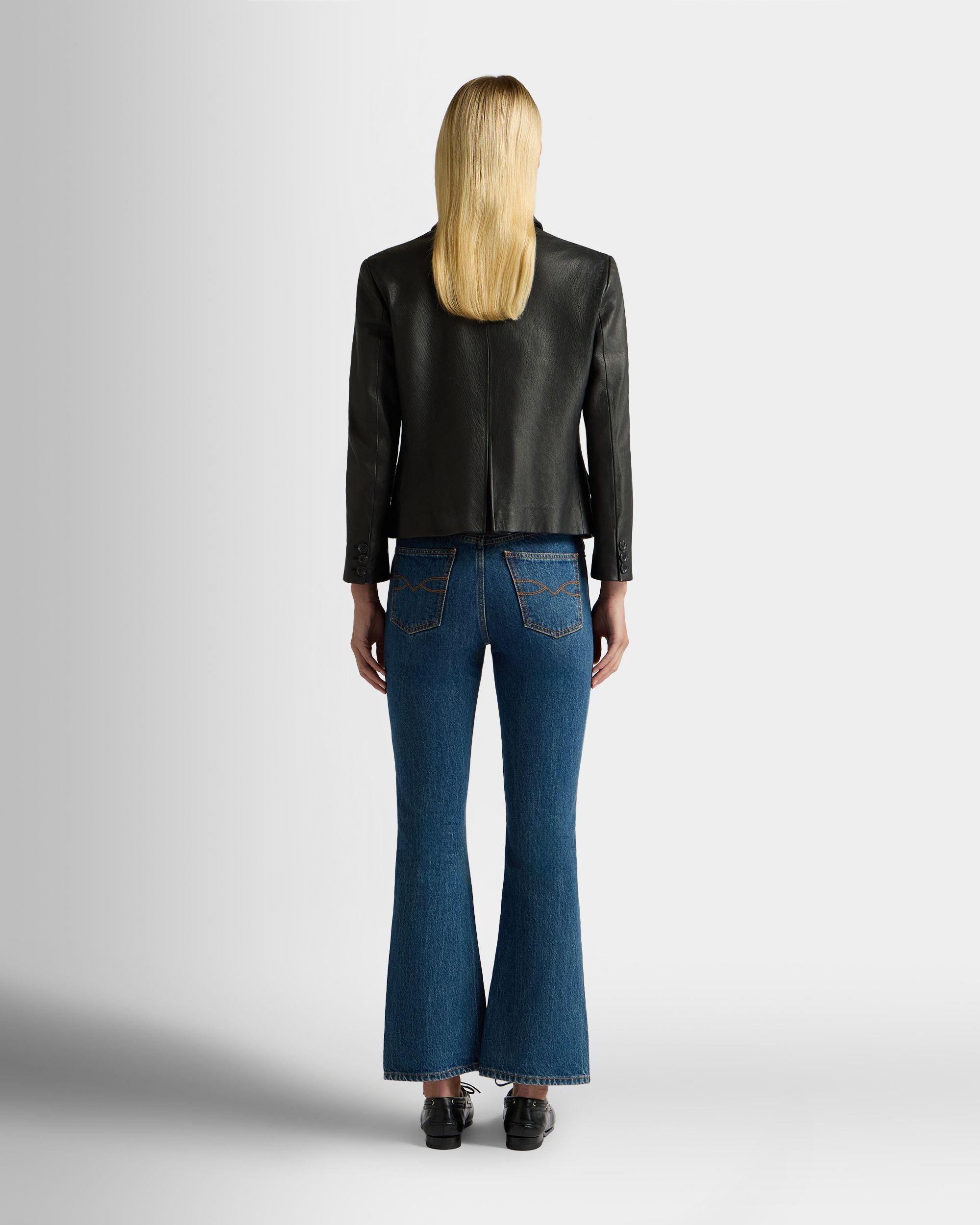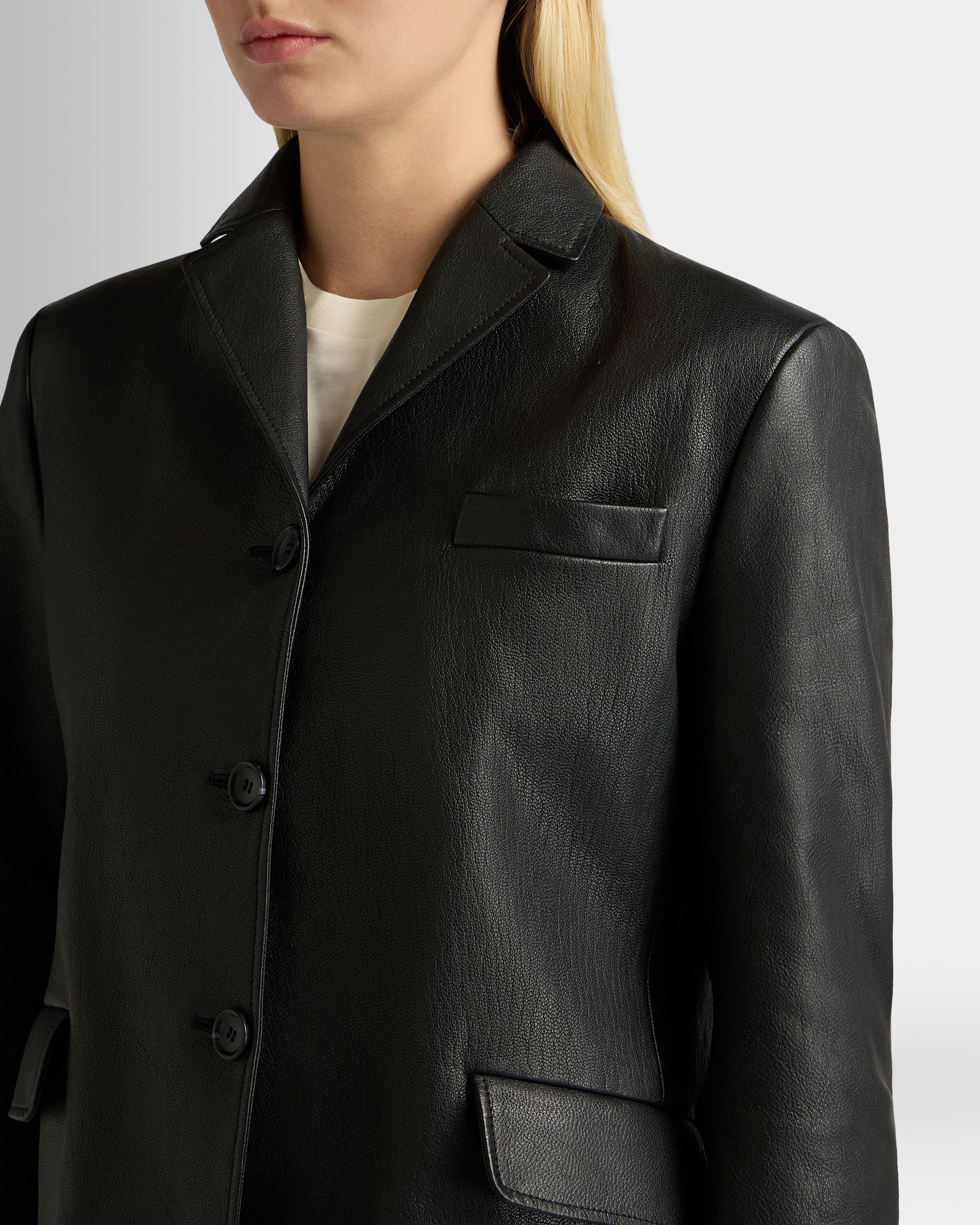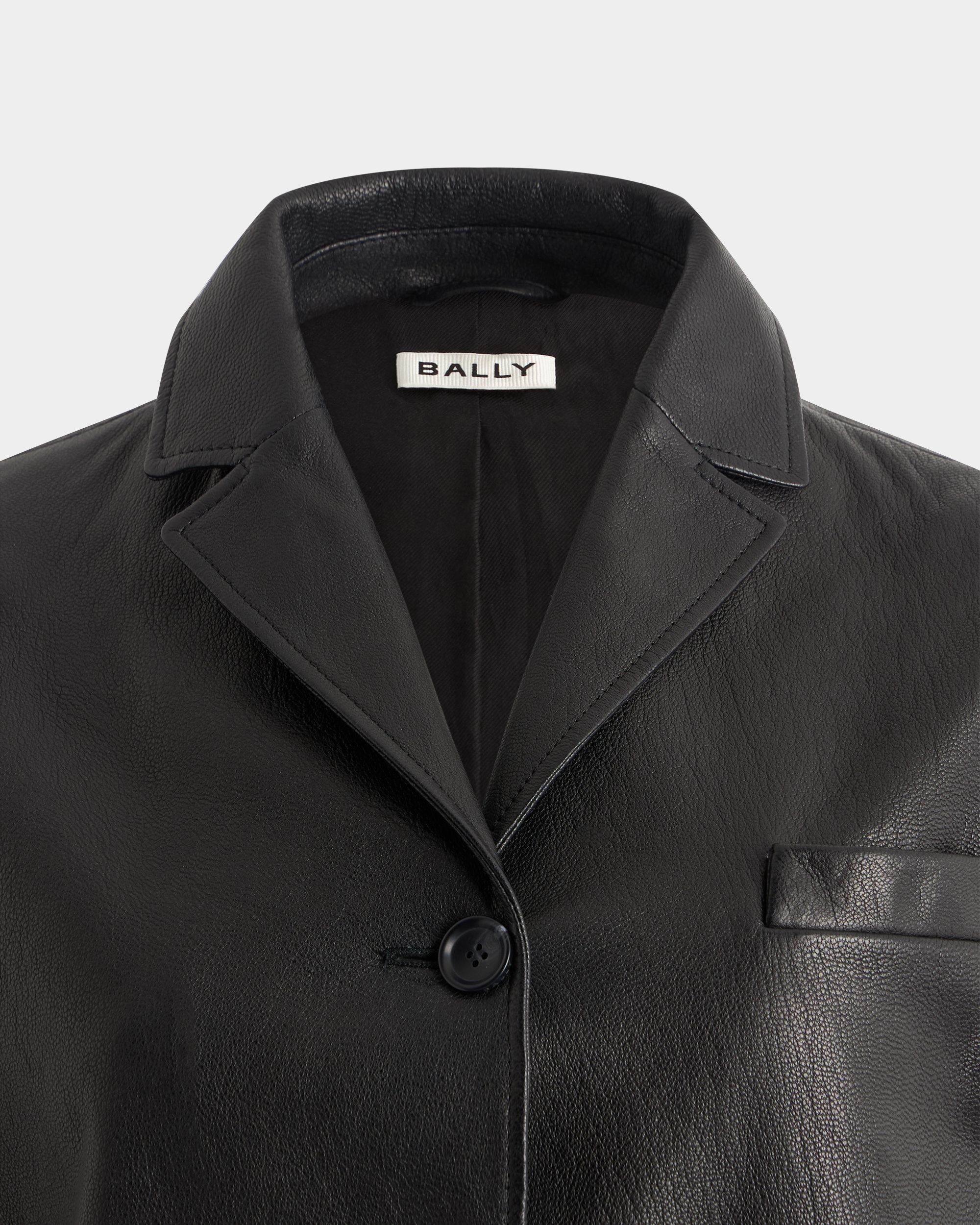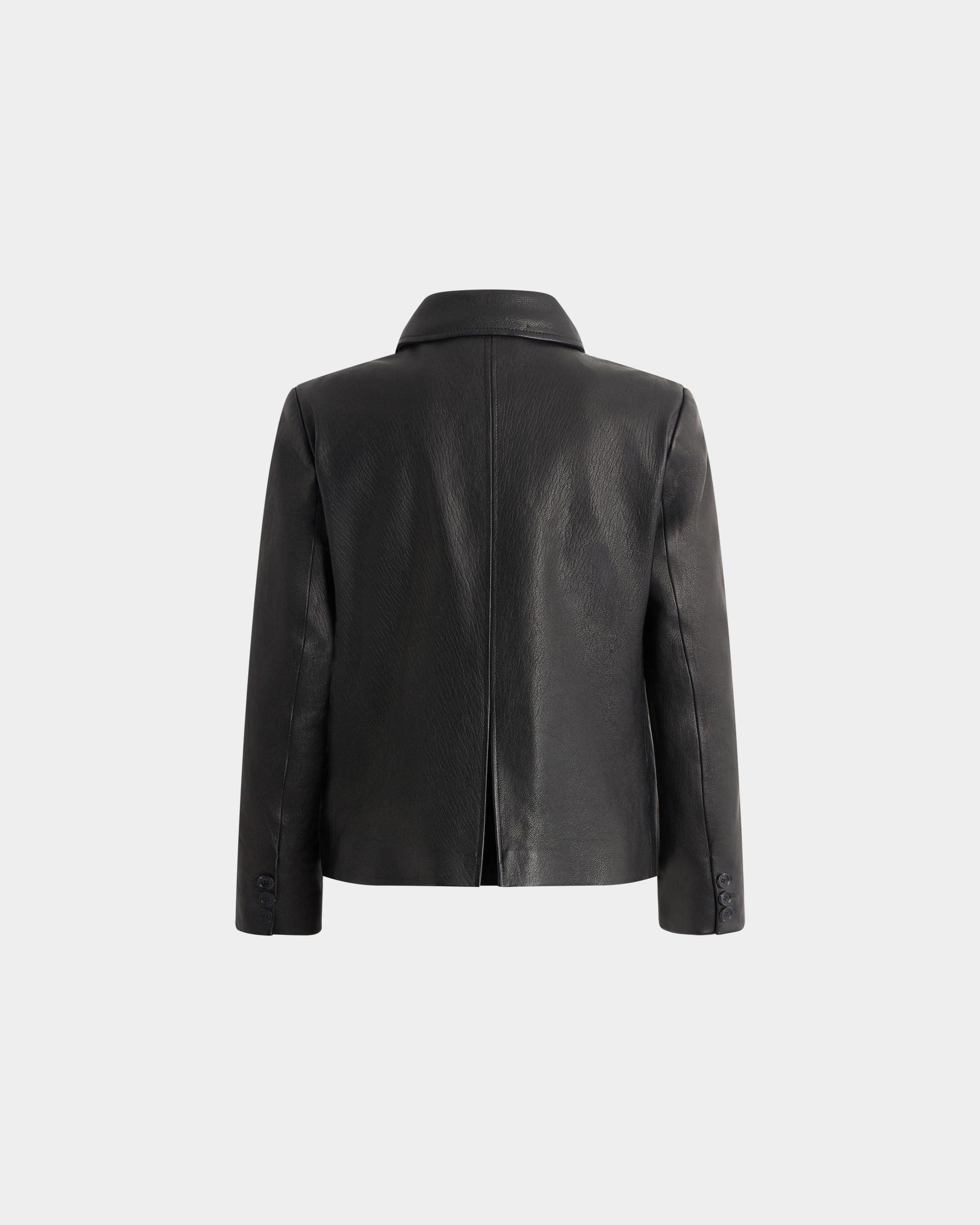 This black leather blazer with a notch collar is in finest kidskin with a grained finish. Three horn-effect buttons in tone-on-tone resin fasten the front.