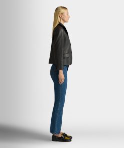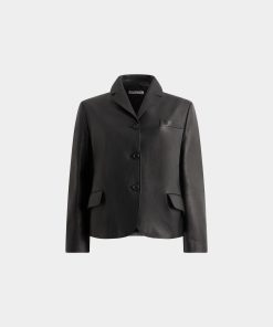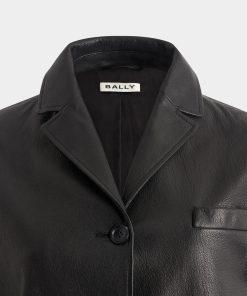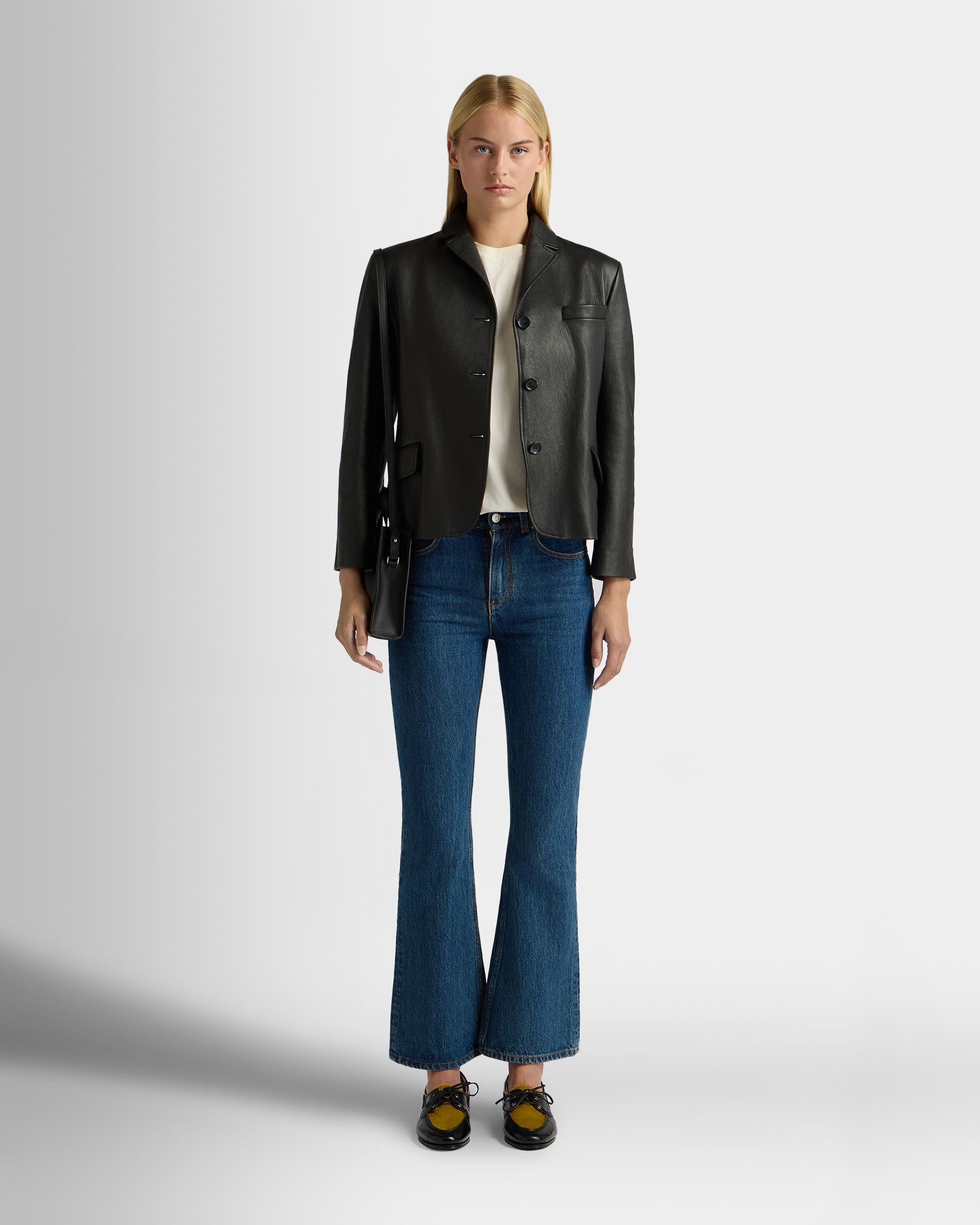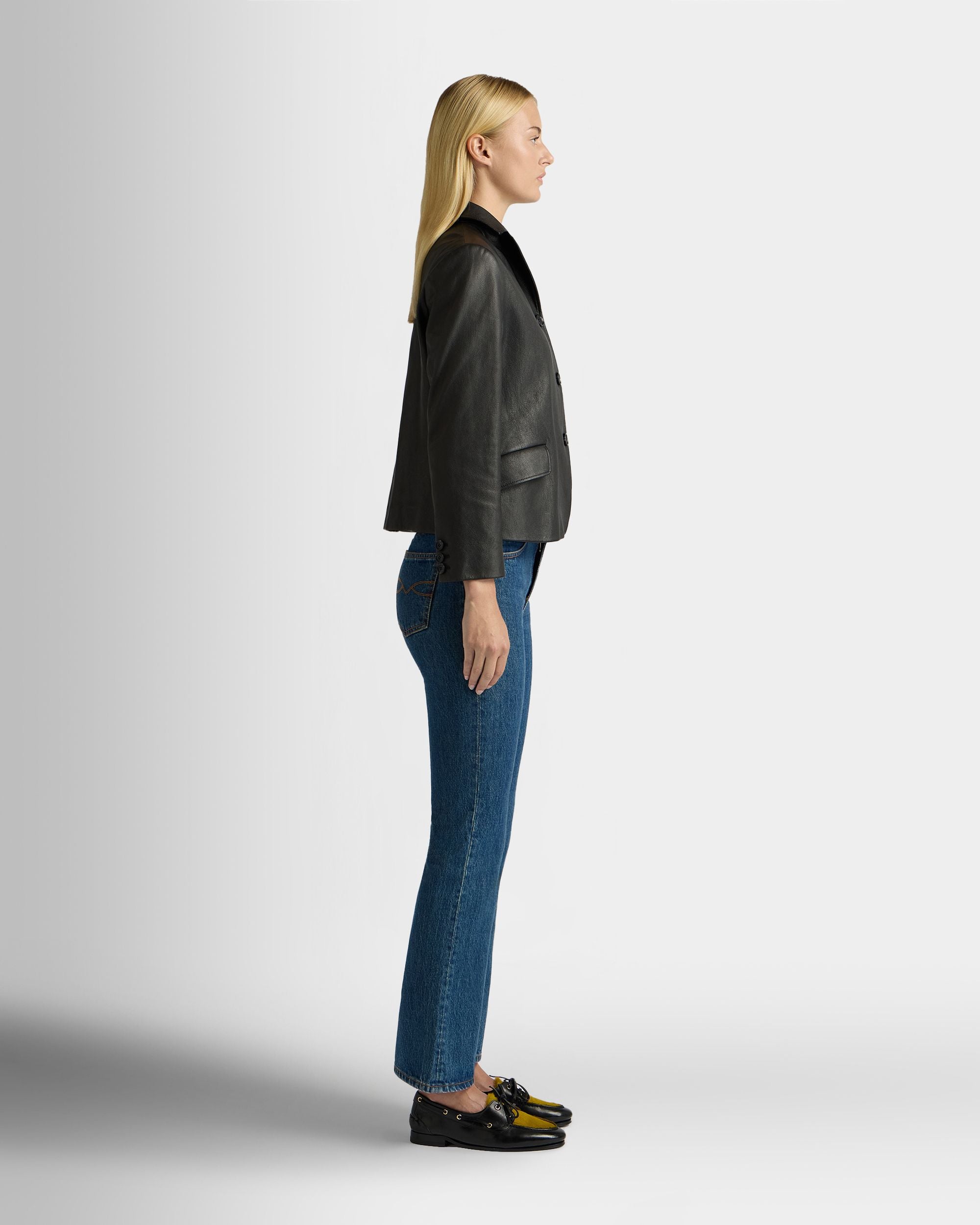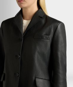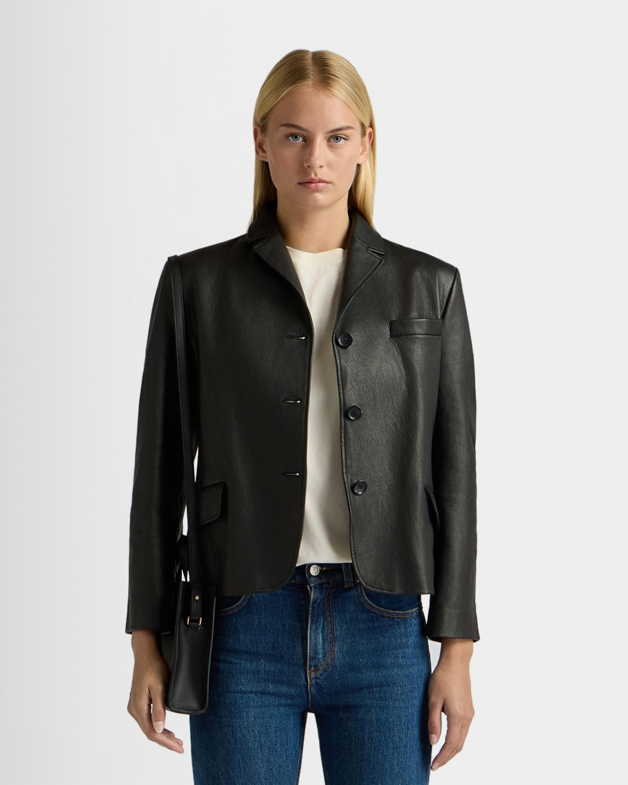 This black leather blazer with a notch collar is in finest kidskin with a grained finish. Three horn-effect buttons in tone-on-tone resin fasten the front.
