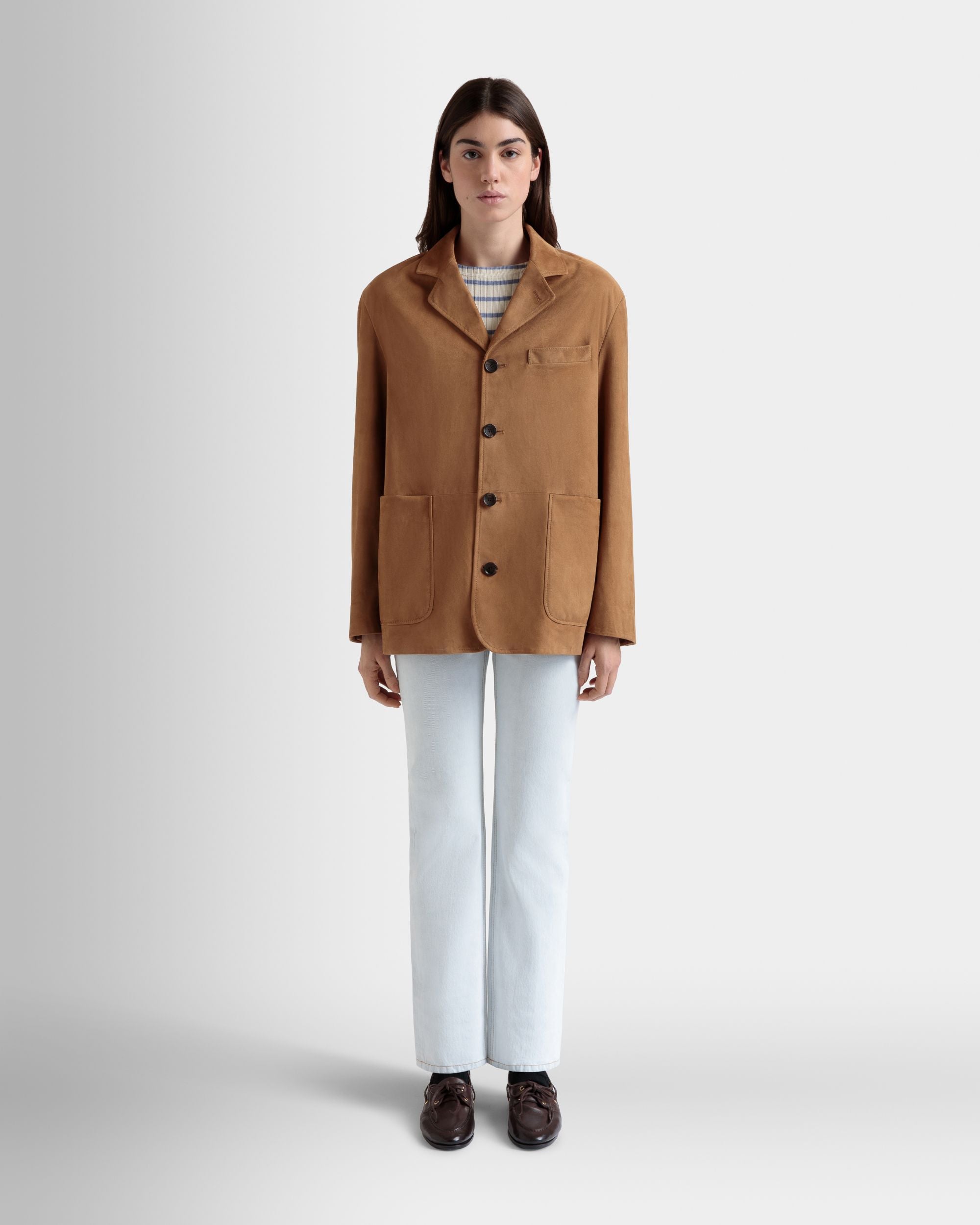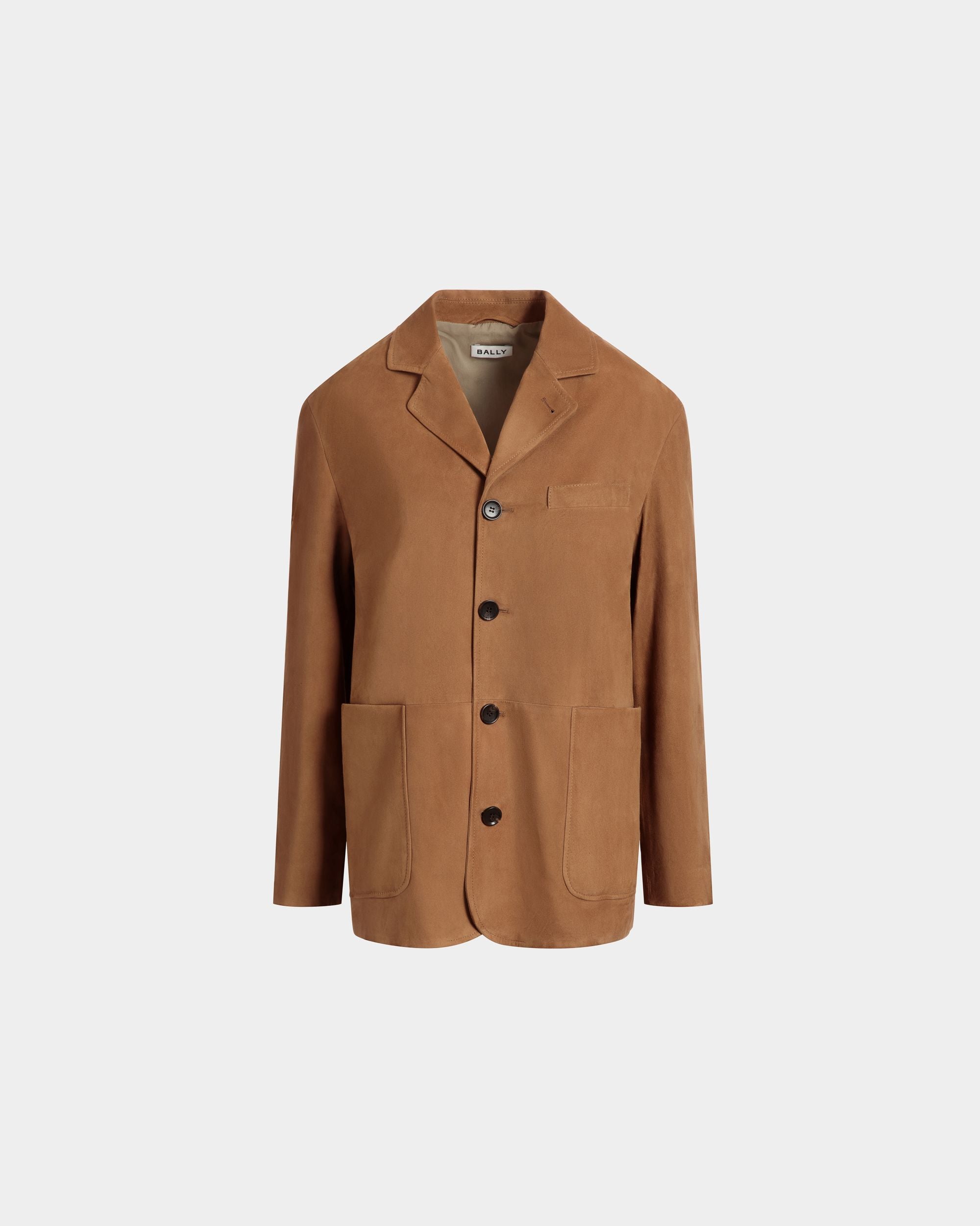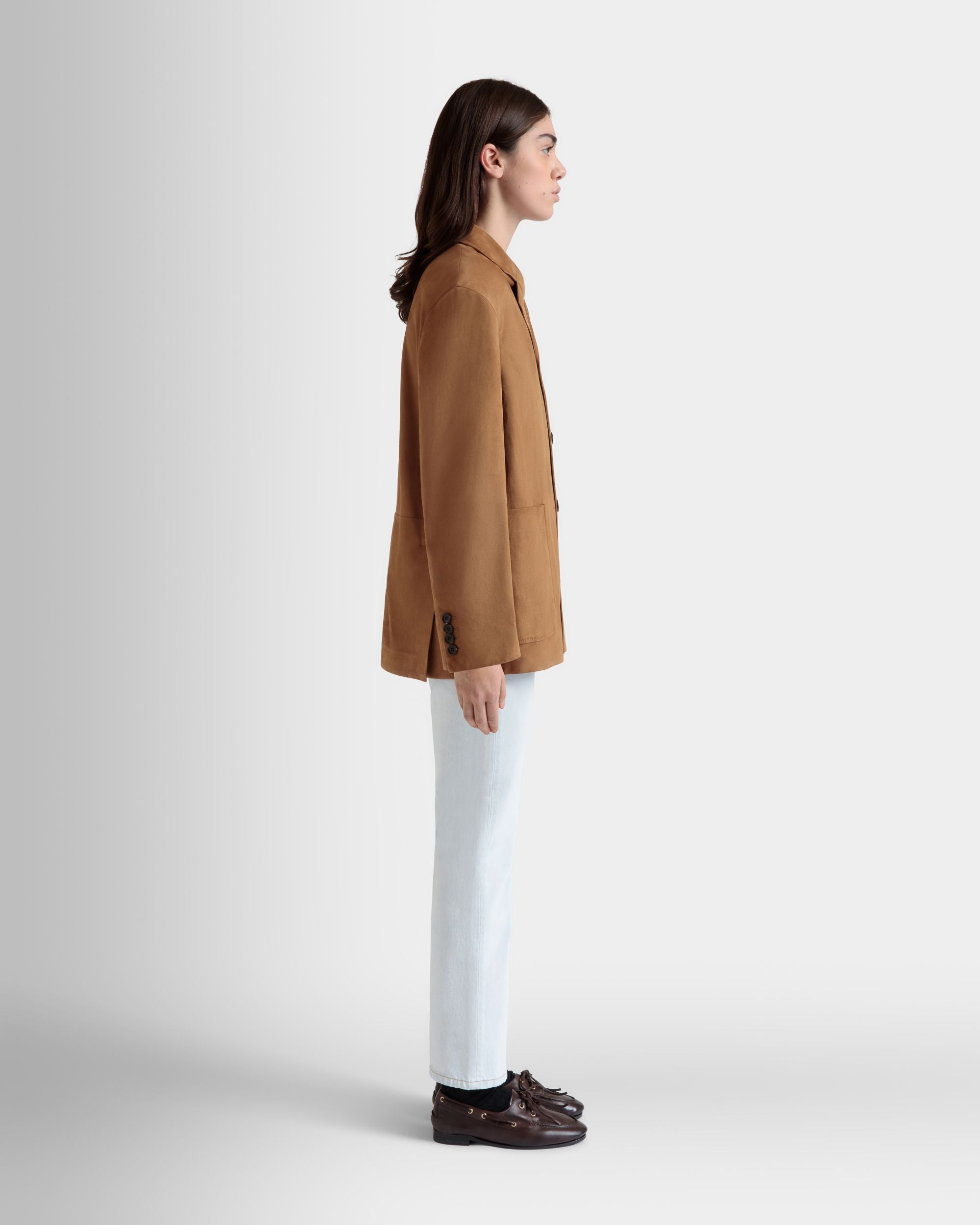 This single-breasted blazer in softest brown suede has a four-button closure, two large patch pockets and a single-welt chest pocket.