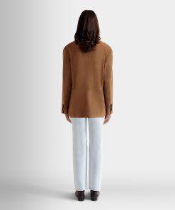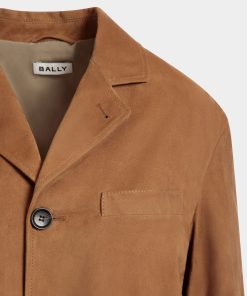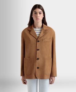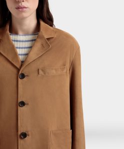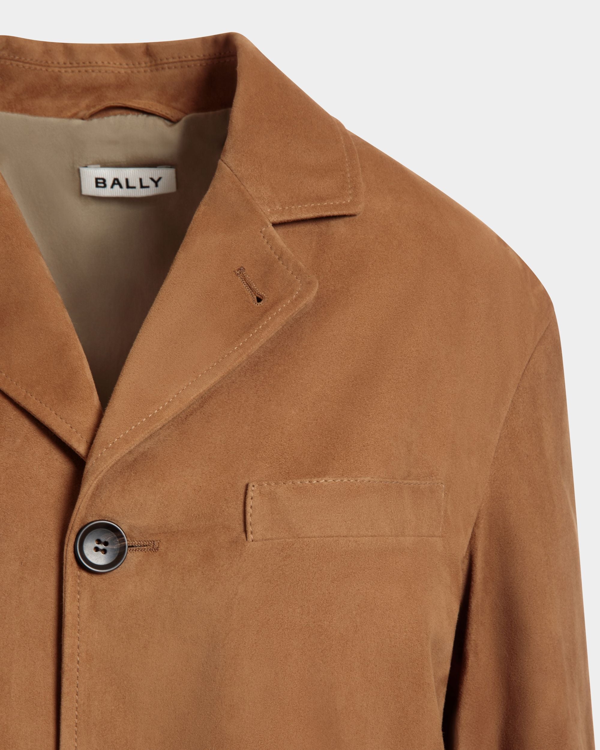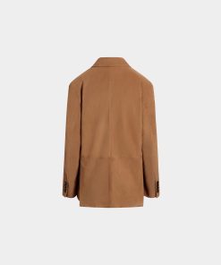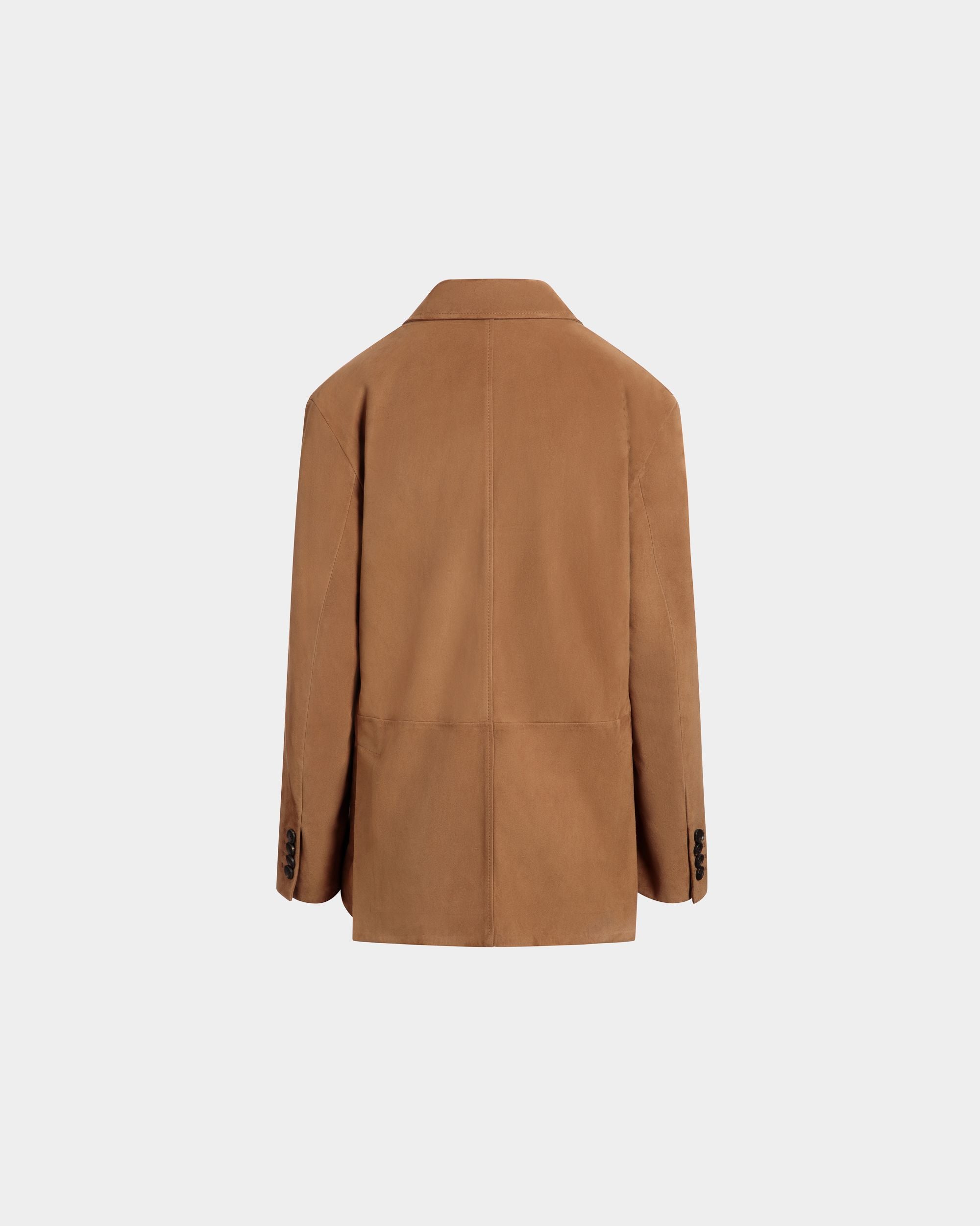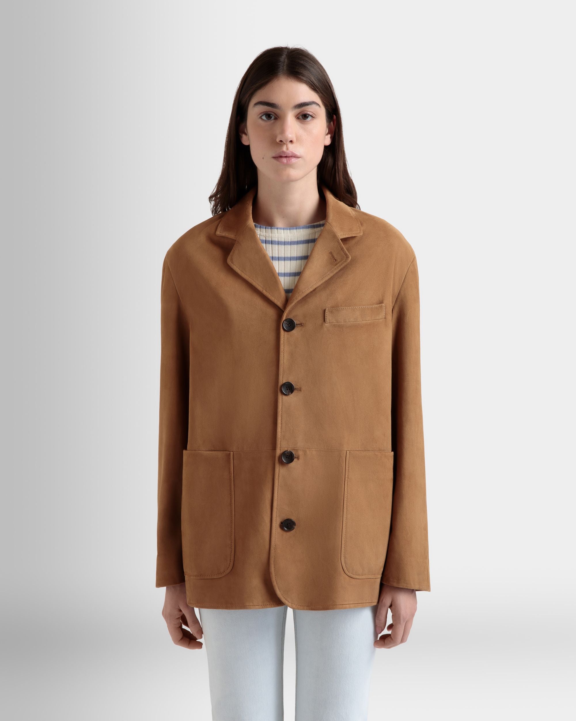 This single-breasted blazer in softest brown suede has a four-button closure, two large patch pockets and a single-welt chest pocket.