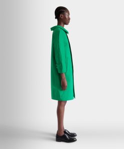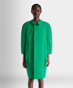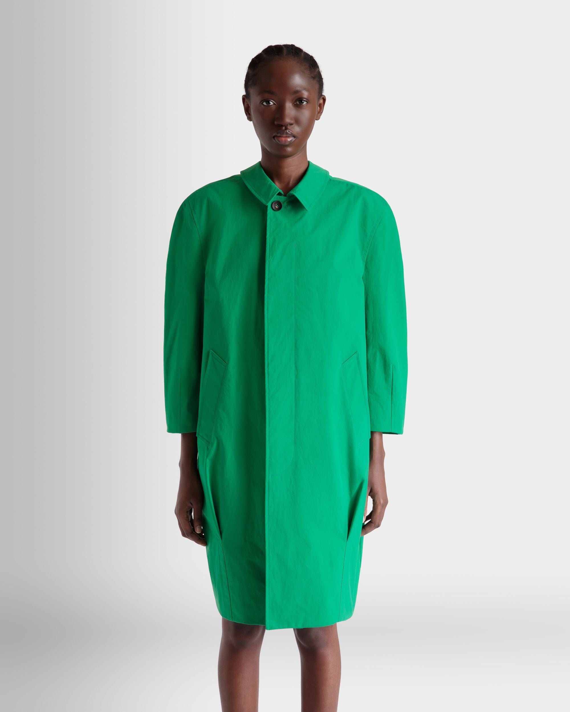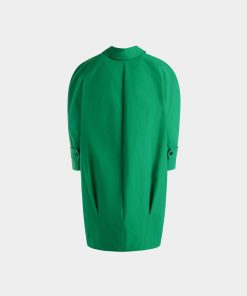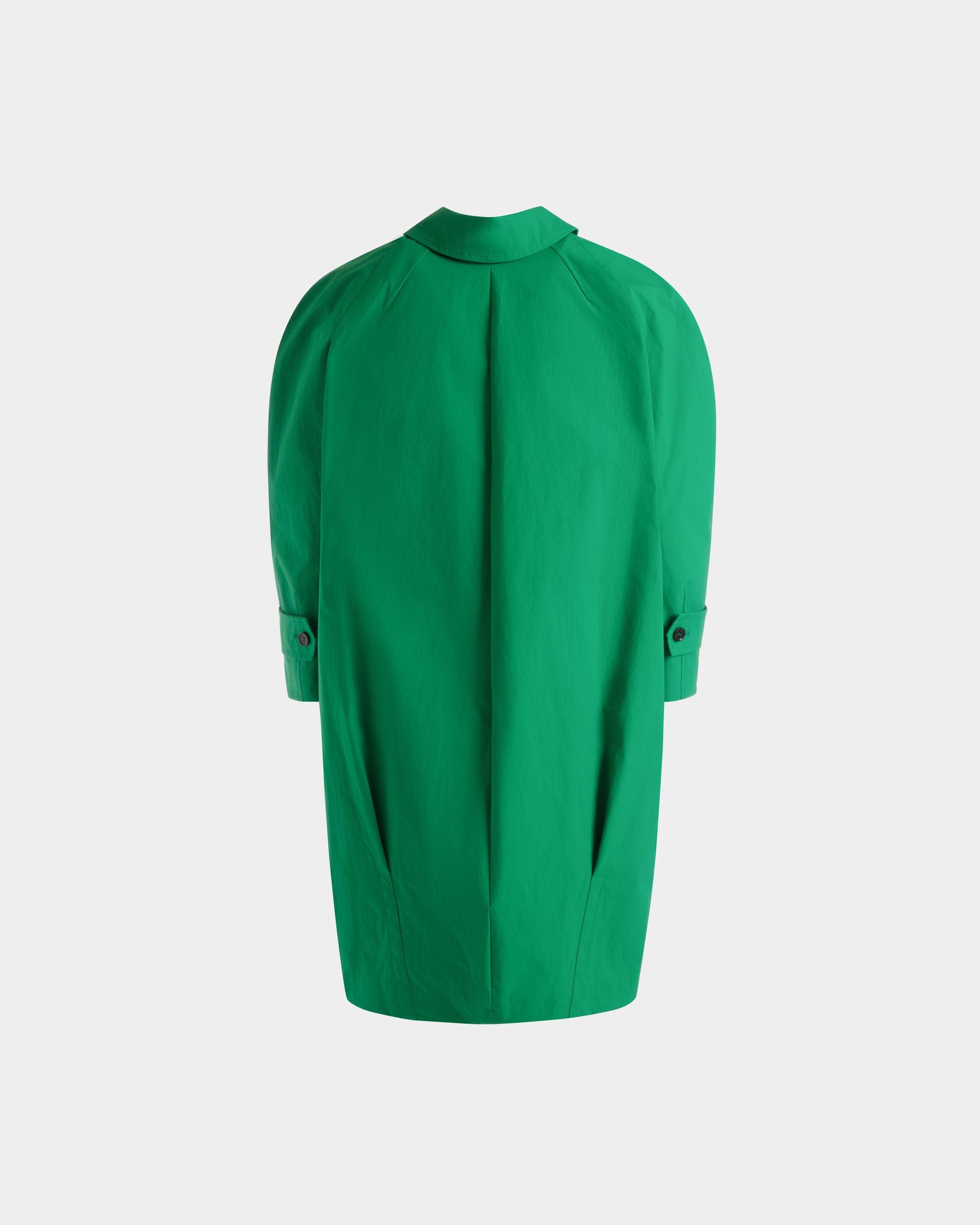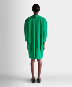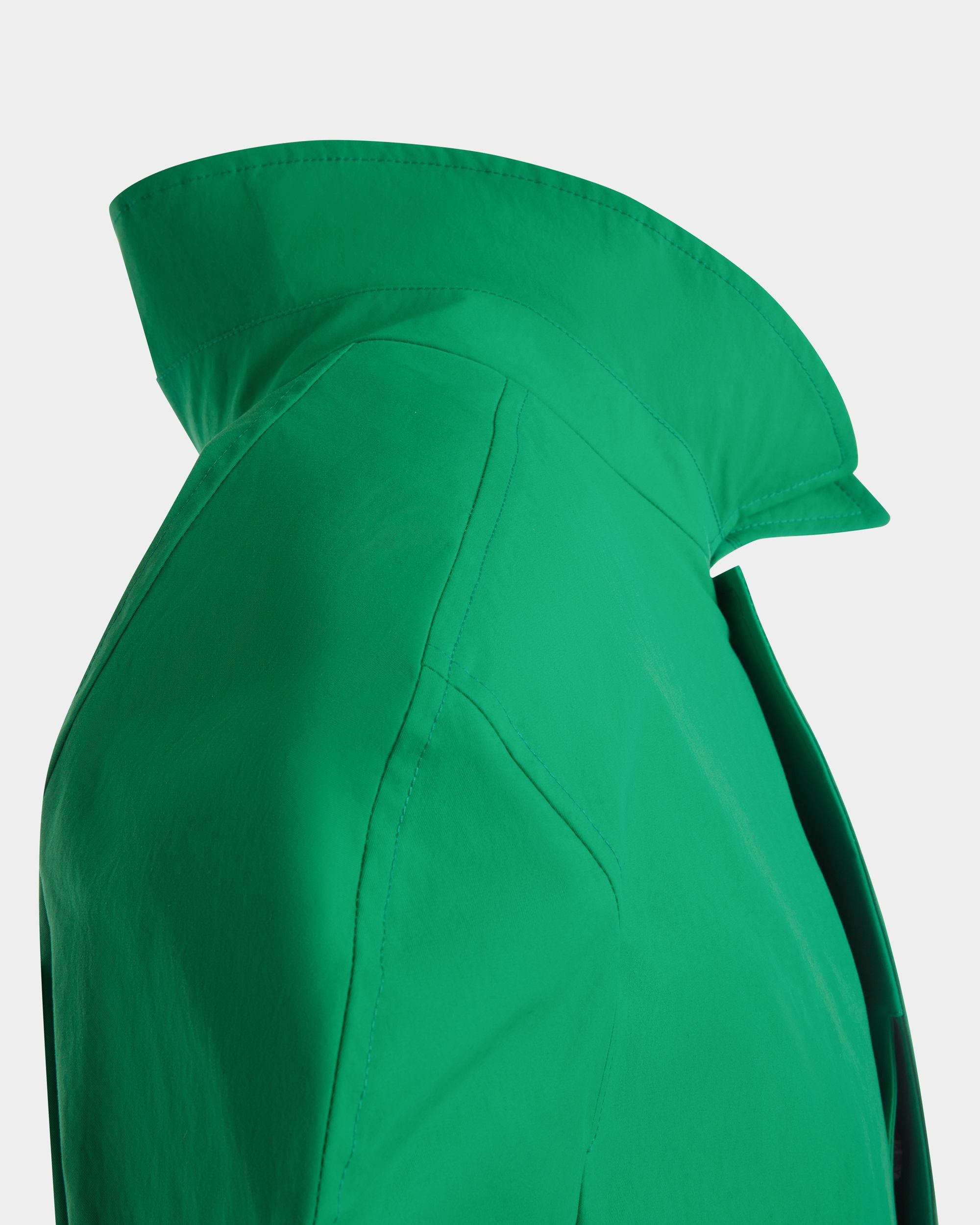 This emerald green coat is in micro-twill polyester fabric with a cotton-like hand feel. Pleats along the hemline create singular volumes and an ovoid silhouette.
