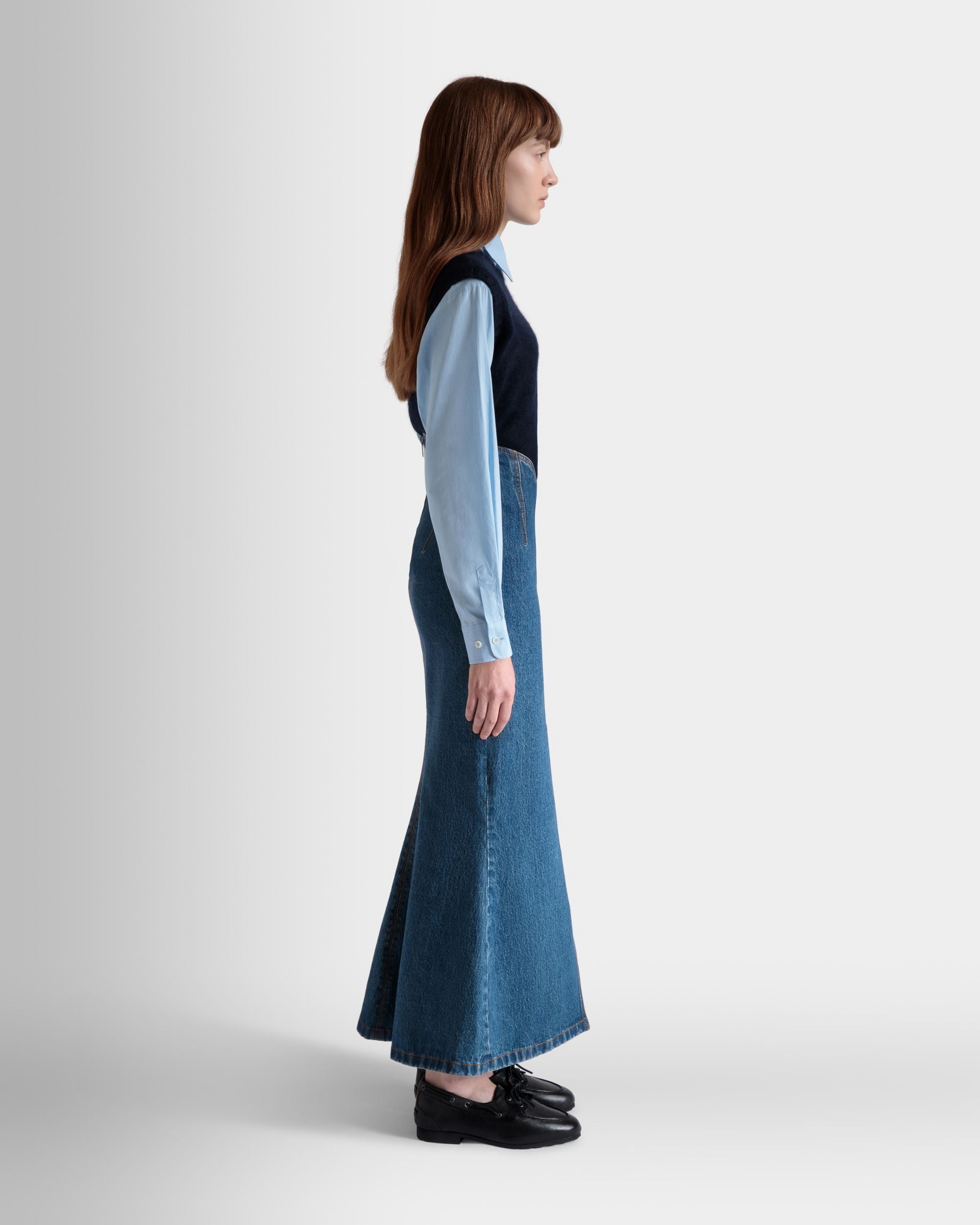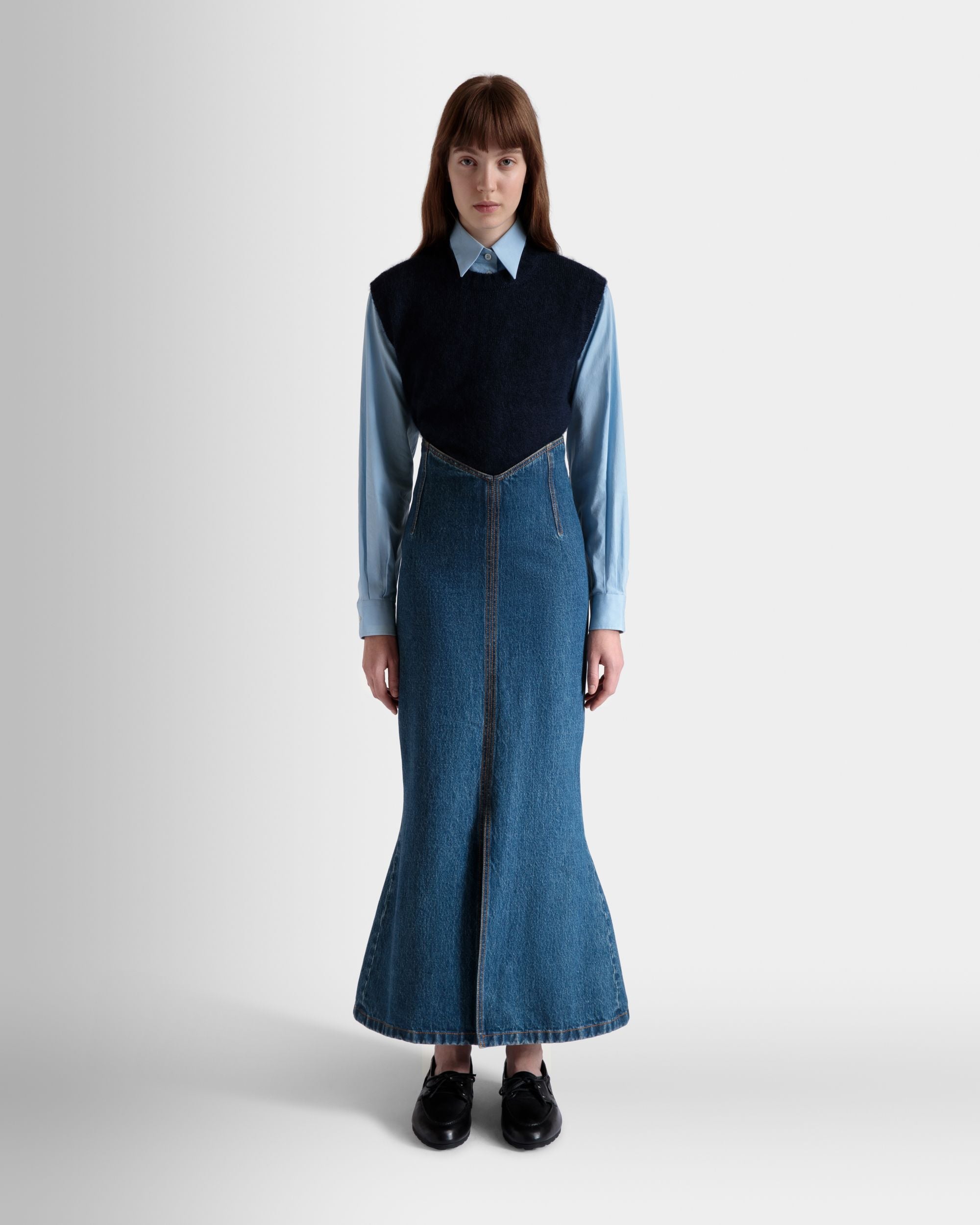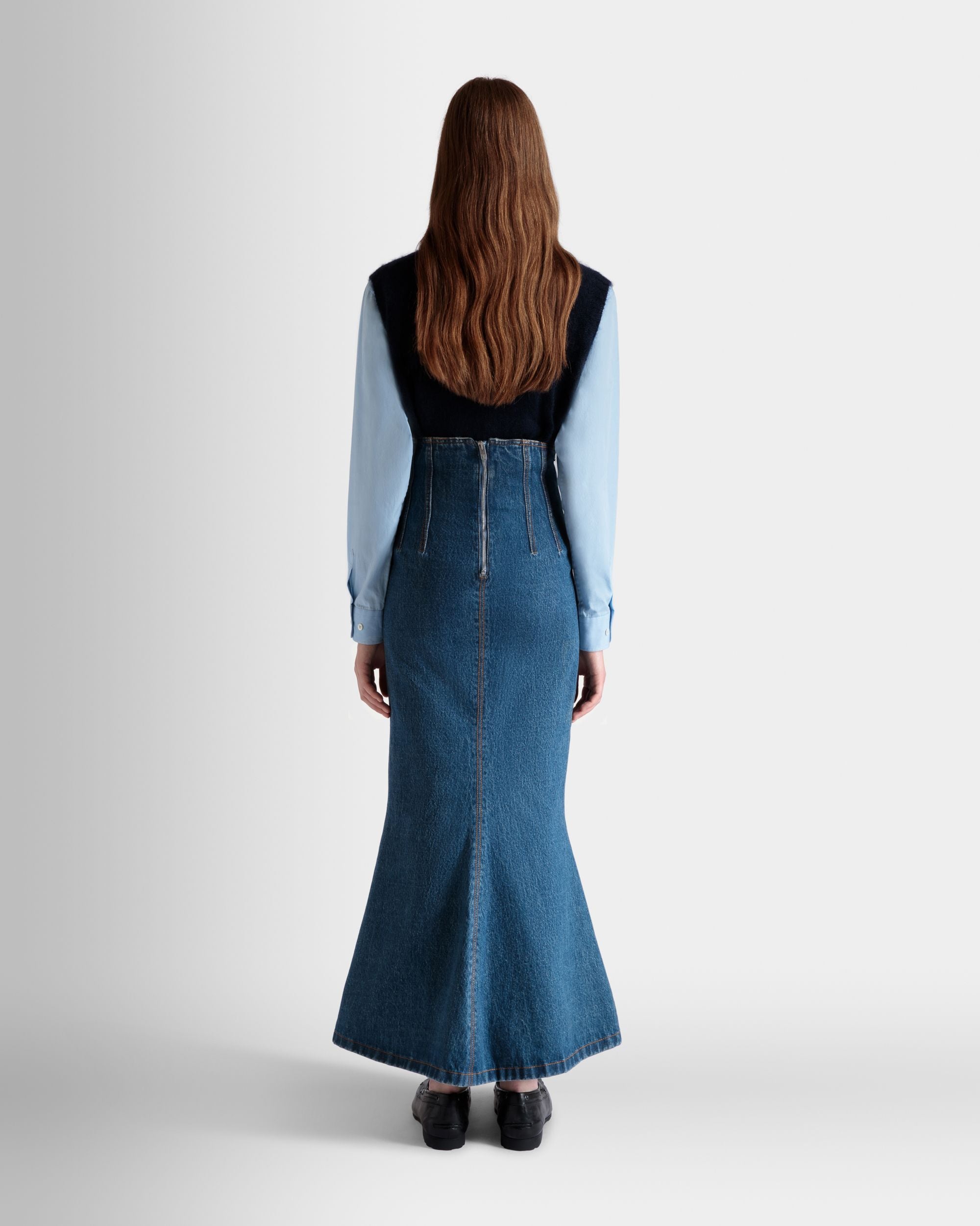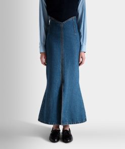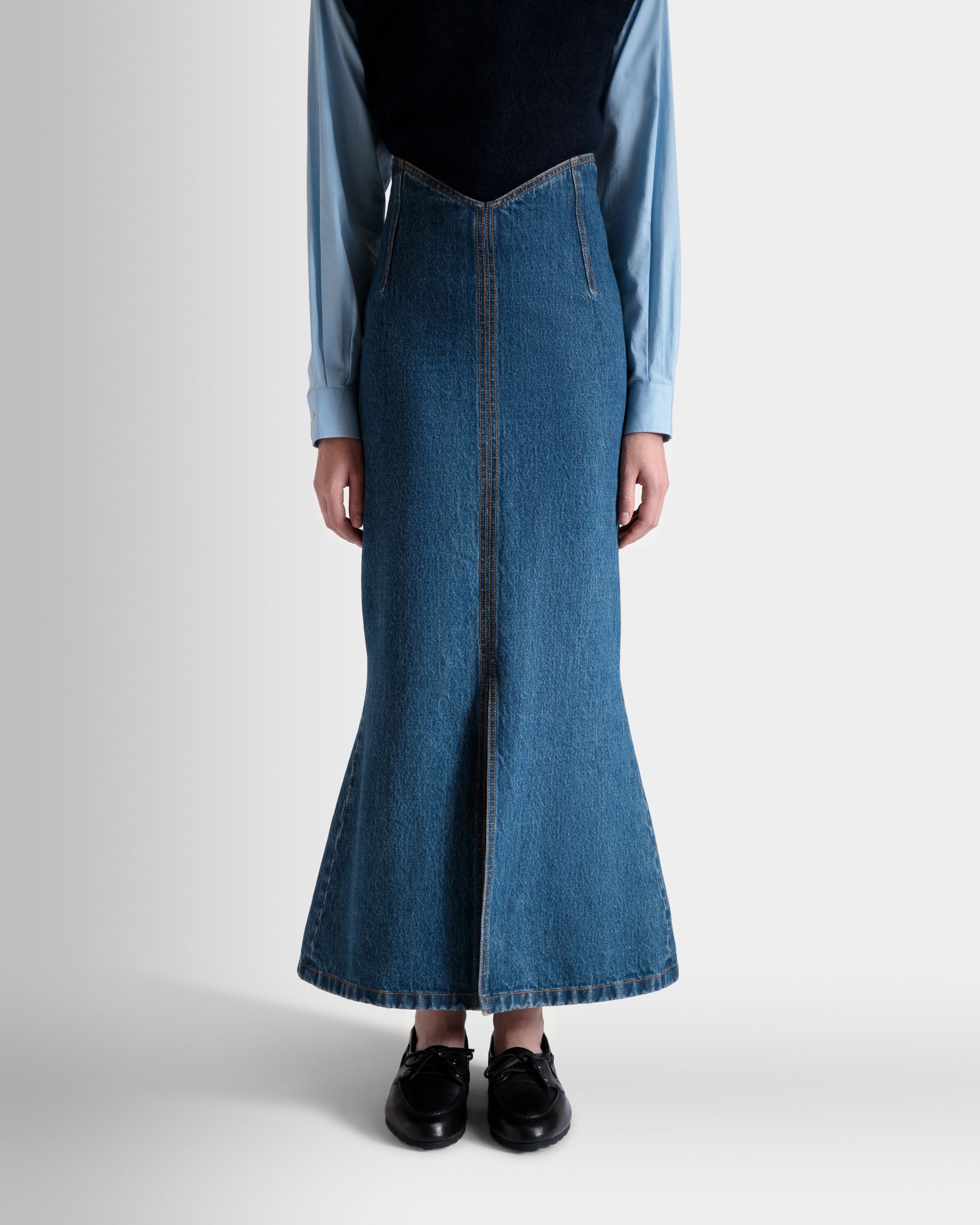 This long skirt unites the elegance of a mermaid silhouette with iconic medium blue cotton denim.