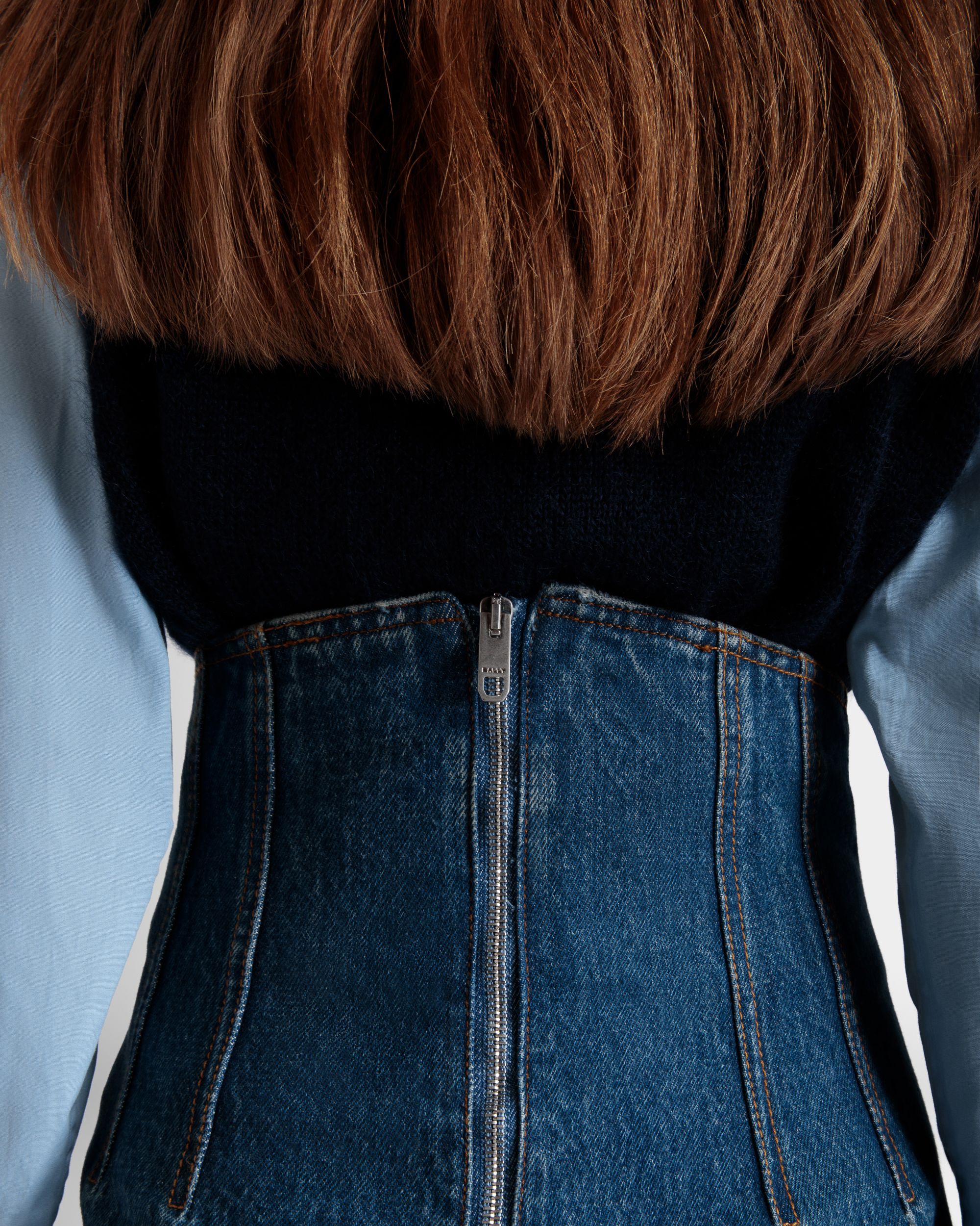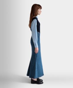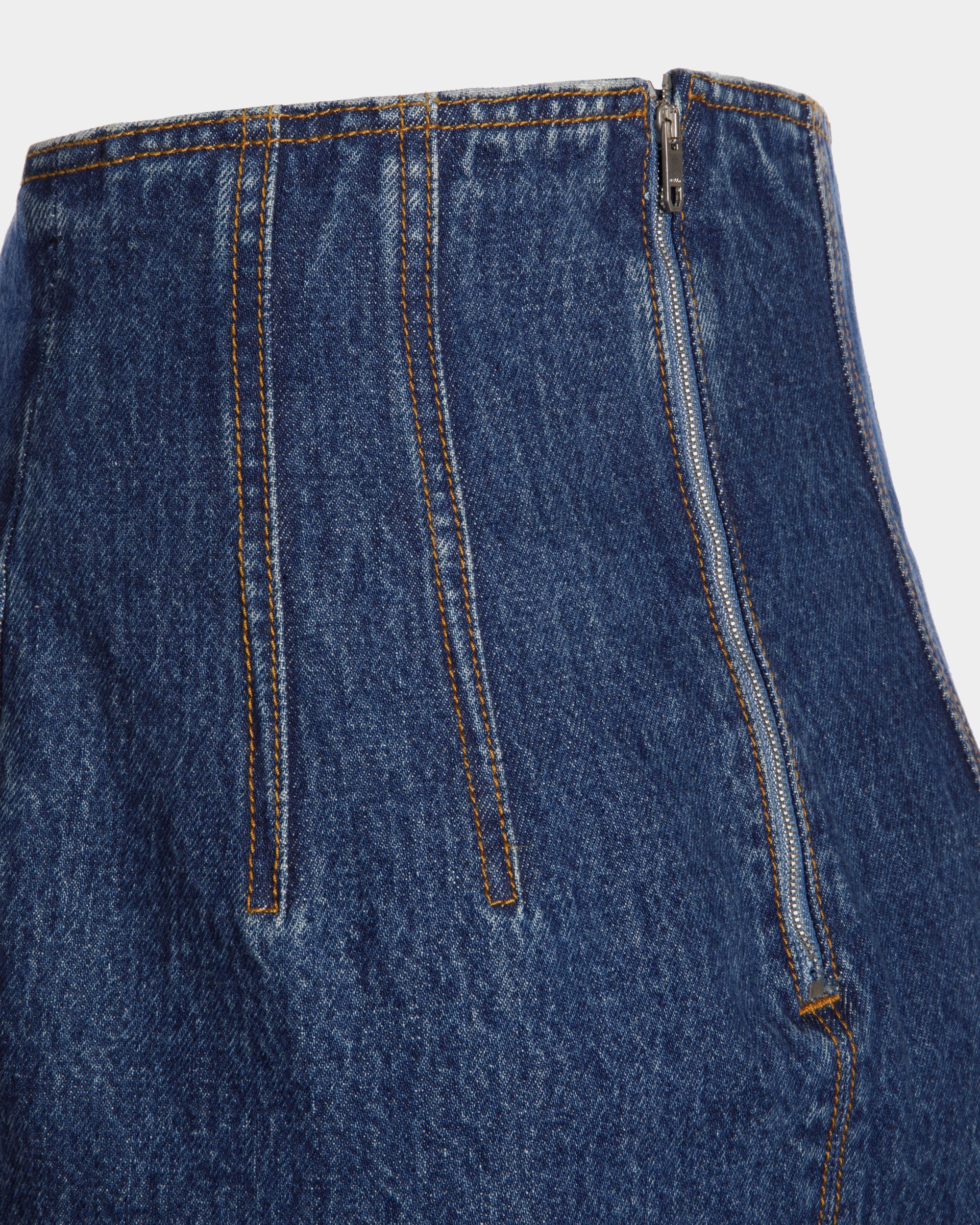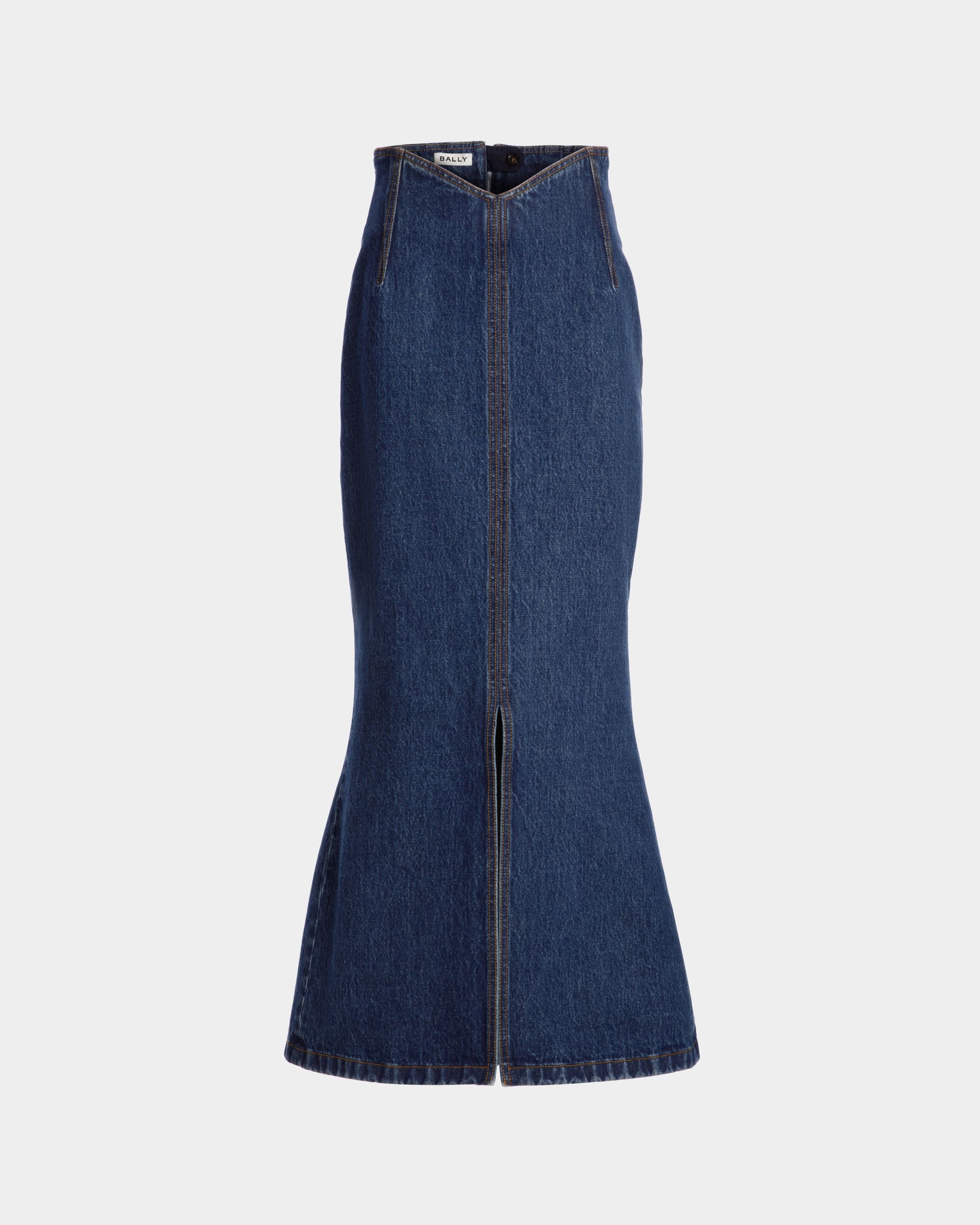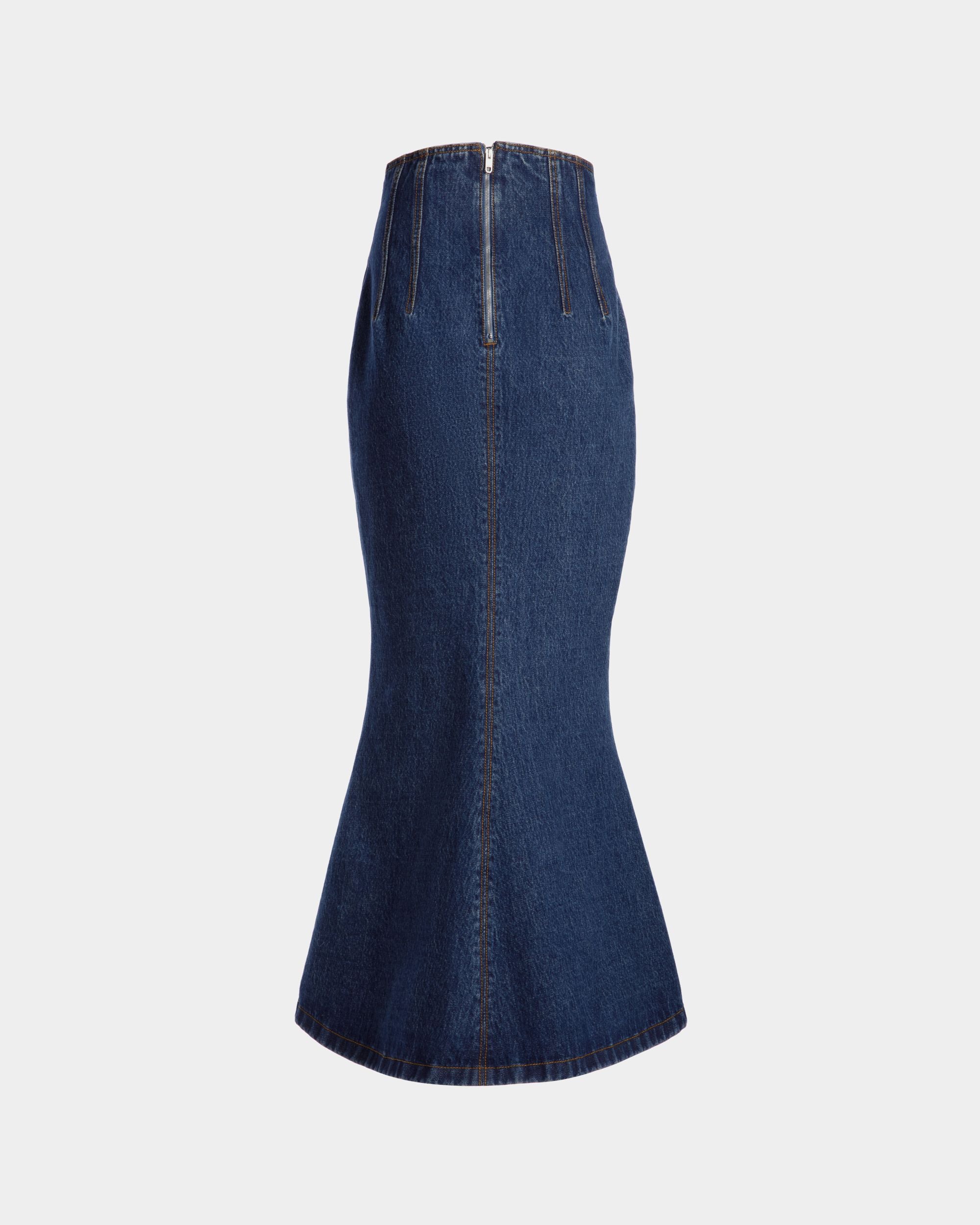 This long skirt unites the elegance of a mermaid silhouette with iconic medium blue cotton denim.