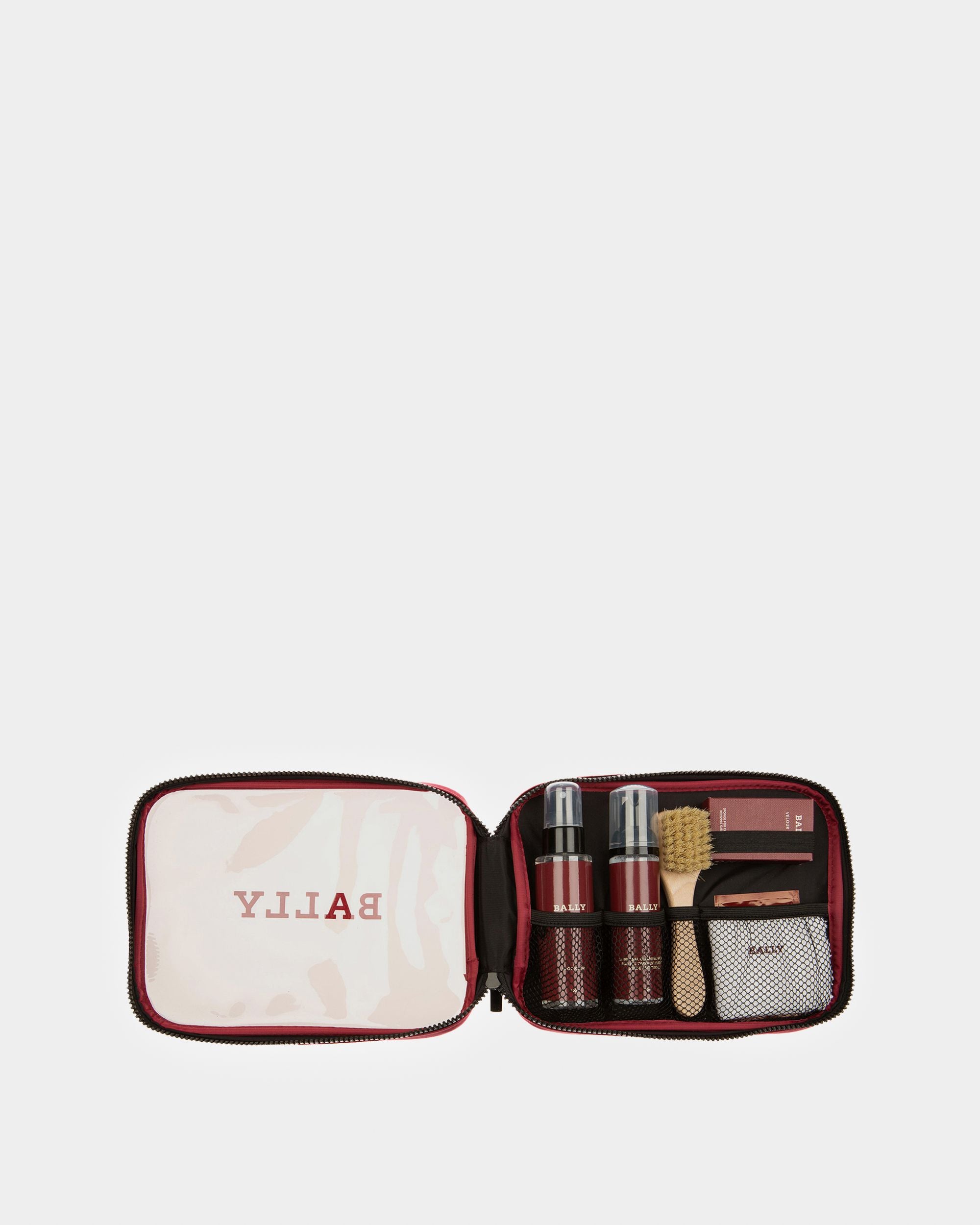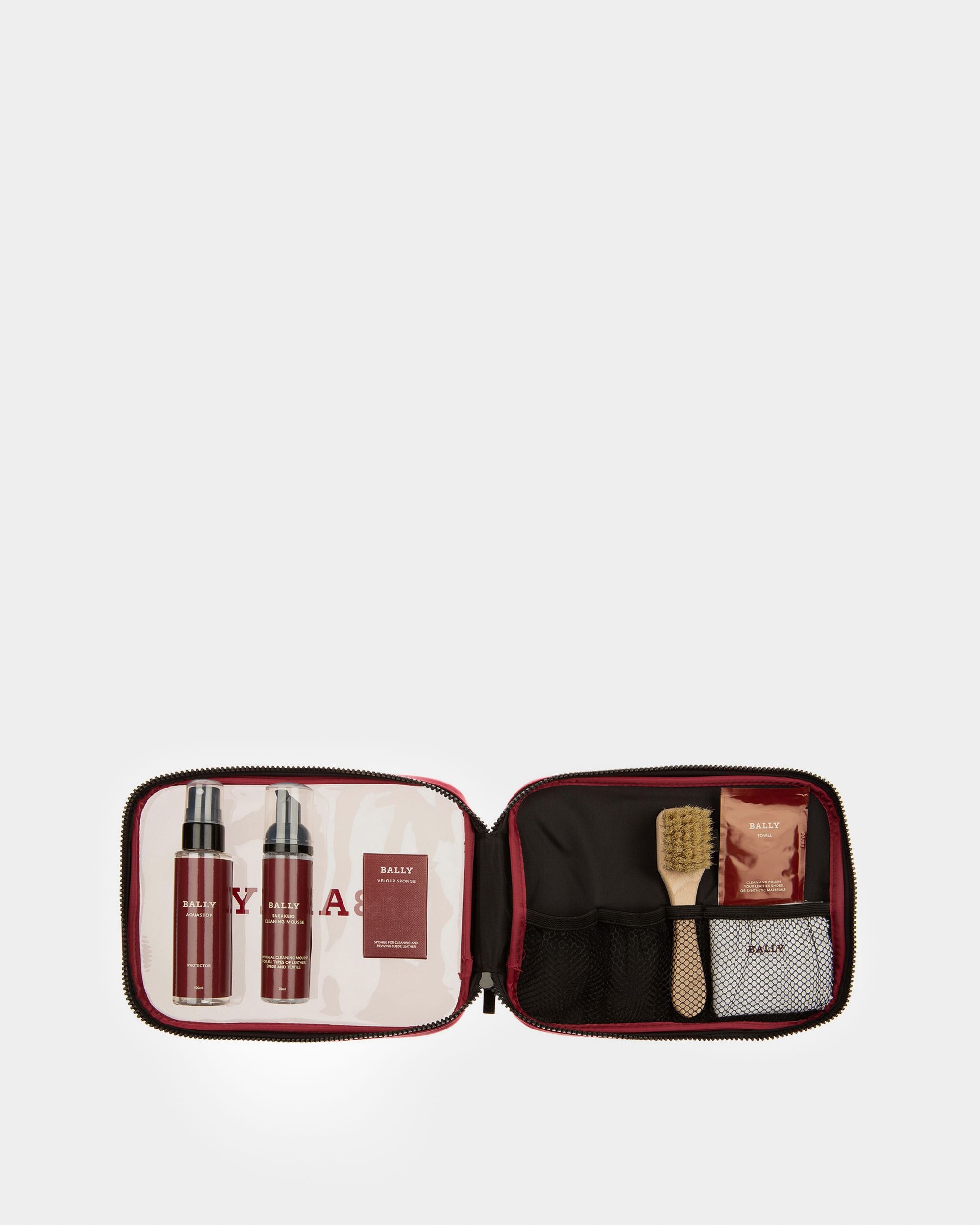 This compact shoe care travel kit houses accessories for keeping shoes clean when on the go. Included are a colourless Aquastop treatment used to protect leather, suede and fabrics against dirt, damp and stains, a double sided towel with a rough side for tough stains and a soft side for general cleaning, 12 wipes, a velour sponge for cleaning suede and nubuck, a whitening cream for keeping white sneakers looking box fresh and a brush.