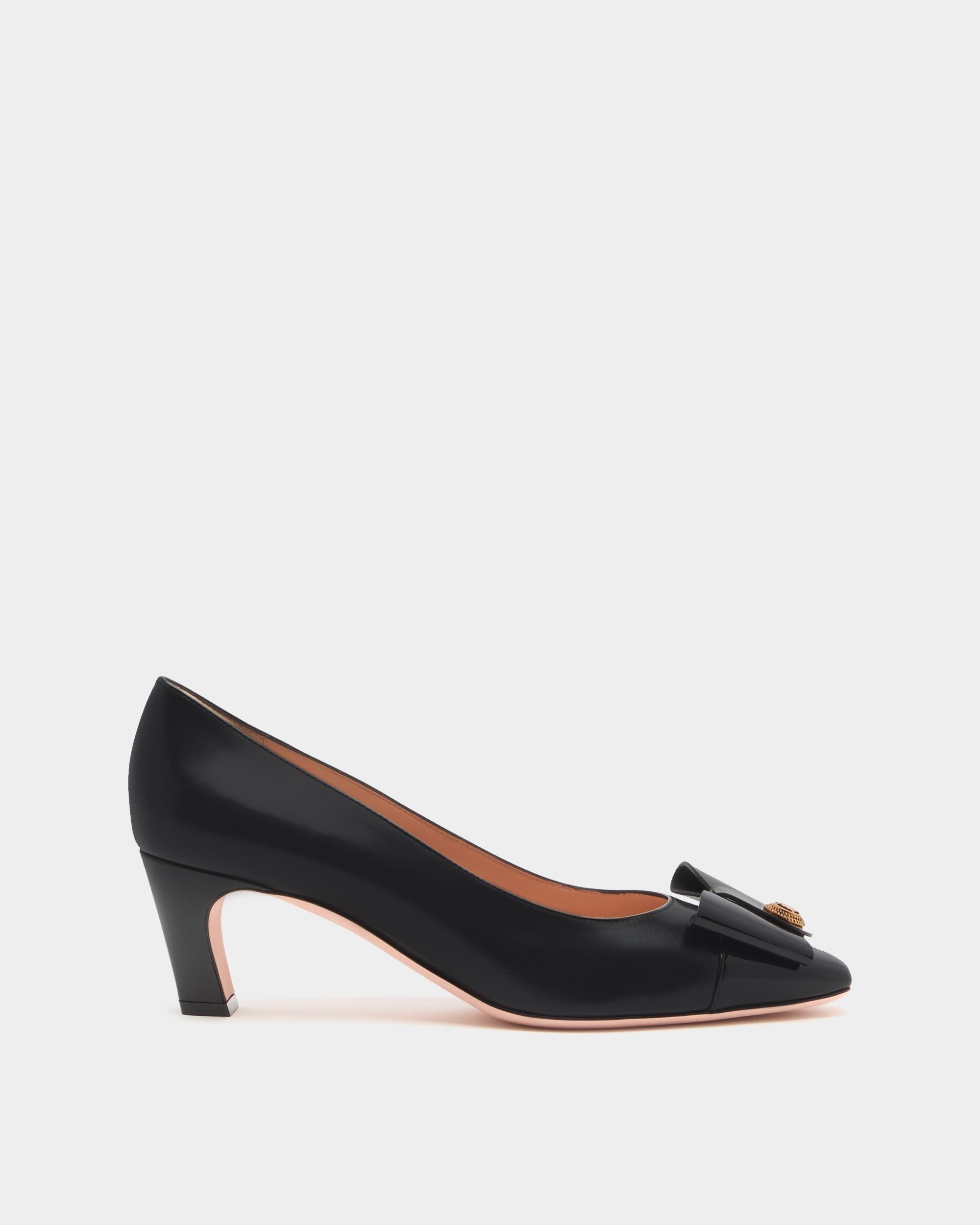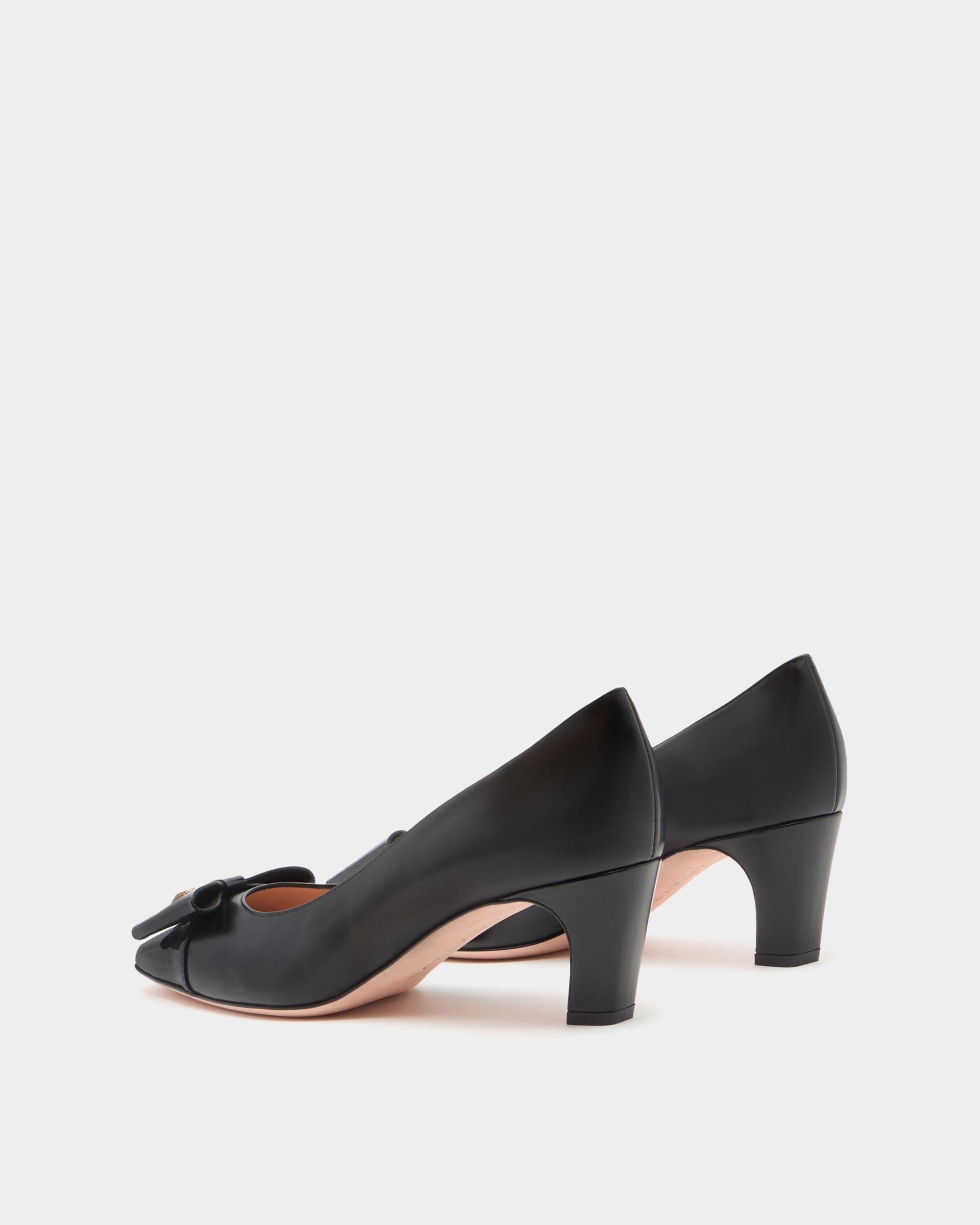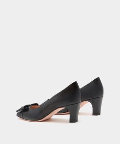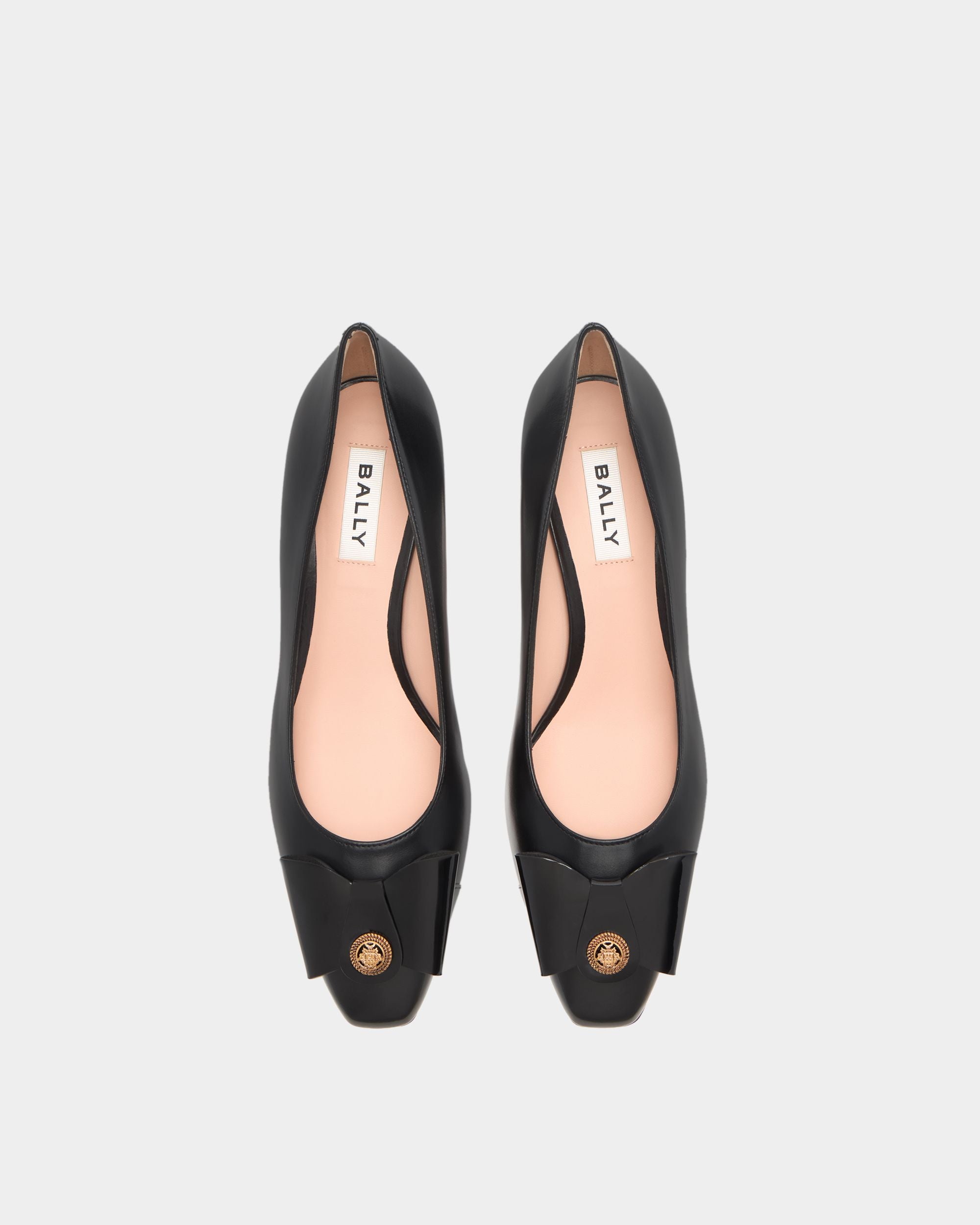 The classic all-black silhouette of this leather pump is finished with an iconic bow from the Bally archives, refreshed with a Crest signifier at the center.