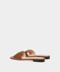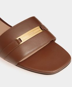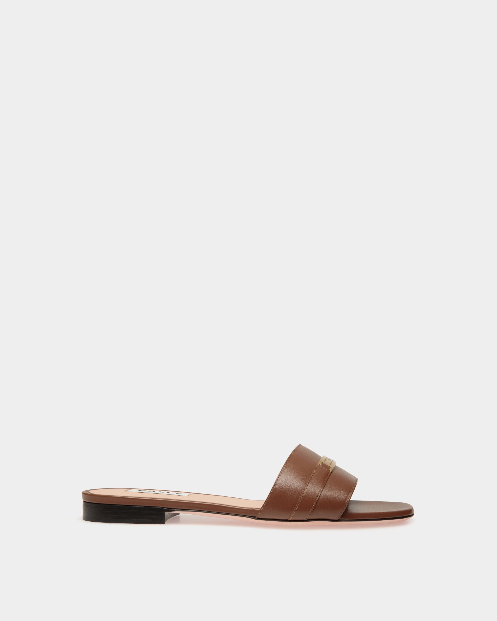 This flat Deco sandal in brown calfskin features a slide upper embellished by a simple metal plaque along the top, a stylistic code which has been reimagined to reflect the Bally Ribbon.