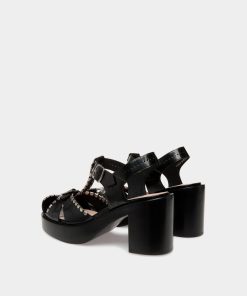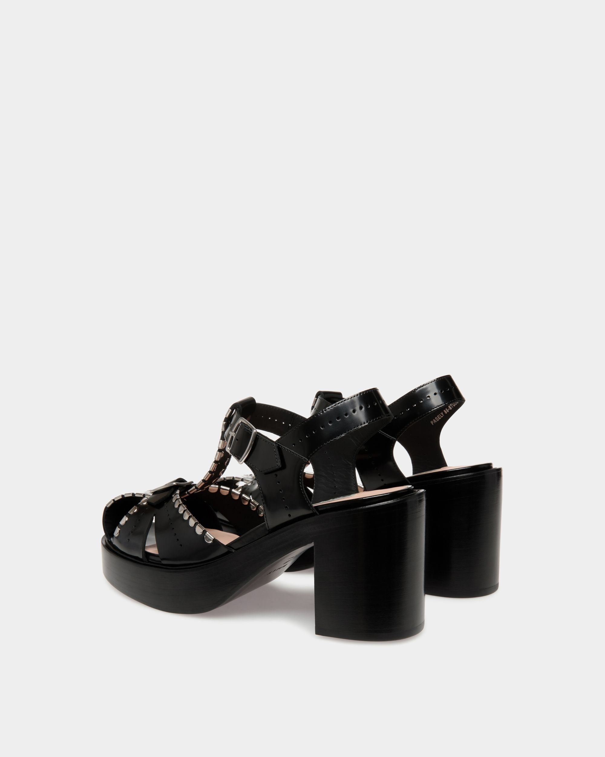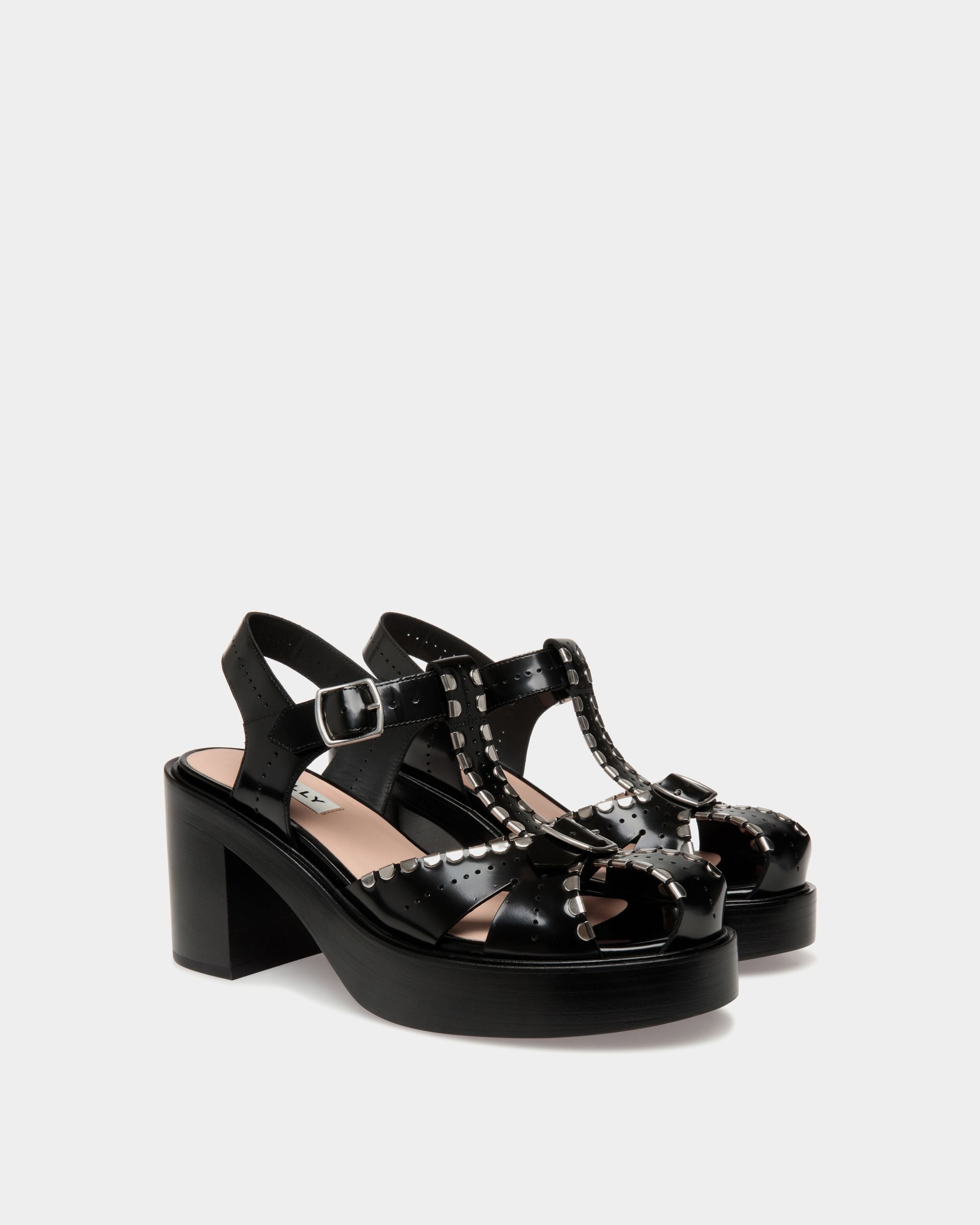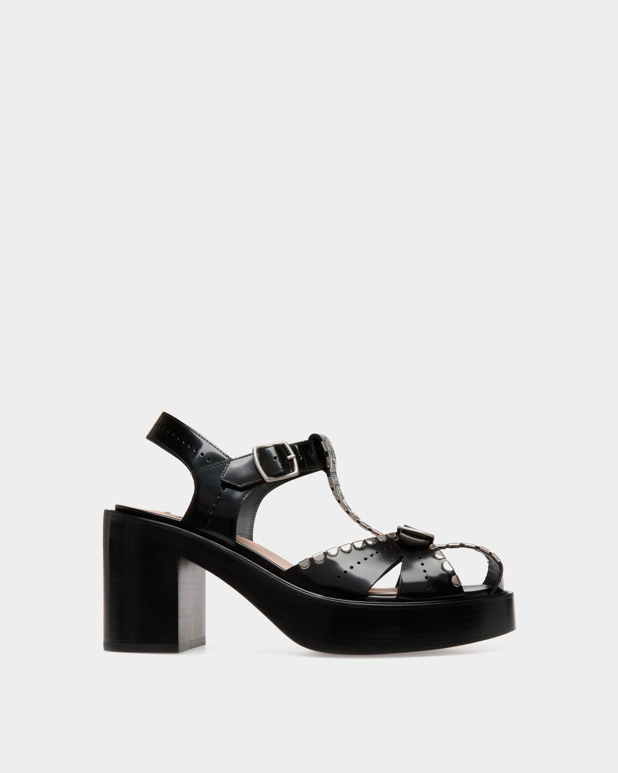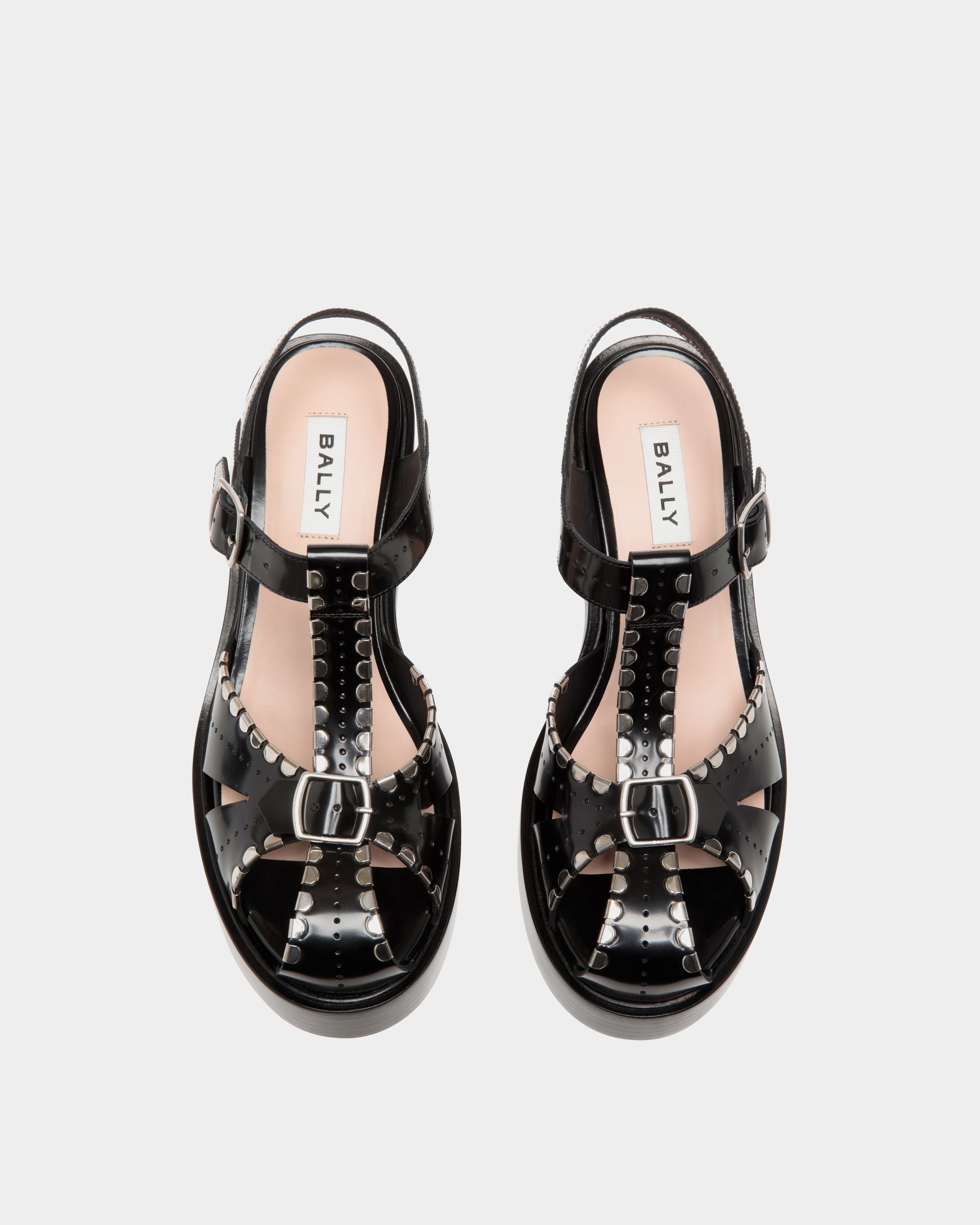 The Peggy Gut sandal in glossy black leather is embellished by metal clamp edging and round perforations throughout the t-strap upper, inspired by a 1989 archival design.