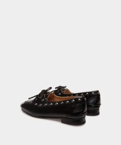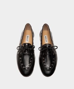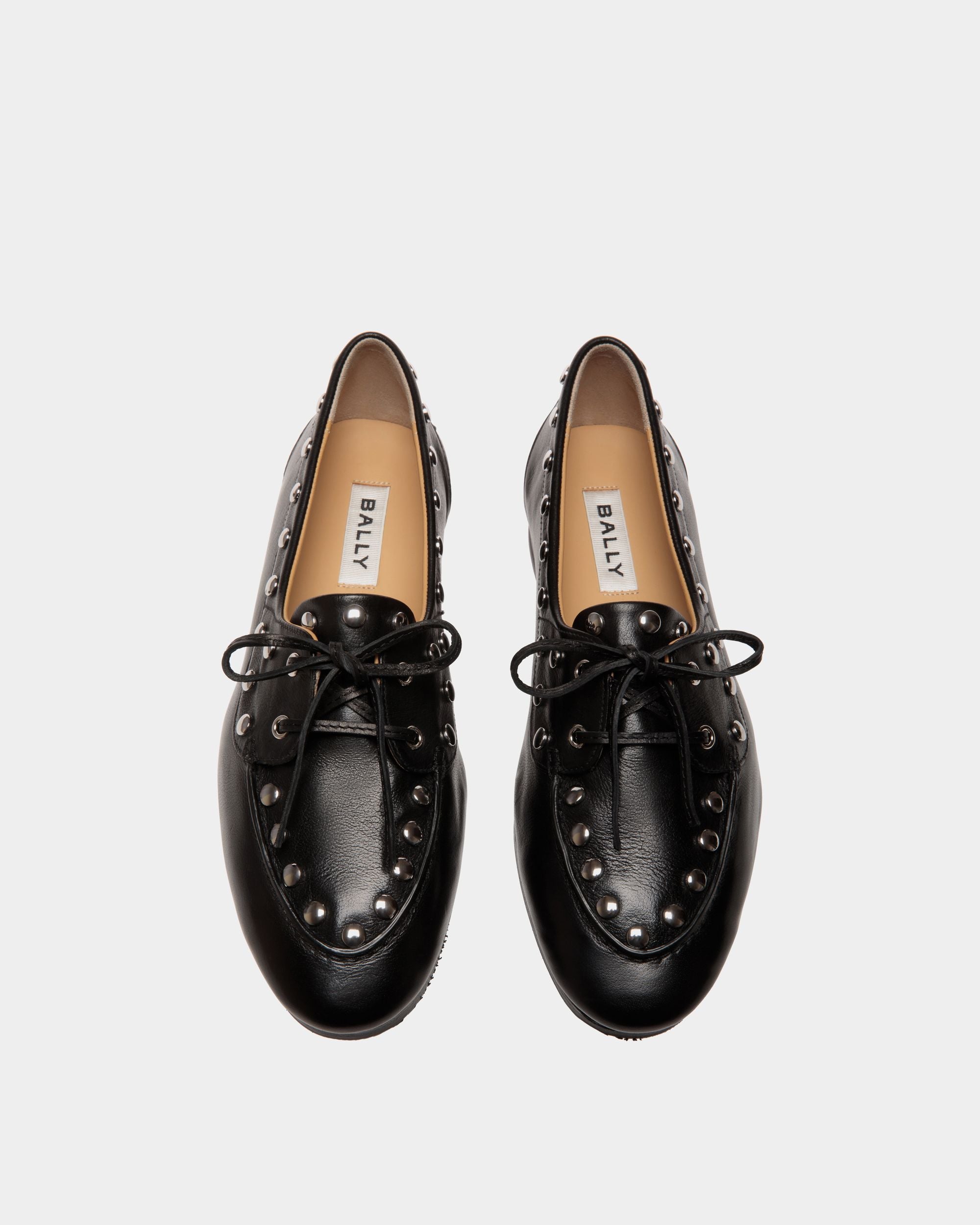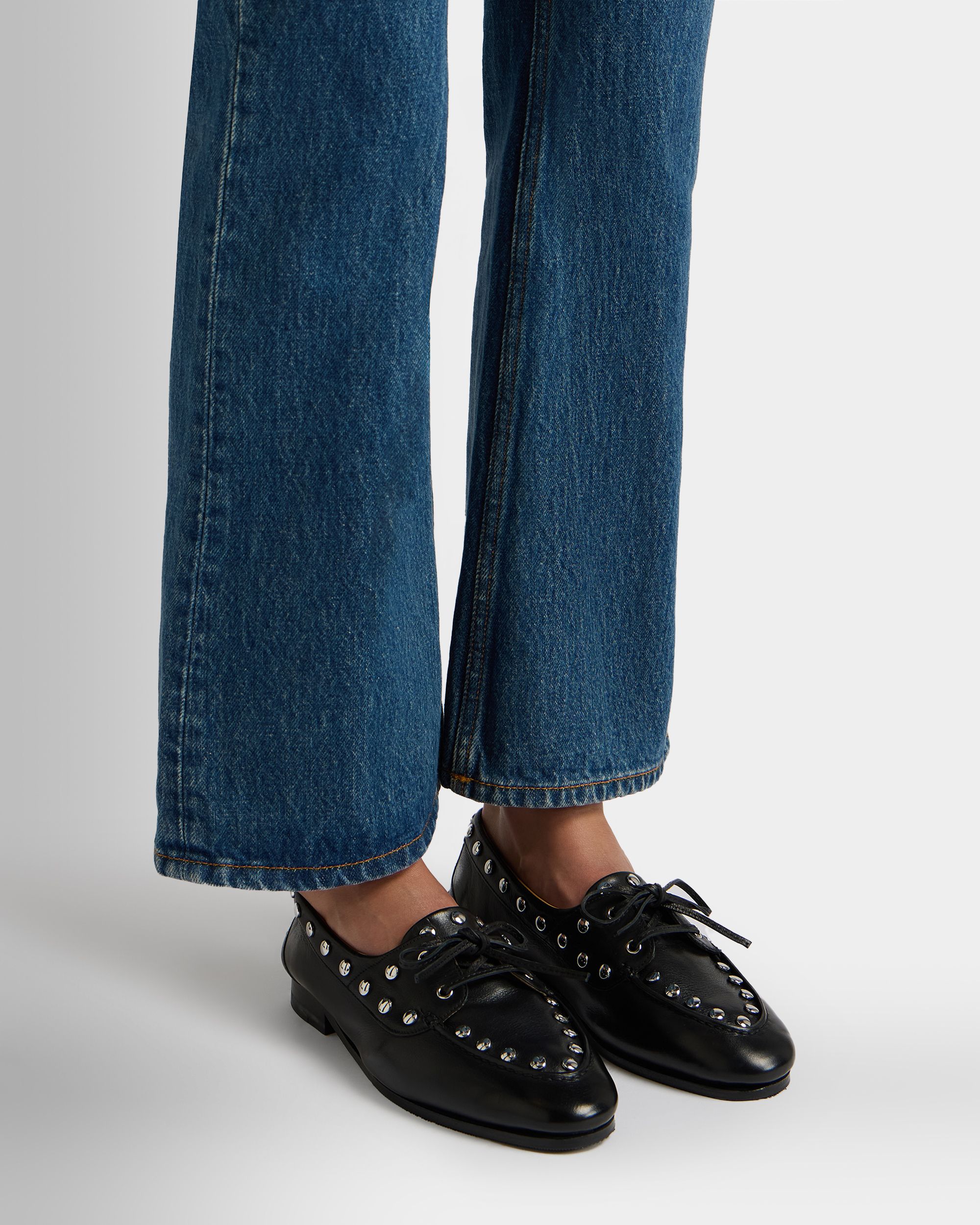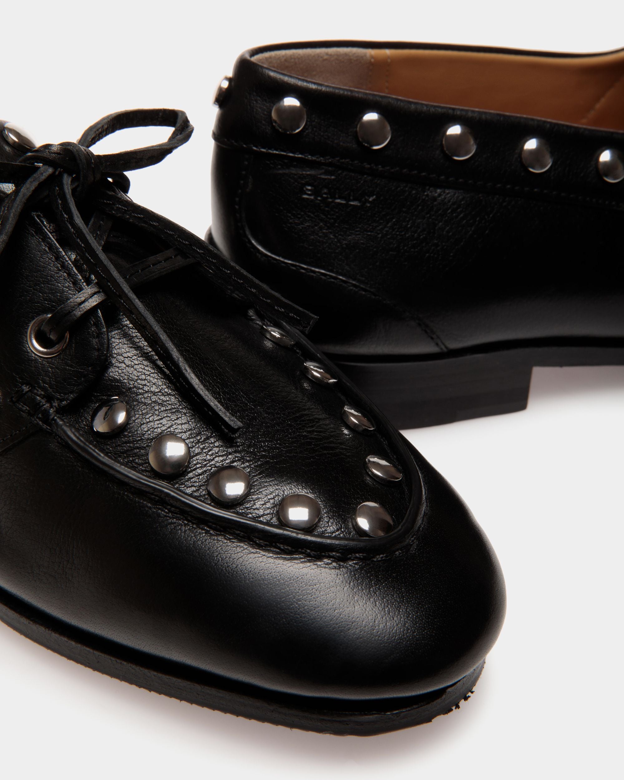 This Plume moccasin brings chic studs to Bally’s interpretation of a classic boat shoe. The upper in smooth black buffalo leather is united with the leather sole via Goodyear Reverse construction for lightness and flexibility.