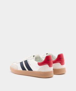 This lace-up Retro Crest sneaker is in white leather with a red and white grosgrain Ribbon to the side. A Bally Crest label decorates the tongue.