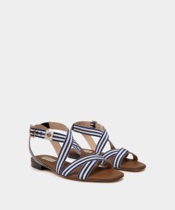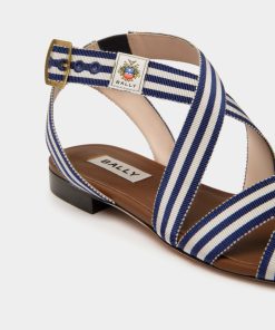 Criss-crossed straps in navy blue and white fabric define the upper of this Sylt flat sandal. A Bally Crest label in leather finishes the ankle strap, positioned to the side of the gold-tone metal buckle.