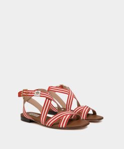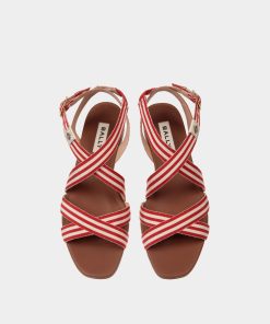 Criss-crossed straps in red and white fabric define the upper of this Sylt flat sandal. A Bally Crest label in leather finishes the ankle strap, positioned to the side of the gold-tone metal buckle.