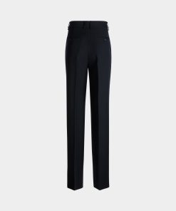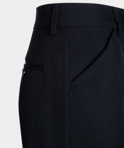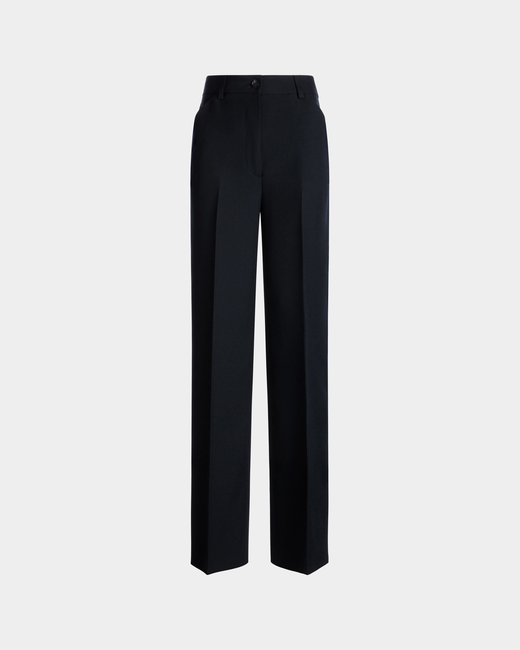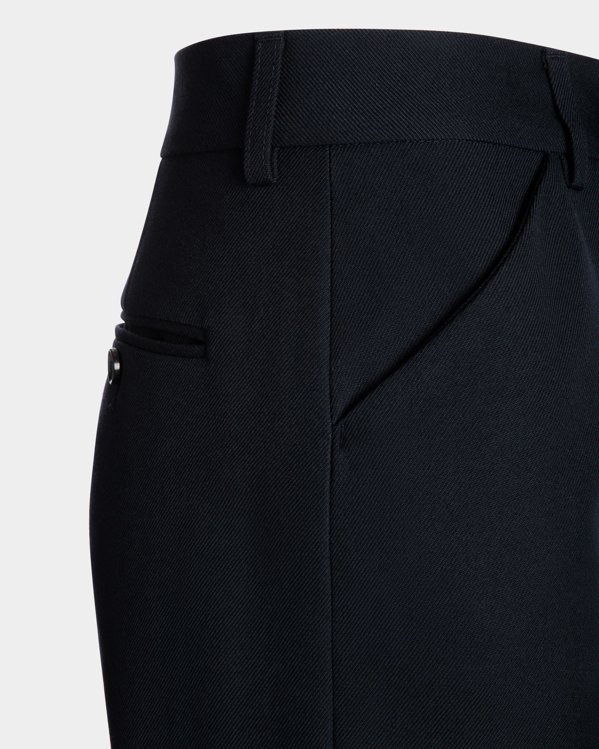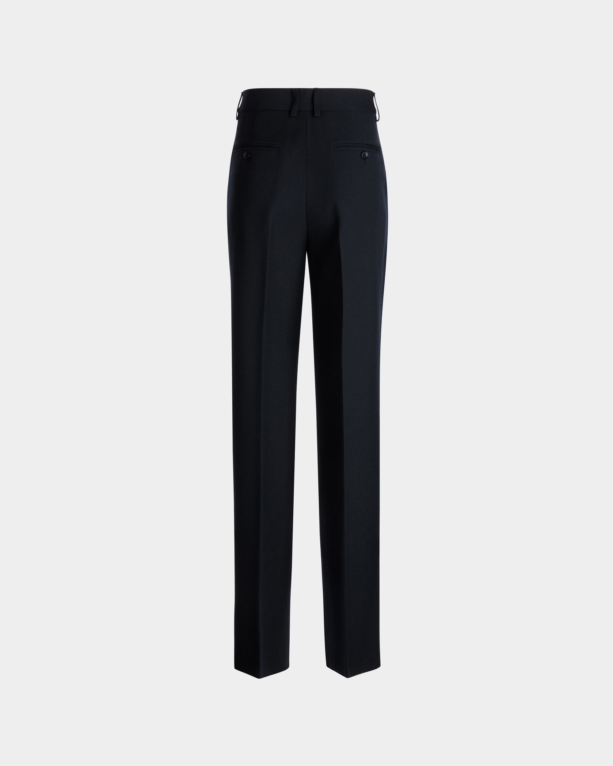 Classic tailored pants in mid-weight navy blue wool with a crease down the center of the straight leg.
