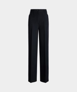 Classic tailored pants in mid-weight navy blue wool with a crease down the center of the straight leg.
