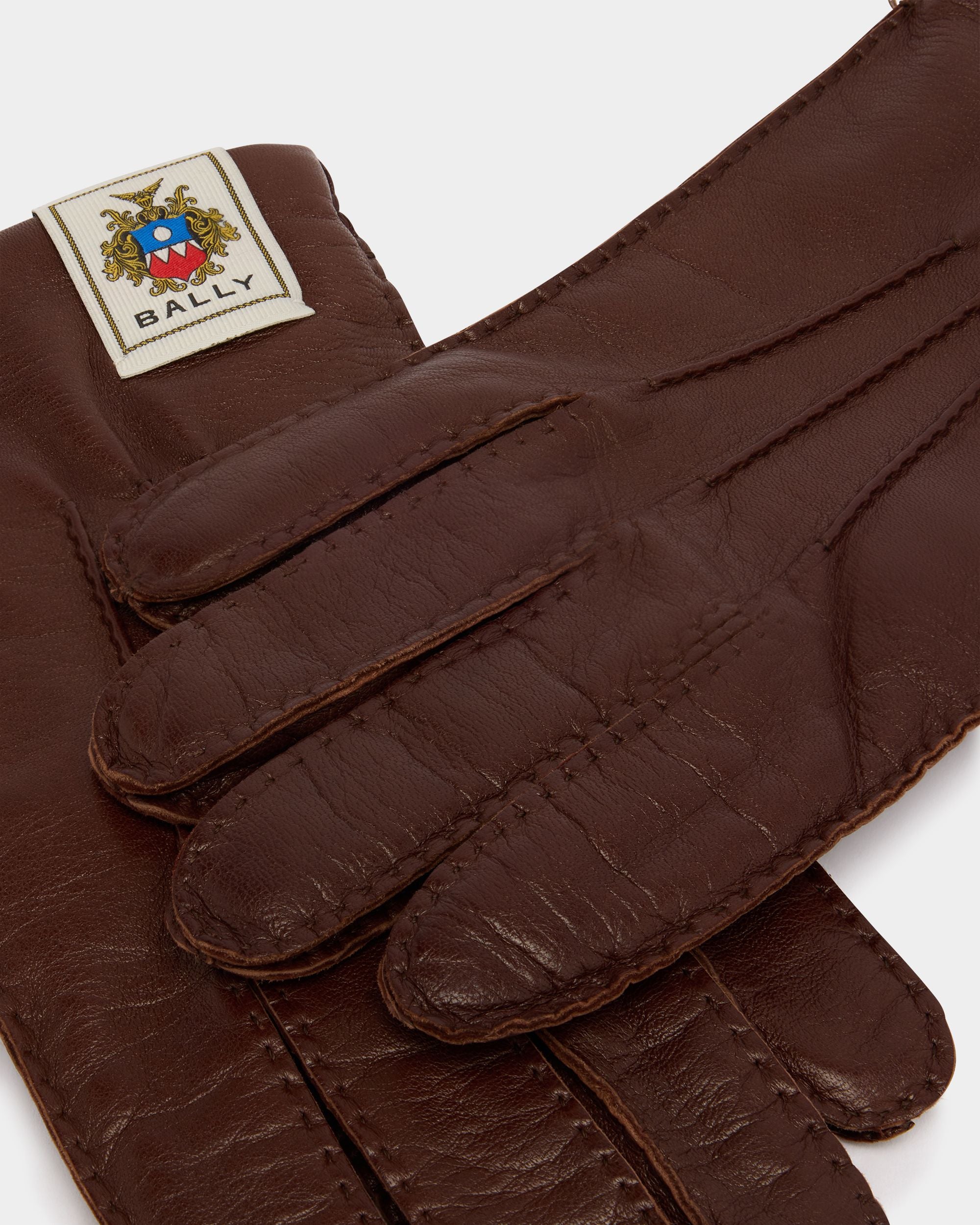 Brown leather gloves in soft lambskin with pintuck stitching and a warm cashmere lining. A Bally Crest label in grosgrain embellishes the cuff.