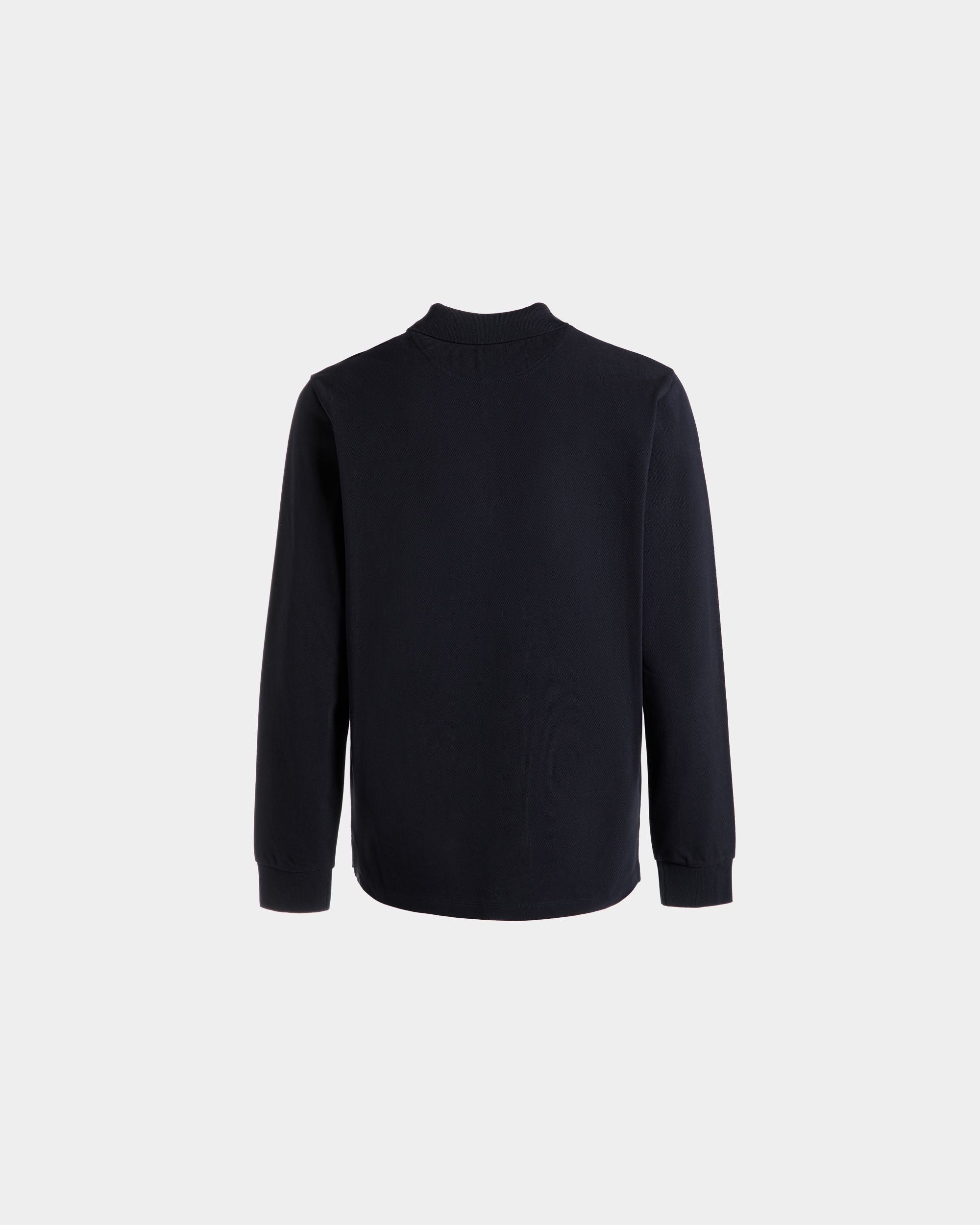 Essential in its silhouette, this long-sleeve polo shirt in navy blue piqué-knit cotton fabric is enriched by an embroidered Bally Crest and a two-button quarter placket.