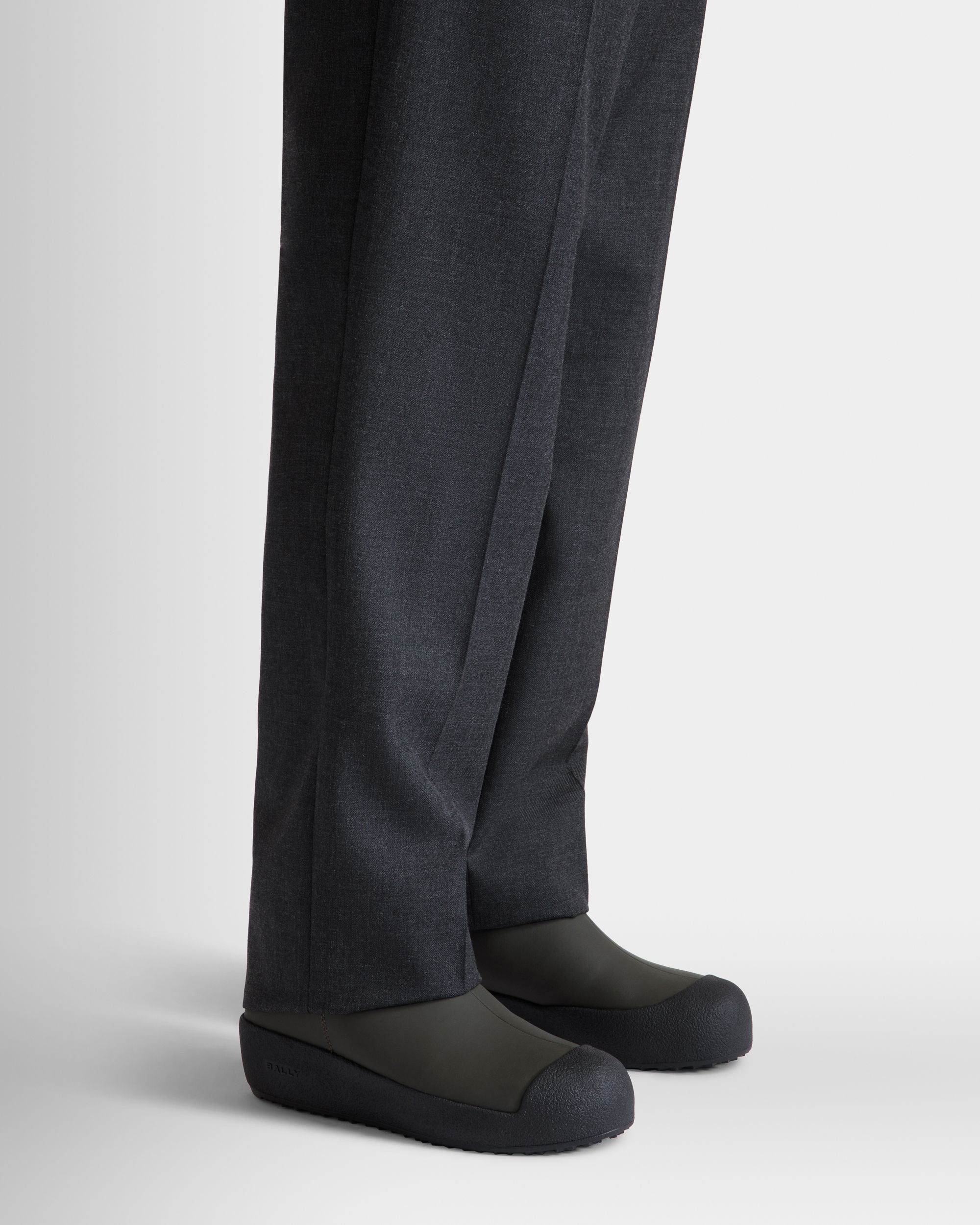 Inspired by an archival design for the Swiss Olympic team, this Curling bootie in military green rubberized leather is engineered for insulation, comfort and maximum stability. A practical zipper fastens the back.