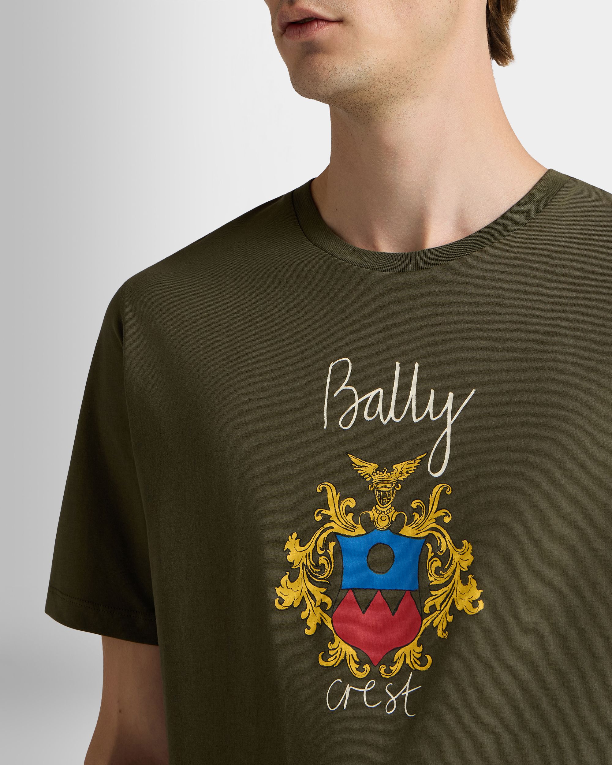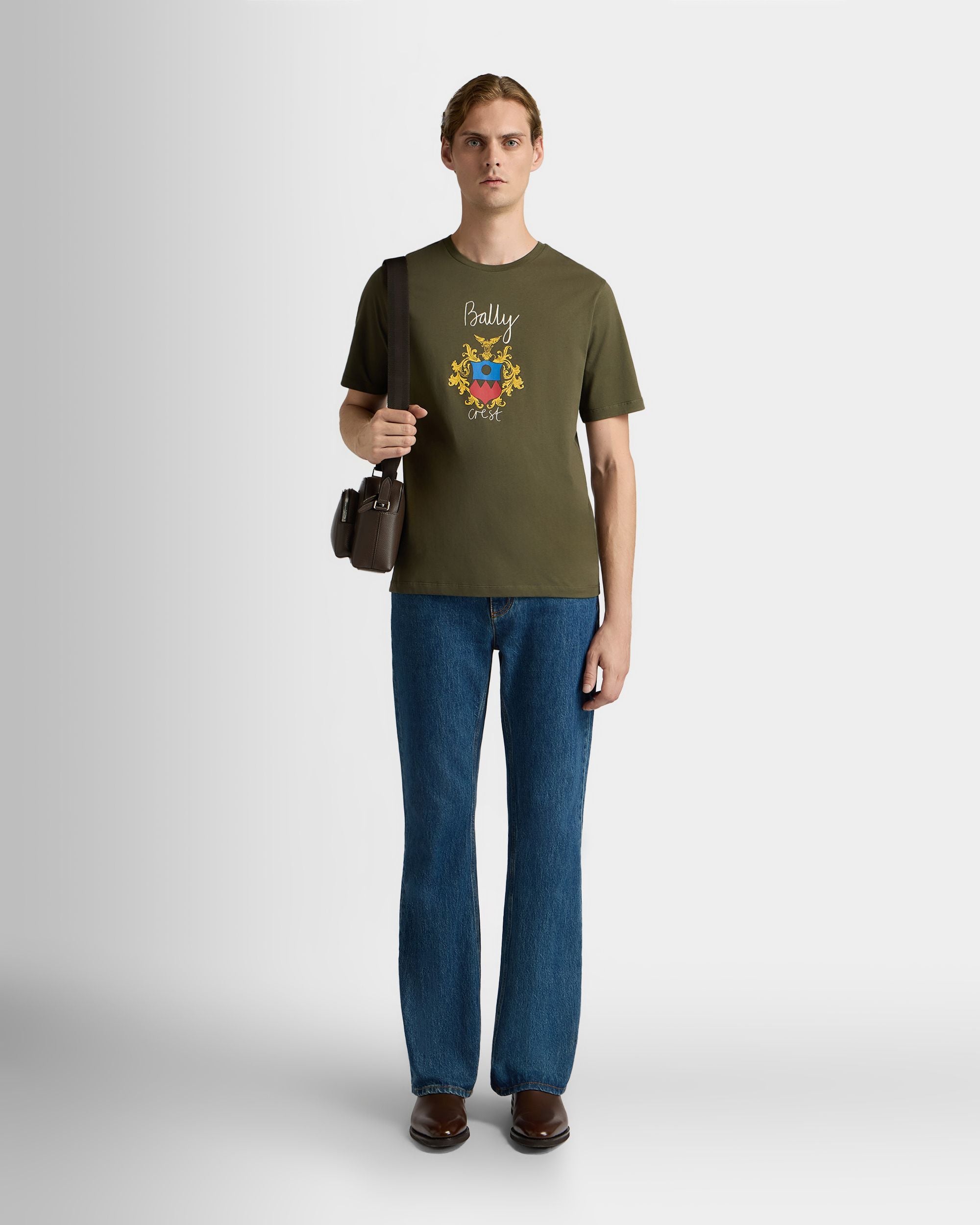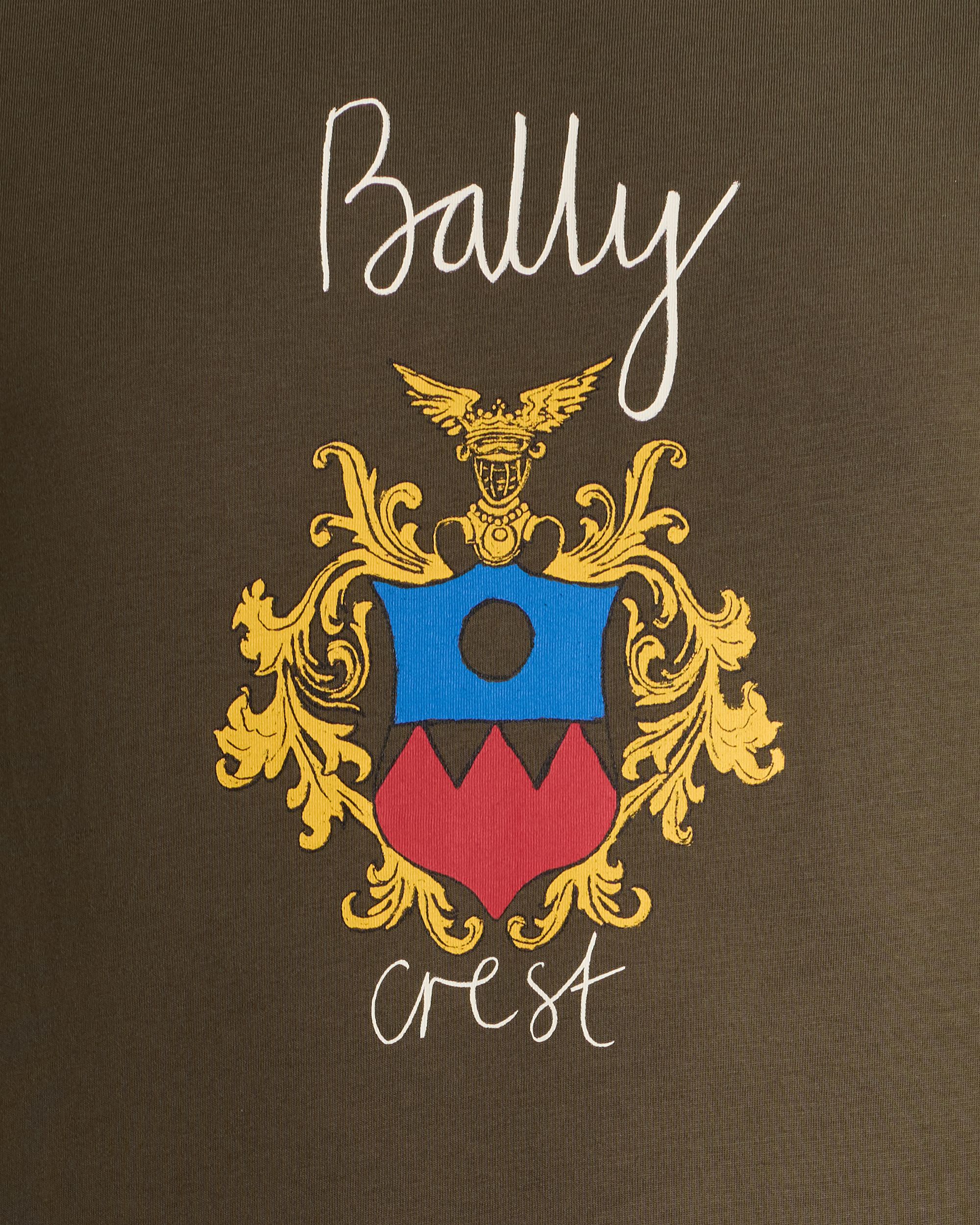 A large sketch of the Bally Crest embellishes the front of this crewneck t-shirt in military green cotton.