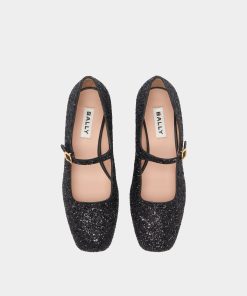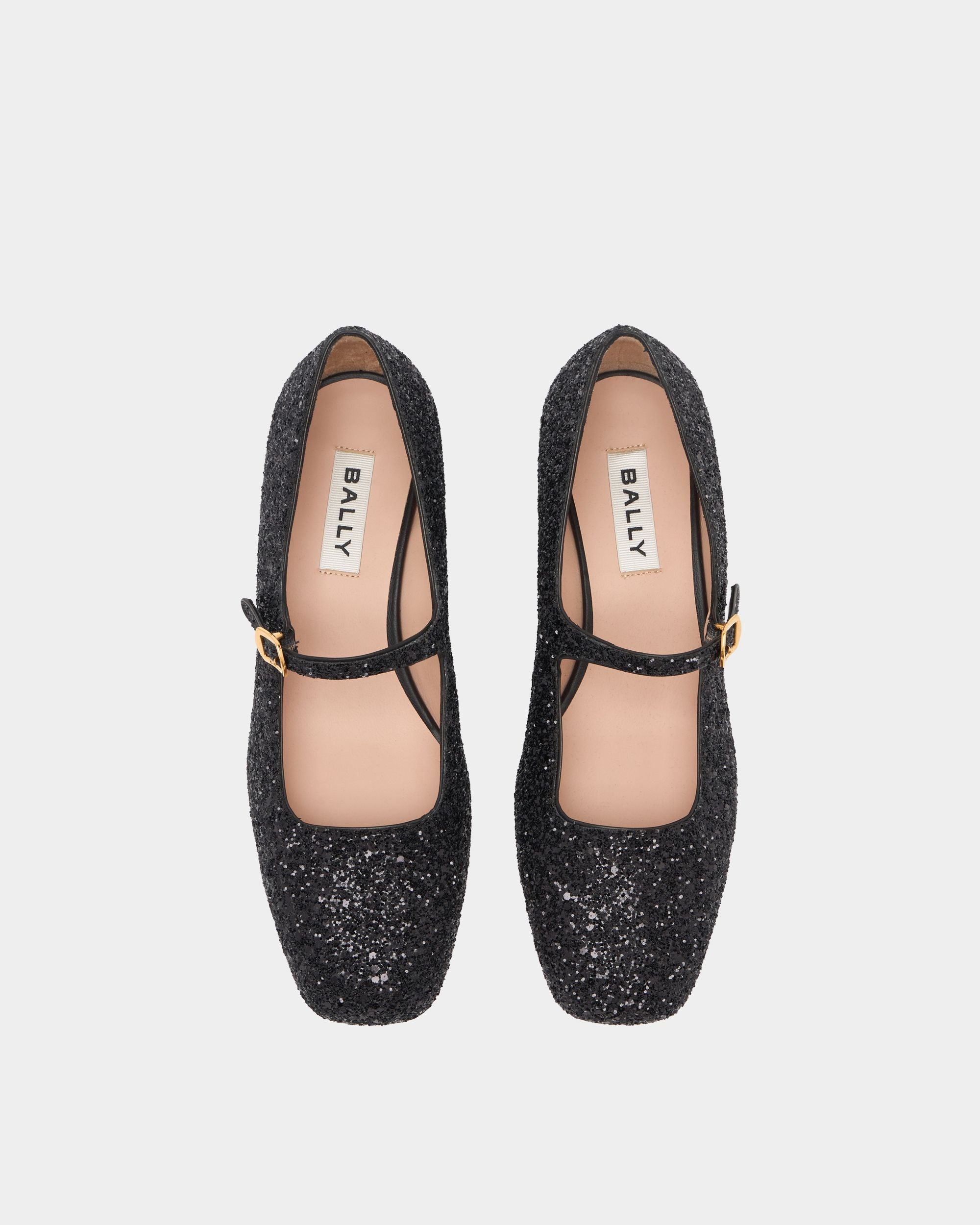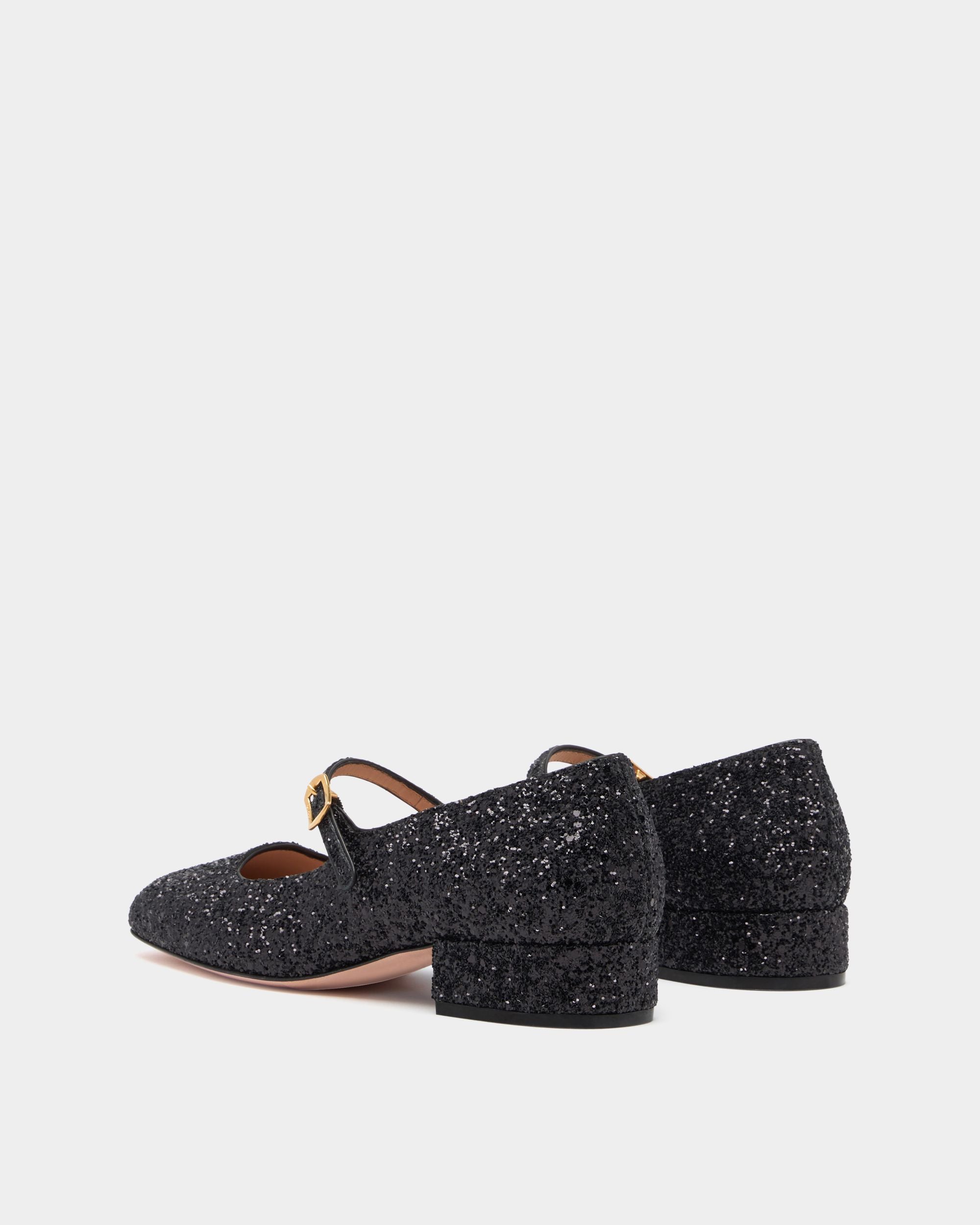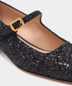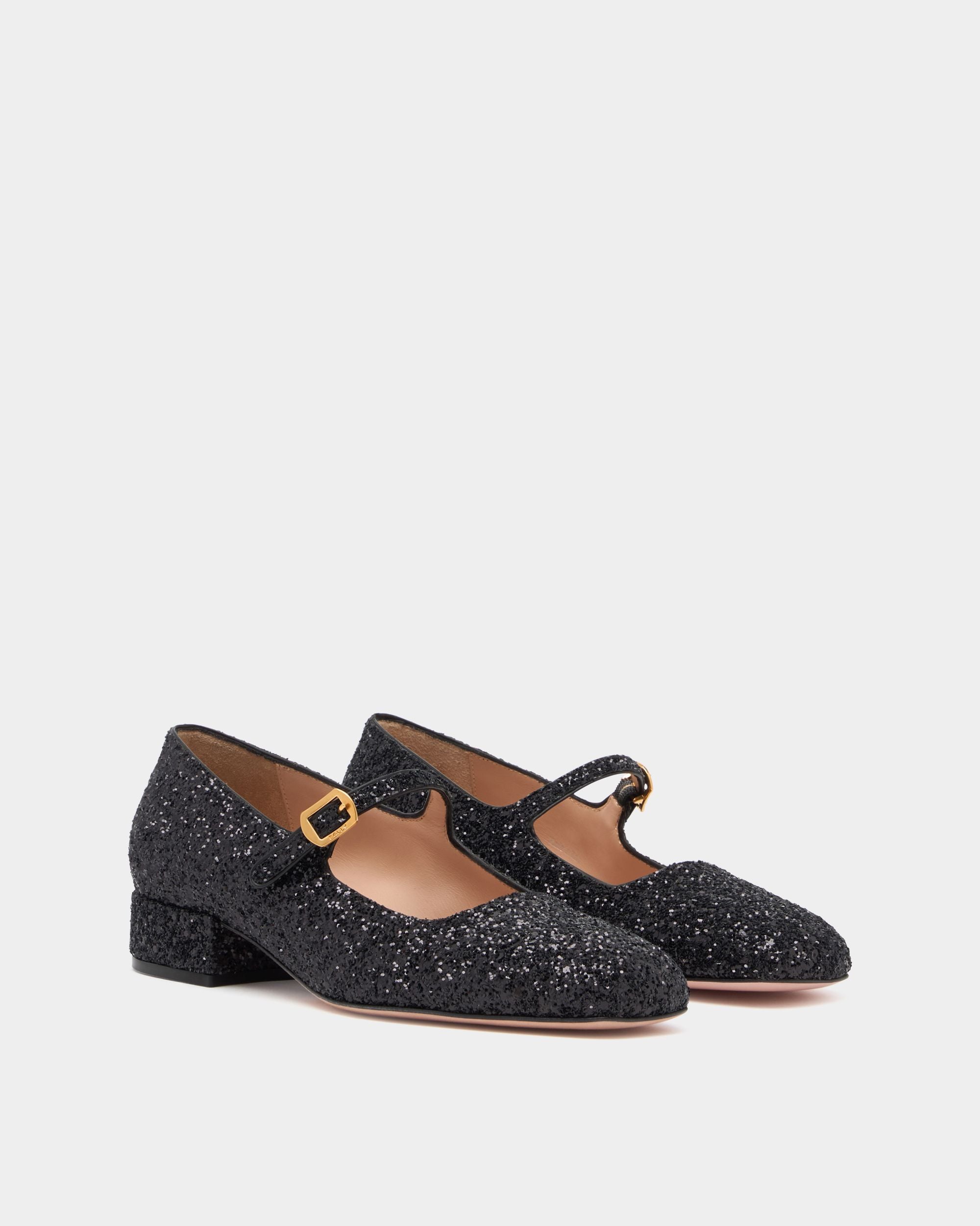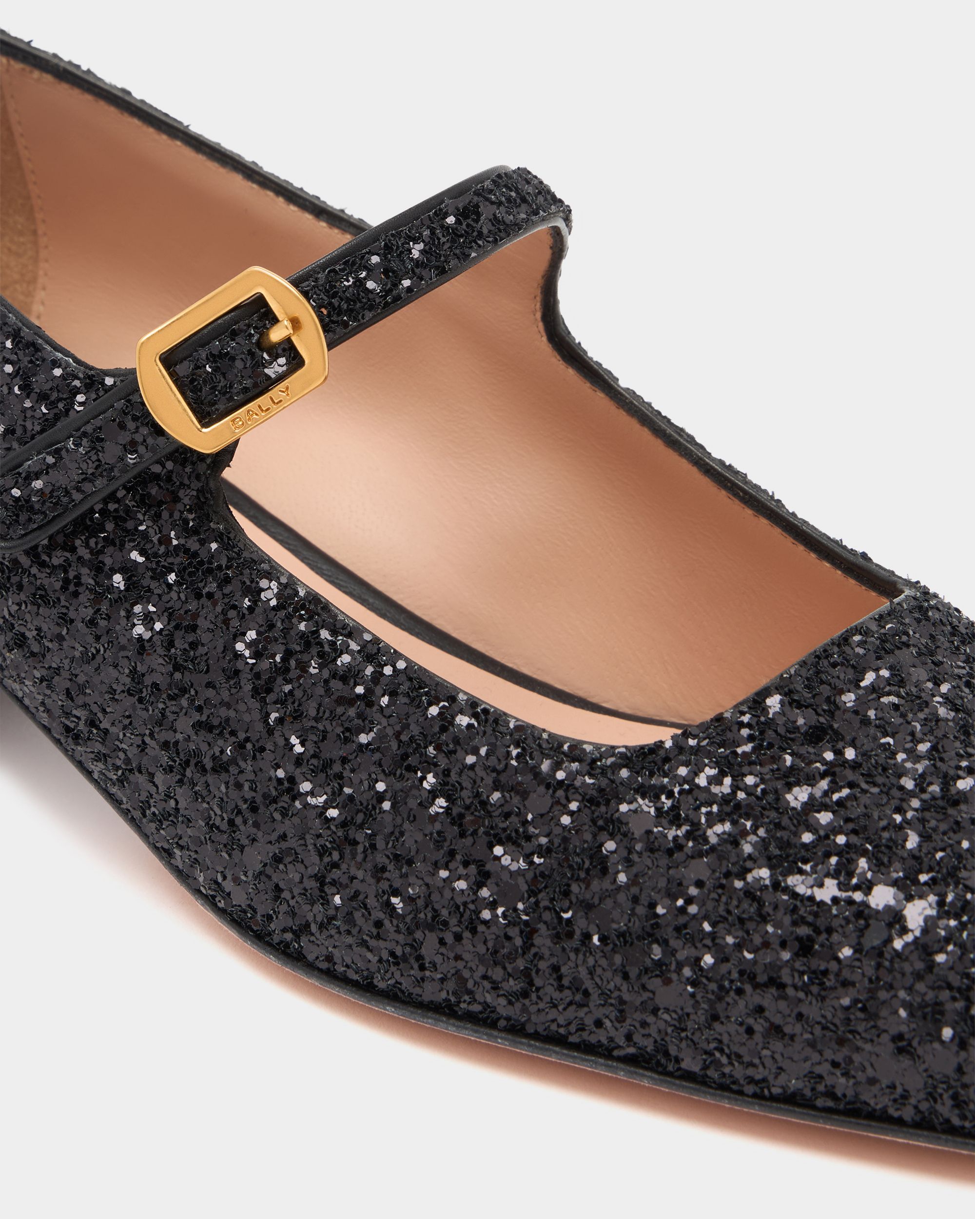 This Ballyrina block-heel pump reimagines a classic square toe silhouette with the understated sparkle of black glitter. A metal buckle inspired by hardware from the Bally archives fastens the Mary Jane strap.